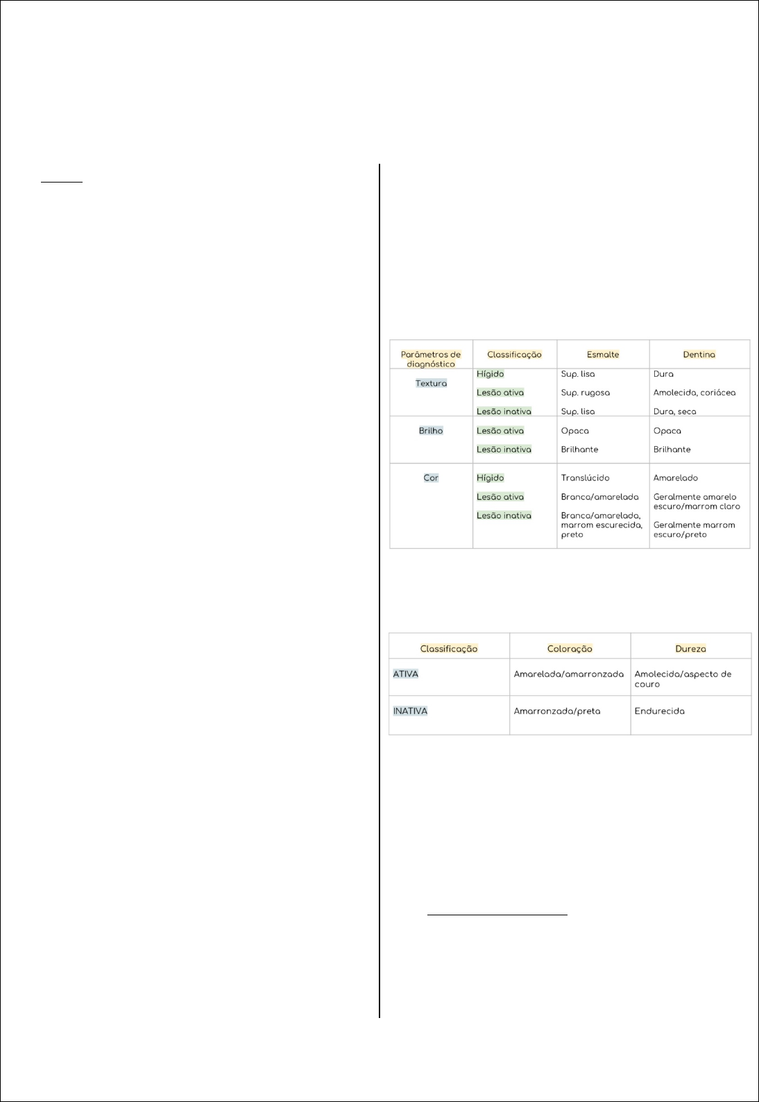 Hurian Machado – Odontologia UNIG 1 DENTÍSTICA II Aula 1 REVISÃO SOBRE CÁRIE DENTÁRIA DOENÇA CÁRIE A cárie é uma doença açúcar- dependente que resulta na perda de miligramas de minerais dos dentes afetados. É o processo de destruição dos tecidos dentários. A doença cárie promove a desmineralização da porção inorgânica (esmalte), e a degradação das substâncias orgânicas (dentina), podendo resultar na destruição completa do dente afetado quando não é tratada. O diagnóstico precoce possibilita um tratamento conservador. BIOFILME 1. Fase de aderência inicial - Colonizadores primários: Strep. Sanguinis, S. Gordonii, S. Oaralis, S. Mitis e S. Mutans. 2. Fase de acúmulo - Colonizadores secundários; - Matriz extracelular. 3. Fase “climax” - Ambiente ácido fica estabelecido, o número de microrganismos acidogênicos aumenta. MANCHA BRANCA - Não há cavidade; - É uma desmineralização superficial do esmalte; - Tratamento: higienização (profilaxia) e aplicação de flúor. CLASSIFICAÇÃO E PARÂMETROS DE DIAGNÓSTICO DA CÁRIE EM ESMALTE E DENTINA CARACTERÍSTICAS VISUAIS E TÁTEIS DE LESÕES ATIVAS E INATIVAS E CÁRIE RADICULAR LESÃO DE CÁRIE - Depende do tempo: perda de mineral inicial → aparecimento da mancha branca → cavitação. a) Cárie ativa • Aspecto em esmalte: - Mancha branca, rugosa e opacada. Hurian Machado – Odontologia UNIG 2 • Aspecto em dentina: - Tecido amolecido de cor marrom claro. b) Cárie inativa • Aspecto em esmalte: - Mancha branca, lisa e brilhante ou pigmentada. • Aspecto em dentina: - Tecido duro e escurecido. ➳ CLASSIFICAÇÃO DA CÁRIE a) Quanto a evolução do processo Pode ser aguda ou crônica. b) Quanto a sua localização no dente - Fóssulas e fissuras; - Superfícies lisas. c) Quanto ao tipo de processo carioso - Primária (tem seu início no dente hígido); - Secundária (recidivas ou recorrentes). ➳ MÉTODOS DE DIAGNÓSTICO • Clínico; • Separação temporária de dentes - Possibilita o exame direto de superfícies “escondidas” nas faces proximais; - Afastamento imediato – afastador de Elliot; - Afastamento mediato – elásticos ortodônticos (aguardar 24 a 48h). • Corantes Podem ser empregados para: - Auxiliar na visualização de lesões iniciais em esmalte; - Delimitar a existência e extensão de lesões em dentina. • Radiológico - Pode ser convencional ou digital; - Avaliação por meio de radiografias intra-orais; - A radiografia de eleição para o diagnóstico de cárie é a interproximal. • Transluminação por fibra óptica (FOTI) - Utiliza uma fonte de luz por palatino/lingual; - Quando há a presença de lesão a intensidade da luz fica modificada; - A cárie aparece como uma mancha escura. • Laser de diodo fluorescente - As perdas minerais são detectadas em relação ao tecido hígido; - Permite a avaliação de todas as faces (lisa, oclusal e proximal); - Escala numérica de 0 a 99%; - Apresenta grande incidência de diagnóstico falso-positivos; - A experiência clínica ainda é bastante limitada. • Quantificação da fluorescência induzida por luz (QLF) - Estrutura dental apresenta fluorescência quando iluminada por fonte e luz ultravioleta; - Fluorescência menor nas áreas em que há perda mineral (manchas escuras na imagem); - Permite a detecção de lesões de cárie em estágio inicial; - Método limitado para lesões mais profundas. Hurian Machado – Odontologia UNIG 3 Figura 3. Lesão cariosa de score 2. Figura 4. Lesão cariosa de score 3. Figura 5. Lesão cariosa de score 4. • Medição da resistência elétrica (ECM) - Explora a propriedade do tecido cariado de apresentar uma condutividade elétrica maior que o tecido sadio; - Desmineralização do esmalte → Porosidade → Preenchimento com saliva → Caminho para corrente elétrica; - Imagens fluorescentes capturadas e analisadas por software; - Menor fluorescência, maior desmineralização do tecido dentário. ➳ ICDAS – International Caries Detection & Assessment System (2002) O Sistema Internacional de Detecção e Avaliação de Cárie (ICDAS, do inglês International Caries Detection and Assessment System) é um sistema de escores baseado na inspeção visual. O ICDAS preconiza que, primeiramente, o profissional determine, após limpeza e secagem, se o dente é hígido, selado, restaurado, com coroa ou ausente. Em um segundo momento, as superfícies devem ser classificadas em relação à cárie, usando uma escala ordinal, que vai da superfície hígida à cavitação extensa (score 0-6). O exame deve ser feito inicialmente com o dente úmido e, então, após 5s de secagem, o dente deve ser reexaminado. • SCORE 0 - Não há evidência de cárie após secagem com jato de ar por 5s. • SCORE 1 - Mudança inicial visível em esmalte. • SCORE 2 - Mudança visual no esmalte. • SCORE 3 - Descontinuidade do esmalte, sem dentina visível. • SCORE 4 - Sombreamento da dentina subjacente. Figura 1. Score 0. Figura 2. Lesão cariosa de score 1. Hurian Machado – Odontologia UNIG 4 Figura 8. Lesão por erosão ou biocorrosão. Figura 6. Lesão cariosa de score 5. Figura 7. Lesão cariosa de score 6. • SCORE 5 - Cavidade nítida com dentina visível. • SCORE 6 - Cavidade extensa com dentina visível. ➳CONCLUSÃO - Não existe um método de detecção de cárie ideal; - Os métodos tradicionais ainda são os mais utilizados; - Os métodos avançados permitem a detecção de cárie em seu estágio mais precoce, fato que possibilita um tratamento conservador; - A cárie ativa não tratada pode levar a destruição total do elemento dentário. Aula 2 LESÕES CERVICAIS NÃO CARIOSAS (LCNC) As lesões cervicais não-cariosas possuem causa etiológica não-bacteriana e possuem caráter multifatorial. Se caracterizam pelo desgaste da estrutura dentária, comprometendo a região coronária e radicular, e são classificadas em: abrasão, erosão, abfração e atrição. 1. EROSÃO OU B