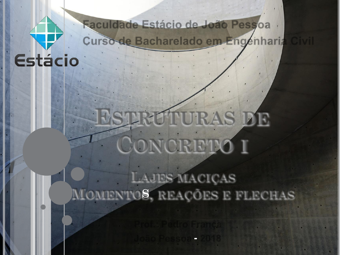 Faculdade Estácio de João Pessoa Curso de Bacharelado em Engenharia Civil ESTRUTURAS DE CONCRETO I Prof.: Pedro França João Pessoa - 2018 LAJES MACIÇAS MOMENTOS, REAÇÕES E FLECHAS MOMENTOS FLETORES Os momentos fletores e as flechas nas lajes maciças são determinadas conforme a laje é armada em uma ou em duas direções; As lajes armadas em uma direção são calculadas como vigas segundo a direção principal e as lajes armadas em duas direções podem ser aplicadas diferentes teorias. MOMENTOS FLETORES Laje armada em uma direção; Considera-se simplificadamente que a flexão na direção do menor vão da laje é preponderante à da outra direção, de modo que a laje será suposta como uma viga com largura constante de um metro (100 cm); Na direção secundária desprezam-se os momentos fletores existentes. MOMENTOS FLETORES Equações para cálculo das reações de apoio, momentos fletores máximos e flechas imediatas, para carregamento uniformemente distribuído: MOMENTOS FLETORES Equações para cálculo das reações de apoio, momentos fletores máximos e flechas imediatas, para carregamento uniformemente distribuído: MOMENTOS FLETORES Equações para cálculo das reações de apoio, momentos fletores máximos e flechas imediatas, para carregamento uniformemente distribuído: MOMENTOS FLETORES As lajes em balanço, como as lajes de marquises e varandas, são também casos típicos de lajes armadas em uma direção, que devem ser calculadas como viga segundo a direção do menor vão: MOMENTOS FLETORES Laje armada em duas direções; O comportamento das lajes armadas em duas direções, apoiadas nos quatro lados, é bem diferente das lajes armadas em uma direção, de modo que o seu cálculo é bem mais complexo se comparado ao das lajes armadas em uma direção; MOMENTOS FLETORES Laje armada em duas direções; Se a laje estiver ligada a vigas de concreto ou se existirem pilares nos cantos, o levantamento da laje fica impedido, o que faz surgir momentos fletores nos cantos, negativos, que causam tração no lado superior da laje na direção da diagonal, e positivos na direção perpendicular à diagonal, que causam tração no lado inferior da laje.; MOMENTOS FLETORES Laje armada em duas direções; MOMENTOS FLETORES Laje armada em duas direções; Os esforços solicitantes e as deformações nas lajes armadas em duas direções podem ser determinados por diferentes teorias, sendo as mais importantes as seguintes: Teoria das Placas: desenvolvida com base na Teoria da Elasticidade – podem ser determinados os esforços e as flechas em qualquer ponto da laje Processos aproximados; Método das Linhas de Ruptura ou das Charneiras Plásticas; Métodos Numéricos, como o dos Elementos Finitos, de Contorno, etc. MOMENTOS FLETORES Laje armada em duas direções; A Teoria das Placas, desenvolvida com base na teoria matemática da elasticidade, onde o material é elástico linear (vale a Lei de Hooke), homogêneo e isótropo, proporciona a equação geral das placas: w = deslocamento vertical da placa p = carregamento na placa; D = rigidez da placa à flexão, dada por. MOMENTOS FLETORES Laje armada em duas direções; A solução da equação geral das placas é tarefa muito complexa, o que motivou o surgimento de diversas tabelas, de diferentes origens e autores, com coeficientes que proporcionam o cálculo dos momentos fletores e das flechas para casos específicos de apoios e carregamentos; Há diversas tabelas de autores como: Czerny, Stiglat/Wippel, Bares, Szilard, etc.; No nosso curso serão utilizadas as tabelas desenvolvidas por Barés (1972) e adaptadas por Libâneo Pinheiro (1994); MOMENTOS FLETORES Tabelas para laje armada em duas direções; MOMENTOS FLETORES Tabelas para laje armada em duas direções; MOMENTOS FLETORES Tabelas para laje armada em duas direções; MOMENTOS FLETORES Laje armada em duas direções; Conforme as tabelas de Barés, os momentos fletores, negativos ou positivos, são calculados pela expressão; M = momento fletor (kN.m/m); μ = Coeficiente tabelado, de acordo com cada tipo de laje e em função de λ = ly/lx, sendo: μx e μy= coeficientes para cálculo dos momentos fletores positivos atuantes nas direções paralelas a lx e ly, respectivamente p = valor da carga uniforme ou triangular atuante na laje (kN/m²) lx = menor vão da laje (m) COMPATIBILIZAÇÃO DE MOMENTOS FLETORES Ao se considerar as lajes de um pavimento isoladas umas das outras, os momentos fletores negativos em uma borda comum a duas lajes contíguas são geralmente diferentes; A NBR 6118 (item 14.7.6.2) permite que seja feita uma compatibilização dos momentos fletores negativos; Há muitos anos está consolidada na prática brasileira um método de compatibilização, onde o momento fletor negativo (X) de duas lajes adjacentes é tomado como; sendo COMPATIBILIZAÇÃO DE MOMENTOS FLETORES REAÇÕES DE APOIO Assim como no cálculo dos momentos fletores solicitantes e das flechas, no cálculo das reações da laje nas bordas, as lajes serão analisadas em função de serem armadas em uma ou em duas direções; No caso das lajes armadas em uma direção, considera-se que as cargas na laje caminhem para as vigas nas bordas perpendiculares à direção principal da laje; REAÇÕES DE APOIO Nas outras vigas, caso existirem, pode-se considerar, a favor da segurança, uma carga referente à área do triângulo adjacente à viga; A carga linear da laje na viga, em função da área do triângulo, pode ser considerada como; REAÇÕES DE APOIO Para lajes armadas em duas direções, A NBR 6118 (item 14.7.6.1) prescreve; “Para o cálculo das reações de apoio das lajes maciças retangulares com carga uniforme podem ser feitas as seguintes aproximações: a) as reações em cada apoio são as correspondentes às cargas atuantes nos triângulos ou trapézios determinados através das charneiras plásticas correspondentes à análise efetivada com os critérios de 14.7.4, sendo que e