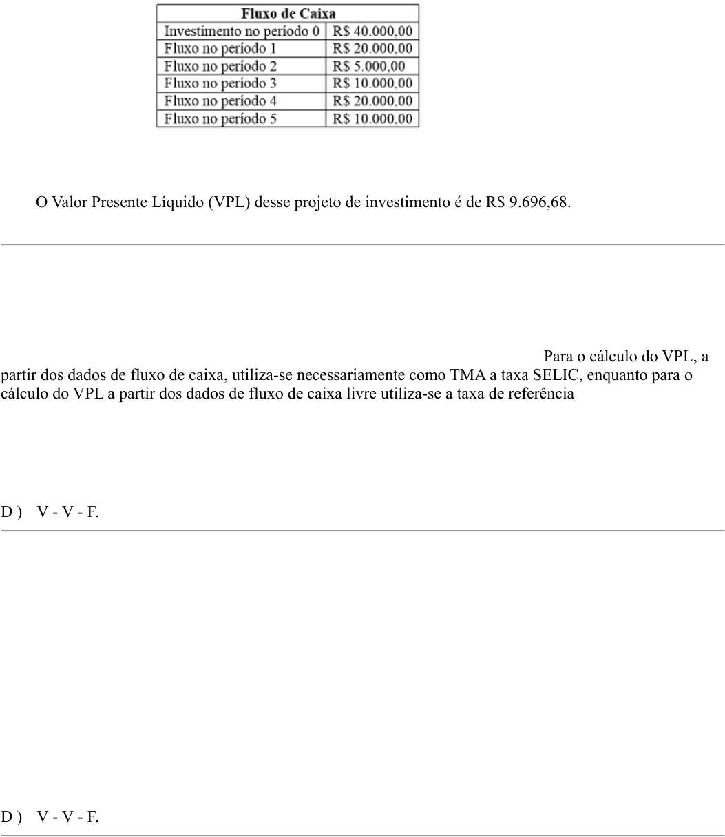 Avaliação II - Individual (Cod.:825987) Código da prova: 66331421 Disciplina: Análise de Investimentos (ECN11) Período para responder: 06/06/2023 - 21/06/2023 Peso: 1,50 1 - O Restaurante Panela de Barro Ltda. está analisando a perspectiva de investir na reforma de sua cozinha, o que permitirá elevar o número de clientes atendidos. O fluxo de caixa incremental decorrente do investimento está estimado na tabela apresentada a seguir. Determine o Valor Presente Líquido (VPL) desse fluxo de caixa para a taxa de desconto (TMA - Taxa Mínima de Atratividade) de 10% ao ano e assinale a alternativa CORRETA: A ) O Valor Presente Líquido (VPL) desse projeto de investimento é de R$ 10.946,68. B ) O Valor Presente Líquido (VPL) desse projeto de investimento é de R$ 10.315,20. C ) O Valor Presente Líquido (VPL) desse projeto de investimento é de R$ 9.696,68. D ) O Valor Presente Líquido (VPL) desse projeto de investimento é de R$ 11.591,48. 2 - Para a tomada de decisões de investimentos são mensurados os fluxos de caixa livres enquanto as decisões de financiamento são norteadas pela taxa mínima de atratividade. Sobre os conceitos de fluxo de caixa e fluxo de caixa livre, classifique V para as sentenças verdadeiras e F para as falsas: ( ) O fluxo de caixa representa o fluxo de dinheiro entrando e saindo de um negócio durante um certo período de tempo. ( ) O fluxo de caixa livre representa a quantidade de dinheiro disponível em uma empresa que sobra após todos os gastos serem quitados. É considerado o valor atual em dinheiro da empresa. ( ) Para o cálculo do VPL, a partir dos dados de fluxo de caixa, utiliza-se necessariamente como TMA a taxa SELIC, enquanto para o cálculo do VPL a partir dos dados de fluxo de caixa livre utiliza-se a taxa de referência. Assinale a alternativa que apresenta a sequência CORRETA: A ) F - F - V. B ) F - V - F. C ) V - F - F. D ) V - V - F. 3 - Os indicadores financeiros podem ser subdivididos entre aqueles associados à criação de riqueza e aqueles relacionados ao risco de realizar determinado investimento. Sobre os indicadores de risco, classifique V para as sentenças verdadeiras e F para as falsas: ( ) Uma forma de analisar o risco de empreender em determinado projeto, ou seja, empreender ou rejeitar um projeto, é comparar a taxa interna de retorno com a taxa mínima de atratividade. Neste sentido, se TIR > TMA então o projeto é economicamente viável. ( ) Pelo método do payback a tomada de decisão para aceitar ou rejeitar um projeto se dá comparando o período de retorno calculado com o período máximo aceitável para o investidor recuperar o capital investido. ( ) O risco não tem nenhuma associação ao prazo para o retorno dos investimentos dos feitos. Desta forma, pouco importa o prazo de retorno na análise de um projeto. Assinale a alternativa que apresenta a sequência CORRETA: A ) F - V - F. B ) F - F - V. C ) V - F - F. D ) V - V - F. 4 - Suponha que uma empresa produtora de energia esteja pensando em expandir com a construção de uma nova instalação. O projeto de pesquisa apresentado internamente é de um investimento inicial de usuario Realce usuario Realce usuario Realce usuario Realce R$100.000,00, com retornos futuros iguais a R$50.000,00 para o primeiro ano, R$40.000,00 para o segundo e R$30.000,00 para o terceiro ano. Tendo como taxa mínima de atratividade (TMA) a taxa SELIC de 4,5%, a partir do método da taxa interna de retorno (TIR), classifique V para as sentenças verdadeiras e F para as falsas: ( ) Como a TIR < TMA indica que a empresa não deve fazer inversões neste projeto e investir em ativos cujo retorno são 100% atrelados a SELIC. ( ) Como a TIR = TMA então os gestores desta empresa devem indicar que tanto faz investir no projeto quanto em ativos 100% atrelados à SELIC. ( ) Como a TIR > TMA indica que a empresa deve fazer inversões neste projeto ao invés de investir em ativos cujo retorno são 100% atrelados à SELIC. Assinale a alternativa que apresenta a sequência CORRETA: A ) V - F - F. B ) F - F - V. C ) V - V - F. D ) F - V - F. 5 - O capital de uma empresa é constituído do capital de terceiros e do capital próprio. Independentemente da origem dos recursos, estes terão de ser remunerados. Sobre os aspectos conceituais dos custos do capital, analise as afirmativas a seguir: I- O custo do capital de terceiros é o retorno exigido pelos proprietários da empresa com relação ao investimento por eles efetuados. II- O prêmio de risco é quanto um investimento com risco rende mais do que um investimento considerado sem risco. III- O custo de capital próprio é o retorno exigido pelos credores de dívida de uma empresa. Desta forma, representa a remuneração que a empresa paga para instituições financeiras nos empréstimos obtidos. Assinale a alternativa CORRETA: A ) Somente a afirmativa II está correta. B ) As afirmativas II e III estão corretas. C ) Somente a afirmativa III está correta. D ) As afirmativas I e II estão corretas. 6 - Os custos de transação são classificados em "ex-ante" e "ex-post". Os custos "ex-ante" estão relacionados ao custo de redigir (preparar), negociar e estabelecer salvaguardas em um contrato, enquanto os custos "ex- post" estão relacionados ao monitoramento, adaptação e renegociação das novas realidades ocorridas durante a execução do contrato. Quanto aos custos que estão relacionados aos "ex-post", analise as seguintes afirmativas: I- Custos relacionados às providências para resolver os desvios ocorridos ao longo da execução do contrato. II- Custos resultantes dos novos arranjos oriundos da solução dos conflitos contratuais. III- Custos das atividades de planejamento necessárias, executadas anteriormente à fase de negociação propriamente dita do contrato. Assinale a alternativa CORRETA: A ) As afirmativas I e III estão corretas. B ) Somente a afirmativa I está correta. C ) As afirmativas I e II estão corretas. D ) Somente a