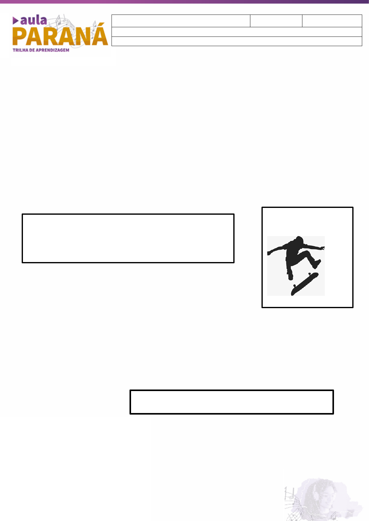 Olá, estudante! Para ajudar em seus estudos, você está recebendo o resumo dos conteúdos das aulas 26 e 27. Bons Estudos! Vamos conhecer o Skate, sua origem e história, a sua evolução e a relação social com o meio. Você conhece skate? Onde e como o skate pode ser praticado? Tem ou já teve alguma experiência com a prática do skate? A famosa prancha de madeira com rodas é conhecida no Brasil como skate, mas, nos Estados Unidos, ela é chamada de skateboard (significa patins numa prancha). Não se sabe ao certo como e quando o skate surgiu. Uma das teorias diz que o nascimento ocorreu nos Estados Unidos, em meados do século XX, possivelmente derivado dos rollers scooters, uma espécie de patinete fabricado a partir de 1900. Outra teoria diz que os skates surgiram ainda antes dessa data, a partir de patins desmontados, cujas rodas eram fixadas em caixotes ou pranchas de madeira. No final dos anos 50, na falta de ondas nas praias da Califórnia, surfistas tentavam imitar as manobras de surfe usando rodas e eixos montados em pranchas de madeira. A partir daí, o skate se populariza cada vez mais e se transformou no esporte que hoje conhecemos. Nos anos 60, surfistas norte-americanos trouxeram o skate ao Brasil. Em 1974 foi realizado o primeiro campeonato no Rio de Janeiro. Primeira pista da América Latina, em Nova Iguaçu/RJ. Em 1976, começam a aparecer as primeiras pistas de skate. Mas, houve um declínio após este período, porém, a partir dos anos 80, a modalidade voltou com tudo! Em 1997, Robert Dean da Silva, o Bob Burnquist, foi eleito o melhor skatista do mundo. Em 2000 é criada a Confederação Brasileira de Skate (CBSk), que impulsionou a proliferação de pistas e o aparecimento de praticantes. A modalidade street se tornou uma das mais fortes, pois os praticantes não necessitam de pistas para praticar. Com isso, as manobras também evoluíram. PARTES DO SKATE O skate é um esporte realizado em uma prancha, chamada shape, com quatro rodas pequenas e dois eixos chamados de “trucks”. A frente recebe o nome de nose. A traseira recebe o nome de tail. MODALIDADES DO SKATE: Freestyle: manobras feitas em sequência, no chão. Downhill: modalidade de descida, e se subdivide em: Downhill Speed ou Stand-Up, Downhill slid, Longboard. • Downhill Speed ou Stand-Up: descida de ladeiras, na maior velocidade possível. • Downhill Slide: descida de ladeiras em alta velocidade, realizando manobras de derrapagem • Longboard: é praticada com skates maiores, com 40 polegadas, onde o praticante realiza manobras de Slide. Vertical - praticada em pista variável. As manobras podem ser aéreas ou deslizando pela borda metálica da pista. Street (skate de rua) - modalidade mais praticada em todo o mundo. Os bancos, corrimões e escadas também são utilizados como obstáculos para as manobras. Mini-rampas – praticado em rampa que mistura os estilos Street e Vertical (paredes pouco inclinadas) CATEGORIAS COMPETIÇÕES Street: circuito com obstáculos. Half Pipe: rampa em formato de U. ITENS DE SEGURANÇA: cotoveleiras, luva, capacete, joelheiras. PRINCIPAIS MANOBRAS: ollie, kickflip, hardflip, nosegrind. Agora que você já sabe um pouco mais sobre o skate, responda o exercício abaixo: O skate é uma atividade corporal de aventura e, a partir de 2021, será um esporte olímpico. Quais provas serão disputadas nos Jogos Olímpicos e como o Brasil será representado? SE PRECISAR, USE O VERSO DA FOLHA PARA RESPONDER OU FAÇA EM UMA OUTRA FOLHA, MAS LEMBRE DE COLOCAR O SEU NOME E ENTREGAR NA SUA ESCOLA. EDUCAÇÃO FÍSICA 7º Ano SEMANA 17 ESCOLA/COLÉGIO: ESTUDANTE: Você sabia que a modalidade de Skate, faz parte dos Jogos Escolares do Paraná!? https://bit.ly/34WGa0s SKATE NOS JOGOS OLÍMPICOS: Tóquio 2020/2021 – será a primeira participação do skate em uma edição dos Jogos Olímpicos. Será disputado nas provas de Street e de Park. O Brasil terá 12 representantes, três no masculino e três no feminino, em cada uma das modalidades. As manobras são avaliadas por juízes que atribuem notas, considerando a dificuldade e a desenvoltura das manobras realizadas.