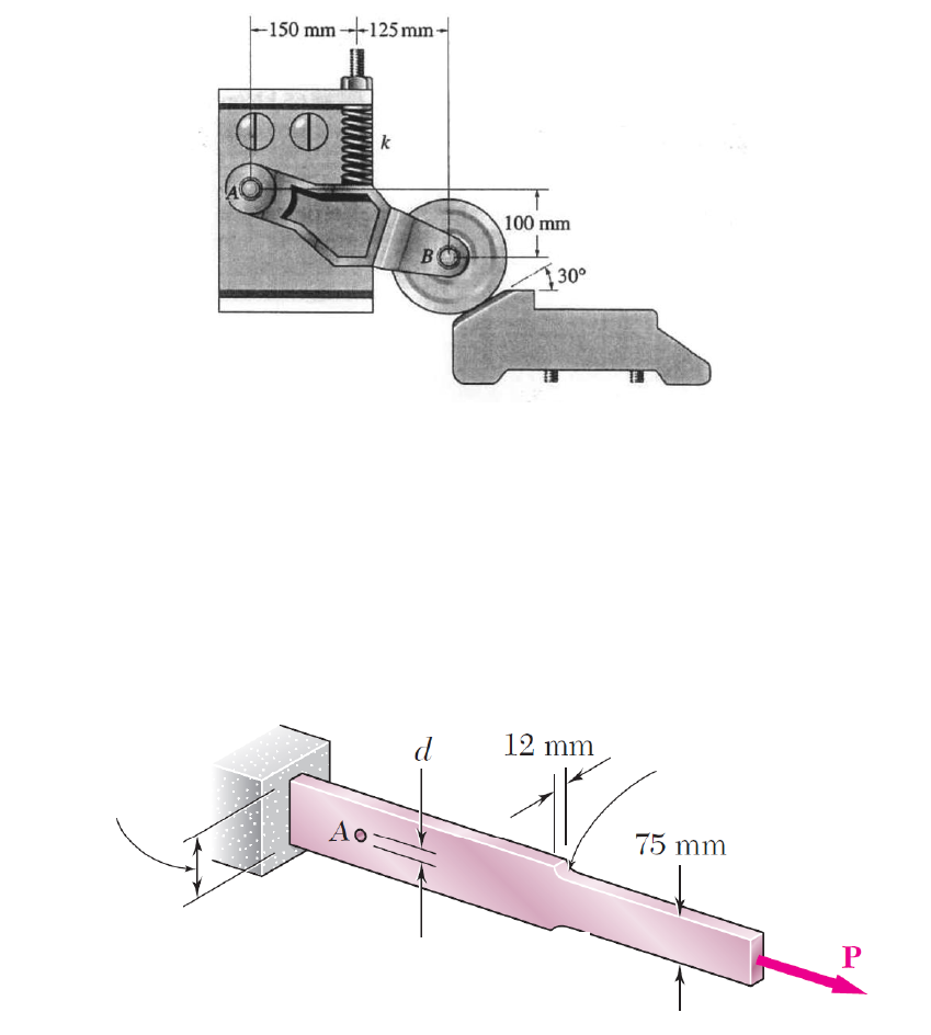 AD1 -2022/1 - Resistência dos Materiais - Engenharia de Produção 1) O dispositivo mostrado na figura abaixo é usado para manter a porta de um elevador aberta. Se a mola tem rigidez de k = 1300N/m e está comprimida 0,16m, determine os menores valores admissíveis para os diâmetros dos pinos A e B sabendo-se que a tensão de cisalhamento média nos pinos não pode ser superior a 65 MPa (valor - 2,0). 2) A placa apresentada abaixo está submetida a uma carga axial P = 85 kN e apresenta um furo com um diâmetro de 15 mm. Determine (a) tensão normal máxima na placa mostrada; (b) se não existisse o furo d na placa, qual a maior força P que pode ser aplicada se a tensão admissível for de 200 MPa (valor - 2,0). 180 mm rf = 10,5 mm B 3) Para uma barra composta por duas seções cilíndricas AB e BC de aço (E= 200 GPa), determine (a) o valor de Q de modo que o deslocamento em A seja zero, (b) o correspondente deslocamento em B e (c) as tensões nas barras AB e BC. O valor do módulo de P é 6,5 kN (valor - 2,0). 4) Uma barra composta por duas seções cilíndricas: AB de aço (E= 200 GPa, α = 11,7 x 10-6/ºC) e BC de alumínio (E= 70 GPa, α = 23,6 x 10-6/ºC) é engastada em A e apresenta uma folga de 1,5 mm em D. A barra AB apresenta comprimento de 650 mm e diâmetro 80 mm e a BC de 450 mm de comprimento e diâmetro de 60 mm. Sabendo-se que a barra inicialmente está sem tensão (temperatura de 25 ºC), determine: a) máxima variação de temperatura para que a tensão normal na barra de alumínio não seja superior a 50 MPa e b) o correspondente deslocamento no ponto B. (valor - 2,0) 5) Suponha que a viga ABC é rígida (em comparação com a barra BD). Dimensione os três pinos e determine a espessura mínima da barra BD. (valor - 2,0) - Barra BD: 20 mm de largura; Sy= 250 MPa - Pinos A, B e D: 𝑆𝑦 𝑐𝑖𝑠= 180 MPa - g = 9,81 m/s2; FS = 3,0 Obs: As cotas estão em m. m = 250 kg 1,35