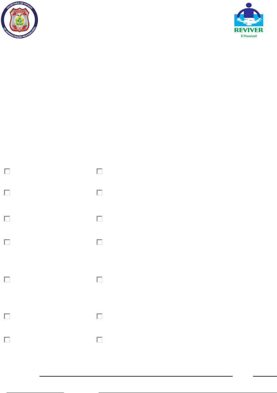 Questionário de Prontidão para Atividade Física (PAR-Q) Este questionário tem o objetivo de identificar a necessidade de avaliação por um médico/fisioterapeuta, antes do início da atividade física. Caso você responda “SIM” a uma ou mais perguntas, converse com seu médico/fisioteraeuta, ANTES de aumentar seu nível atual de atividade física. Mencione este questionário eas perguntas às quais você respondeu “SIM”. Por favor, assinale “SIM” ou “NÃO” às seguintes perguntas: 1. Algum médico já disse que você possui algum problema de coração e que só deveriarealizar atividade física supervisionado por profissionais de saúde? Sim Não 2. Você sente dores no peito quando pratica atividade física? Sim Não 3. No último mês, você sentiu dores no peito quando praticou atividade física? Sim Não 4. Você apresenta desequilíbrio devido à tontura e/ ou perda de consciência? Sim Não 5. Você possui algum problema ósseo ou articular que poderia ser piorado pela atividade física? Sim Não 6. Você toma atualmente algum medicamento para pressão arterial e/ou problema decoração? Sim Não 7. Sabe de alguma outra razão pela qual você não deve praticar atividade física?Sim Não Nome completo Idade: Data Assinatura: Se você respondeu “SIM” a uma ou mais perguntas, leia e assine o “Termo de Responsabilidadepara Prática de Atividade Física” Termo de Responsabilidade para Prática de Atividade Física Estou ciente de que é recomendável conversar com um médico antes de aumentar meu nível atual de atividade física, por ter respondido “SIM” a uma ou mais perguntas do “Questionário de Prontidão para Atividade Física” (PAR-Q). Assumo plena responsabilidade por qualqueratividade física praticada sem o atendimento a essa recomendação. Nome completo Data Assinatura: ___________________________________ ___________________________________ William Fernandes CIENTE/GERAD FISIOTERAPEUTA - REVIVER