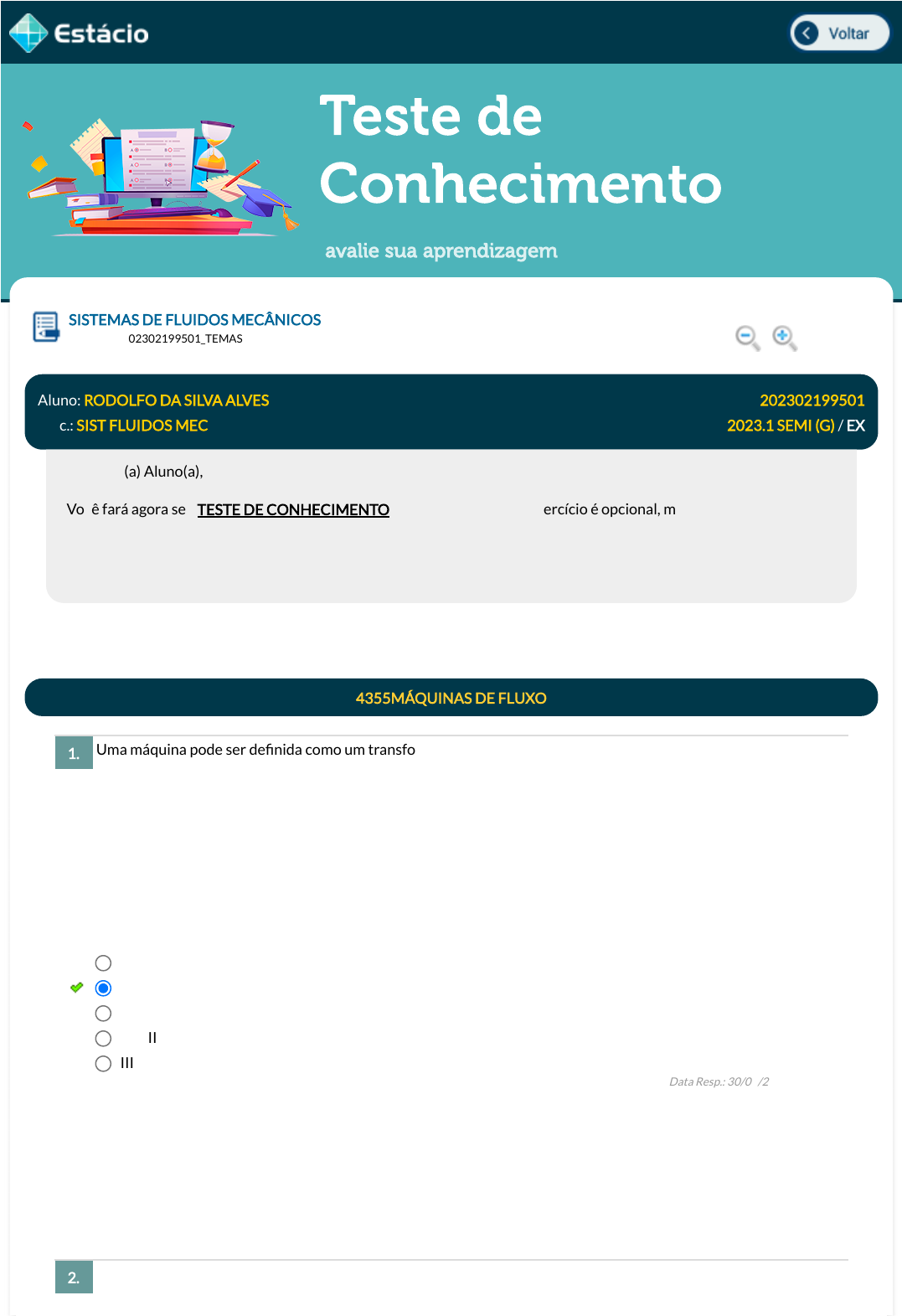 01/05/2023, 14:59 Estácio: Alunos https://simulado.estacio.br/alunos/ 1/7 Teste de Conhecimento avalie sua aprendizagem Uma máquina pode ser de�nida como um transformador de energia. Nas máquinas de �uido ocorre a troca de energia entre um sistema mecânico e um �uido, ou seja, a transformação de energia mecânica em energia de �uido ou energia de �uido em energia mecânica. Considere as seguintes a�rmações sobre os distribuidores das turbinas: I. Estes são posicionados antes da chegada do �uido no rotor. II. A Turbina Pelton não apresenta um distribuidor. III. A carcaça da Turbina Francis faz parte do sistema de distribuidores desta Turbina. Estão corretas, as a�rmativas: Uma máquina pode ser de�nida como um transformador de energia. Nas máquinas de �uido ocorre a troca de energia entre um sistema mecânico e um �uido, ou seja, a transformação de energia mecânica em energia de �uido SISTEMAS DE FLUIDOS MECÂNICOS Lupa ARA1173_202302199501_TEMAS Aluno: RODOLFO DA SILVA ALVES Matr.: 202302199501 Disc.: SIST FLUIDOS MEC 2023.1 SEMI (G) / EX Prezado (a) Aluno(a), Você fará agora seu TESTE DE CONHECIMENTO! Lembre-se que este exercício é opcional, mas não valerá ponto para sua avaliação. O mesmo será composto de questões de múltipla escolha. Após responde cada questão, você terá acesso ao gabarito comentado e/ou à explicação da mesma. Aproveite para se familiarizar com este modelo de questões que será usado na sua AV e AVS. 4355MÁQUINAS DE FLUXO 1. I e II I e III I II e III III Data Resp.: 30/04/2023 12:07:26 Explicação: As a�rmativas I e III estão corretas. Na a�rmativa II, o injetor da turbina Pelton cumpre a função de distribuidor. 2. javascript:voltar(); javascript:voltar(); javascript:diminui(); javascript:aumenta(); 01/05/2023, 14:59 Estácio: Alunos https://simulado.estacio.br/alunos/ 2/7 ou energia de �uido em energia mecânica. Uma empresa do ramo alimentício está buscando uma bomba para deslocar creme de chocolate com amendoins entre seus processos, qual seria a bomba mais indicada para esta instalação? As máquinas são elementos mecânicos criados pela humanidade com o objetivo de realizar um trabalho árduo, que realizado de forma manual, em muitos casos, seria praticamente impossível. Observe estas a�rmações sobre as máquinas de �uido: I. São equipamentos que realizam a conversão de energia utilizando um �uido como meio de interação. II. O componente responsável por interagir com o �uido é chamado de difusor. III. Podem ser classi�cadas entre máquinas hidráulicas e máquinas térmicas. Estão corretas, as a�rmativas: Em uma re�naria de petróleo, água deve ser escoada entre um trecho do processo. Sabe-se que a água possui uma densidade de 1000 kg/m³. A potência requerida nesse processo é de 5 kW. Veri�cou-se que a vazão volumétrica é de 0,01 m³/s. Se as pás na saída do rotor são radiais, qual o diâmetro o rotor na saída da bomba? Bomba rotativa de lóbulos Bomba de �uxo misto Bomba centrífuga Bomba axial Bomba alternativa de pistão Data Resp.: 30/04/2023 12:15:44 Explicação: A bomba de lóbulos transporta o �uido em escoamento pelo canal formado entre os lóbulos e é capaz de realizar o escoamento de sólidos não abrasivos sem que estes se quebrem. As demais alternativas estão erradas pois: As bombas centrífuga, axial e de �uxo misto são turbomáquinas, não sendo recomendadas para operação com sólidos particulados que possam ser quebrados durante o transporte. Já a bomba alternativa de pistão não é capaz de transportar sólidos. 3. II. I. I e II. II e III. I e III. Data Resp.: 30/04/2023 12:24:42 Explicação: As a�rmativas I e III estão corretas. Na a�rmação II, o componente responsável por interagir com o �uido é chamador de rotor. 4356TEORIA DO ROTOR 4. 105,6 mm 125,6 mm 115,6 mm 95,6 mm 85,6 mm Data Resp.: 30/04/2023 12:46:07 01/05/2023, 14:59 Estácio: Alunos https://simulado.estacio.br/alunos/ 3/7 Um estagiário decidiu calcular teoricamente através da equação de Euler a variação da altura de carga teórica H (em metros) em função da vazão volumétrica Q (m³/s) de uma bomba centrífuga com rotor simples. Para os seus cálculos ele considerou que a largura da pá na saída do rotor da bomba é de 100 mm com um ângulo de 60°, sendo que o rotor nesse ponto possui um diâmetro de 380 mm. Se a velocidade tangencial absoluta na saída do rotor for de 3 m/s, qual o valor das constantes K1 e K2 da curva teórica de carga? Explicação: 5. K1=0,82m e K2=218sm² K1=0,72m e K2=208sm² K1=0,92m e K2=238sm² K1=0,92m e K2=228sm² K1=0,92m e K2=248sm² Data Resp.: 30/04/2023 12:56:11 Explicação: 01/05/2023, 14:59 Estácio: Alunos https://simulado.estacio.br/alunos/ 4/7 Água é escoada com uma vazão de 0,028 m³/s através de uma bomba centrífuga contendo um rotor com 40 mm de diâmetro na entrada e 150 mm de diâmetro na saída. Na saída, as pás do rotor são radiais e a velocidade da água nesse ponto é de 3,5 m/s. O torque requerido nesse processo para uma rotação de 4000 rpm é? 6. 76 N.m 86 N.m 96 N.m 66 N.m 106 N.m Data Resp.: 30/04/2023 13:01:02 Explicação: 01/05/2023, 14:59 Estácio: Alunos https://simulado.estacio.br/alunos/ 5/7 Conhecer sistemas �uidos mecânicos é essencial para um pro�ssional de engenharia. Projetar sistemas de bombeamento, selecionar bombas ou entender a relação entre a altura manométrica e a vazão volumétrica fazem parte do escopo do dia a dia do engenheiro. Em uma unidade de instalação, a curva do sistema é descrita pela equação . Um engenheiro pediu para a operação instalar uma bomba centrífuga que possui a seguinte equação para a curva da bomba: . Em ambas as equações, H é dado em metros e Q em m³/s. A vazão volumétrica no ponto de operação, em m³/h, é: Conhecer sistemas �uidos mecânicos é essencial para um pro�ssional de engenharia. Projetar sist
