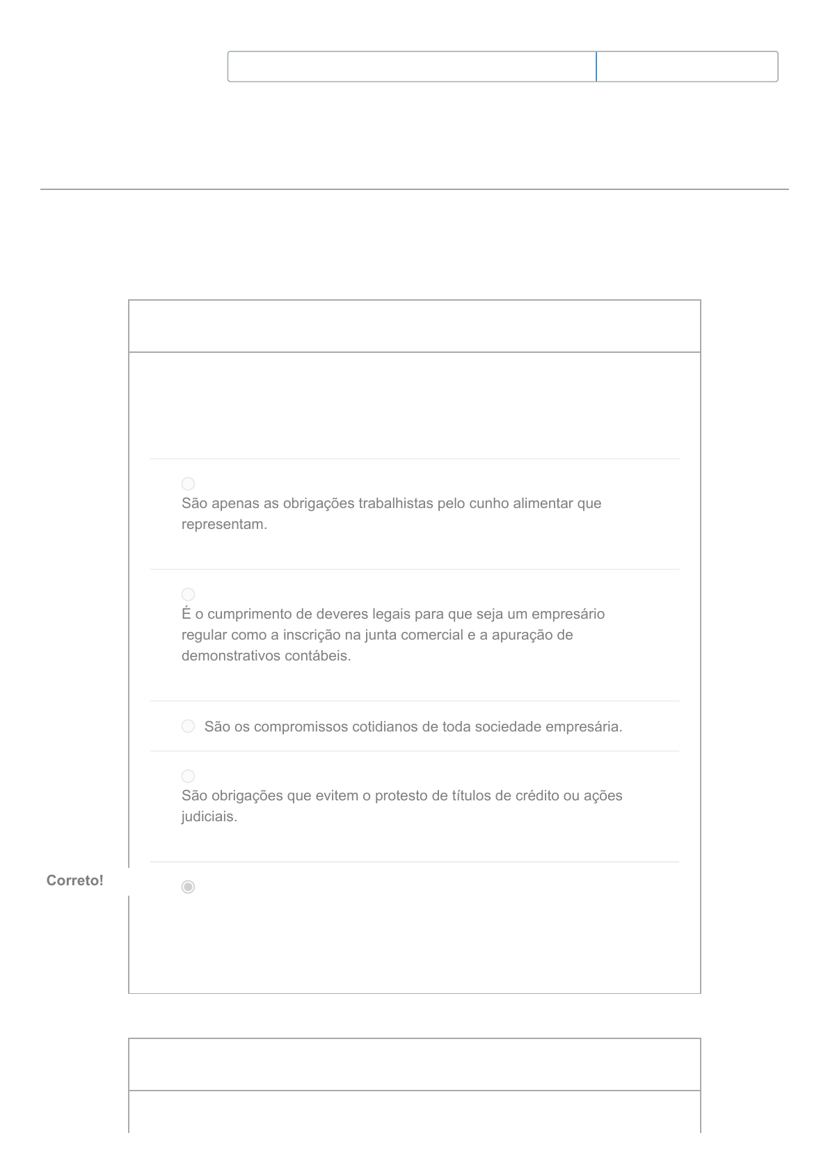25/04/2021 NÚBIA KARLLA MAZZONI RODRIGUES, histórico de teste: Prova Eletrônica https://dombosco.instructure.com/courses/4133/quizzes/16380/history?version=1 1/6 Seu Progresso: 67 % Prova Eletrônica Resultados para NÚBIA KARLLA MAZZONI RODRIGUES Pontuação desta tentativa: 30 de 30 Enviado 25 abr em 17:01 Esta tentativa levou 29 minutos. 3 / 3 ptsPergunta 1 Segundo a lei, o que são as obrigações gerais do empresário: São apenas as obrigações trabalhistas pelo cunho alimentar que representam. É o cumprimento de deveres legais para que seja um empresário regular como a inscrição na junta comercial e a apuração de demonstrativos contábeis. São os compromissos cotidianos de toda sociedade empresária. São obrigações que evitem o protesto de títulos de crédito ou ações judiciais. São as obrigações gerias conforme a seguinte ordem: dívidas trabalhistas, tributárias, garantias reais e garantias documentais. Correto!Correto! 3 / 3 ptsPergunta 2 25/04/2021 NÚBIA KARLLA MAZZONI RODRIGUES, histórico de teste: Prova Eletrônica https://dombosco.instructure.com/courses/4133/quizzes/16380/history?version=1 2/6 O que são as sociedades de capital? São aquelas classificadas como tal pelo fato dos atributos pessoais dos sócios serem essenciais para o desenvolvimento de seu objeto social. São aquelas administradas exclusivamente por pessoas físicas, independente da participação societária. São aquelas que não possuem CNPJ e que a emissão das notas fiscais é feita exclusivamente com o CPF dos sócios acionistas ou cotistas. São aquelas cujos sócios são exclusivamente pessoas físicas não sendo possível a participação de pessoas jurídicas no seu quadro social. São aquelas onde o capital investido é mais importante que as características subjetivas de seus sócios. Correto!Correto! 3 / 3 ptsPergunta 3 O início da personalidade jurídica da sociedade ocorre com: A emissão da primeira nota fiscal. A inscrição de seu ato constitutivo (contrato social, por exemplo) na junta comercial. Correto!Correto! A definição da sede, sócios e objeto social. 25/04/2021 NÚBIA KARLLA MAZZONI RODRIGUES, histórico de teste: Prova Eletrônica https://dombosco.instructure.com/courses/4133/quizzes/16380/history?version=1 3/6 A integralização do capital social. O pagamento das obrigações tributárias no primeiro exercício fiscal. 3 / 3 ptsPergunta 4 Marque a resposta que apresente princípios da ordem econômica: Propriedade privada, soberania nacional e internacional. Organização do estado e municípios, soberania nacional e internacional. Propriedade estatal, busca pelo pleno emprego, lucro. Livre concorrência, soberania nacional e propriedade privada. Correto!Correto! Organização político partidária, defesa do meio ambiente e concorrência controlada. 3 / 3 ptsPergunta 5 Segundo o Código Civil, qual o significado do termo empresa? Junta comercial. Sinônimo de pessoa jurídica. Sinônimo de sociedades mercantis. 25/04/2021 NÚBIA KARLLA MAZZONI RODRIGUES, histórico de teste: Prova Eletrônica https://dombosco.instructure.com/courses/4133/quizzes/16380/history?version=1 4/6 Qualquer pessoa jurídica que participe de atos mercantis, mesmo as sem fins lucrativos. Atos mercantis. Correto!Correto! 3 / 3 ptsPergunta 6 Trata-se de um requisito preliminar para a constituição da Sociedade Anônima: Escolha de nome empresarial que não seja conflitante com nomes já registrados na junta comercial ou no INPI. Realização de (pelo menos) 10% do capital social em dinheiro. Correto!Correto! Discussão e análise do estatuto social. Convocação dos acionistas, em jornal de grande circulação, para a fundação da sociedade (assembleia de fundação). Escolha do endereço da sede. 3 / 3 ptsPergunta 7 O que é a Comissão de Valores Mobiliários? É um órgão de fiscalização dentro da sociedade. 25/04/2021 NÚBIA KARLLA MAZZONI RODRIGUES, histórico de teste: Prova Eletrônica https://dombosco.instructure.com/courses/4133/quizzes/16380/history?version=1 5/6 É um órgão equivalente à assembleia dos sócios. É uma autarquia federal encarregada de regular a operação de valores mobiliários. Correto!Correto! Um órgão societário encarregado de verificar o valor das ações na bolsa de valores. É o nome técnico da bolsa de valores. 3 / 3 ptsPergunta 8 Qual a principal característica da sociedade limitada? Limitação da responsabilidade subsidiária ao capital social regularmente investido. Correto!Correto! Limitação do número de sócios. Limitação ao objeto social. Limitação da margem de lucro obtida no exercício social. Limitação do capital social. 3 / 3 ptsPergunta 9 São diferentes tipos de valores que as ações das sociedades anônimas podem adquirir: 25/04/2021 NÚBIA KARLLA MAZZONI RODRIGUES, histórico de teste: Prova Eletrônica https://dombosco.instructure.com/courses/4133/quizzes/16380/history?version=1 6/6 De mercado internacional, nominal e de emissão. Subvalor, supra valor e hipervalor. De face, econômico e de mercado. Econômico, de mercado estrangeiro e asiático e de emissão. Nominal, econômico e de negociação. Correto!Correto! 3 / 3 ptsPergunta 10 Selecione a alternativa CORRETA. O capital social das Sociedades Anônimas pode ser integralizado por: I - Bens imateriais; II - Dinheiro; III - Créditos; IV - Quaisquer formas de bens, inclusive os sentimentais. Somente II e III estão corretas. Apenas I está correta. Todas as alternativas estão corretas. Apenas IV está correta. I, II e III estão corretas. Correto!Correto! Pontuação do teste: 30 de 30