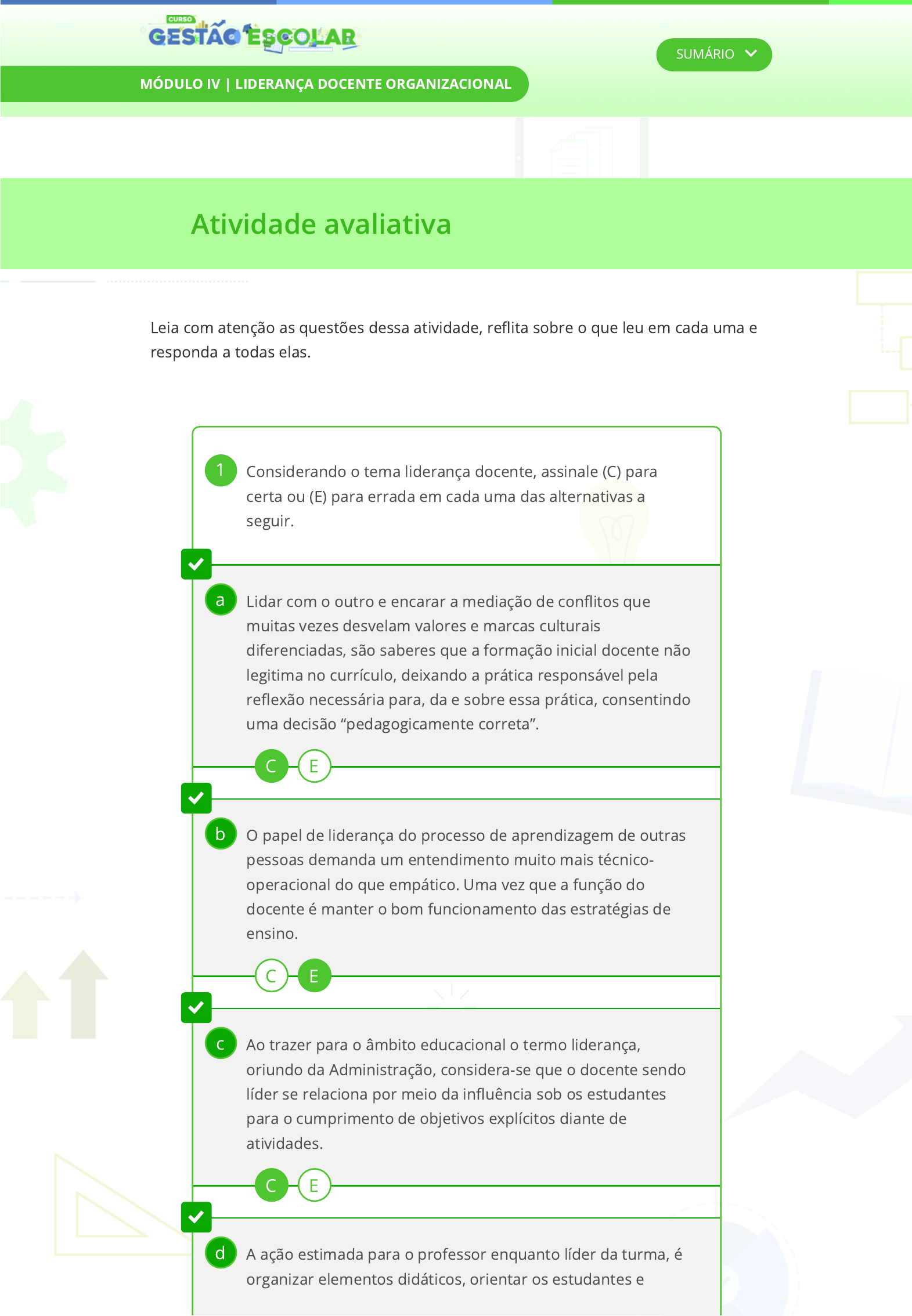 31/08/2023, 19:19 Liderança docente organizacional https://avamec.mec.gov.br/#/instituicao/seb/curso/14703/unidade/8131/acessar?continue=false 1/9 SUMÁRIO Atividade avaliativa Leia com atenção as questões dessa atividade, re�ita sobre o que leu em cada uma e responda a todas elas. Considerando o tema liderança docente, assinale (C) para certa ou (E) para errada em cada uma das alternativas a seguir. 1 Lidar com o outro e encarar a mediação de con�itos que muitas vezes desvelam valores e marcas culturais diferenciadas, são saberes que a formação inicial docente não legitima no currículo, deixando a prática responsável pela re�exão necessária para, da e sobre essa prática, consentindo uma decisão “pedagogicamente correta”. a EC O papel de liderança do processo de aprendizagem de outras pessoas demanda um entendimento muito mais técnico- operacional do que empático. Uma vez que a função do docente é manter o bom funcionamento das estratégias de ensino. b EC Ao trazer para o âmbito educacional o termo liderança, oriundo da Administração, considera-se que o docente sendo líder se relaciona por meio da in�uência sob os estudantes para o cumprimento de objetivos explícitos diante de atividades. c EC A ação estimada para o professor enquanto líder da turma, é organizar elementos didáticos, orientar os estudantes e d MÓDULO IV | LIDERANÇA DOCENTE ORGANIZACIONAL 31/08/2023, 19:19 Liderança docente organizacional https://avamec.mec.gov.br/#/instituicao/seb/curso/14703/unidade/8131/acessar?continue=false 2/9 deliberar tarefas que levem à aprendizagem. EC Complete as considerações de Lemov (2016), a seguir, sobre a atuação do professor em sala de aula. Basta selecionar a opção correta, clicando no link que aparece em cada lacuna. 2 In�uenciar fazer internalizar acreditar controle os alunos é inspirá-los a , a querer dar certo e a querer estudar por razões intrínsecas às tarefas diante deles. É o próximo passo, para além do controle. O leva-os a as coisas que você sugere; a in�uência leva-os a querer as coisas que você sugere. In�uenciar acreditar controle fazer internalizar Para o clima em sala de aula - o ambiente psicológico precisa ser harmonioso e motivador, portanto, a liderança docente deve ser: 3 de senso de justiça e autoridade, a exemplo da atuação, personalidade e postura em sala de aula do professor Guilherme. E que considere o espaço da sala de aula estritamente para a aprendizagem dos conteúdos conceituais e factuais dispostos no currículo. a democrática, considerando o que os estudantes têm a dizer sobre as orientações e tarefas. Reconhecer-se diante do estudante também como aprendiz não é tarefa comum ou simples ao professor, pois essa pro�ssão resguarda crenças b 31/08/2023, 19:19 Liderança docente organizacional https://avamec.mec.gov.br/#/instituicao/seb/curso/14703/unidade/8131/acessar?continue=false 3/9 culturais de que o “professor sabe tudo” ou de que o “professor é quem deve ensinar” ensejando ao estudante uma cultura passiva diante do próprio aprender. de uma atuação em que o professor deve assumir posturas e limites precedidos de sua visão sobre a educação, o conhecimento, a sala de aula e a própria função do professor. c justa, exigente e �rme, considerando, por exemplo, a postura do professor de usar a exclusão de estudantes de sala de aula para preservar o ambiente e o clima necessário a toda aprendizagem. d Conforme discutido e apresentado nesse módulo, o modus operandi do professor se relaciona: 4 ao gerenciamento de objetivos, conteúdos, estratégias e recursos vislumbrando a aprendizagem, evidenciando-a pela avaliação, estimando então a gestão da aprendizagem, as relações interpessoais e a mediação de con�itos. a às suas escolhas e tomadas de decisões uma vez que, entre outras posturas e atitudes, ele deve sempre se colocar em um piso de estrutura física superior ao espaço reservado às carteiras dos estudantes. b à prática docente associada tão somente à ação de ensinar. O que signi�ca que essa prática é independente do processo de aprendizagem dos estudantes. c em compreender que, basicamente, para que o processo de ensino e de aprendizagem aconteça e seja signi�cativo, basta lançar mão de diferentes técnicas e métodos e utilizá-los em sala de aula. d 31/08/2023, 19:19 Liderança docente organizacional https://avamec.mec.gov.br/#/instituicao/seb/curso/14703/unidade/8131/acessar?continue=false 4/9 Assinale a alternativa correta em relação à seguinte declaração: "A liderança docente ocorre diante dos processos de ensino e de aprendizagem. Considerando que o ensino tem como foco a aprendizagem intencional, o papel do líder é justamente gerir essa aprendizagem." 5 Dentro do processo de ensino, a estratégia de exposição deve ser a mais utilizada, por se tratar de um recurso dialógico que favorece a troca entre o professor e os estudantes propiciando melhor compreensão e entendimento do exposto. a Direcionar normas, regras e comportamentos deve ser uma tarefa instrutiva, diretiva e unilateral do professor, ela não necessita de acordo entre quem gerenciará - o professor, e quem atenderá às normas - o estudante. b A aprendizagem é qualquer mudança relativamente permanente no comportamento, e que resulta de experiência ou prática. Portanto, se caracteriza por escolha, tomada de decisão; demanda a vontade, atenção, percepção, ativação de memória, motivação e movimento de outro indivíduo - estudante. O professor precisa dispor relação favorável e harmoniosa, ressaltando do estudante a combinação entre consciência e atitude para evidenciar de fato, a aprendizagem. c Na prática docente, o professor deve considerar o espaço da sala de aula estritamente para a aprendizagem dos conteúdos conceituais e factuais dispostos no currículo. d Em relação a algumas estratégias de abordagens compor