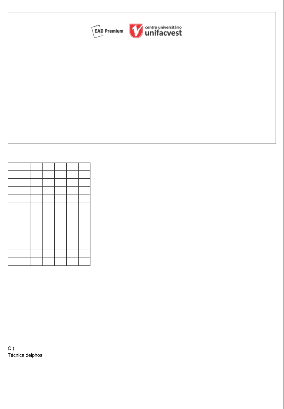 Requisição: 5263105 Matricula: 707725 Data: 12/12/2022 14:27 Página: 1/4 Prova presencial regular Curso: 24 MESES - TECNOLOGIA GESTÃO PÚBLICA - UNIFACVEST EAD Módulo: 4 Grupo: 213 Município: FAXINAL DOS GUEDES - SC Disciplina(s): 101048 - FUNDAMENTOS DE FINANÇAS Nome: 707725 - PAULO CESAR ZUCCHI Data: ___/___/_________ Hora:___|___|___ Assinatura do aluno: ________________________________________________________ Preencha o gabarito abaixo com X na coluna correta. Atente para a coluna de numeração e das alternativas. Questões A B C D E 1 2 3 4 5 6 7 8 9 10 11 12 1 ) O estudo do mercado para um projeto compreende análises que são indissociáveis: a qualitativa e a quantitativa. Há uma técnica qualitativa que consiste em uma pesquisa de campo, na qual, por meio de um questionário, o pesquisador questionará vários especialistas que conhecem direta ou indiretamente o objeto de seu projeto. Assinale a alternativa que indica a qual técnica estamos nos referindo. A ) Analogia histórica B ) Técnica de cenários C ) Técnica delphos D ) Estudo macroeconômico E ) Análise conjuntural 1-C 2-A 3-C 4-B 5-D 6-E 7-A 8-D 9-A 10-C 11-D 12-D Requisição: 5263105 Matricula: 707725 Data: 12/12/2022 14:27 Página: 2/4 2 ) A expressão empregada para a precificação utiliza três variáveis: o preço que se deseja calcular, os custos de produção e o markup. Sendo assim, quais custos devem ser envolvidos no processo de precificação? Assinale a alternativa correta. A ) Os custos fixos e variáveis, diretos e indiretos. B ) Os custos fixos indiretos. C ) Os custos variáveis diretos. D ) As despesas fixas. E ) As despesas variáveis. 3 ) Certo investidor está indeciso sobre um empréstimo. Ele deseja financiar seu restaurante no valor de R$ 8 milhões a uma taxa de juros de 1% ao mês, mas não sabe qual sistema de amortização deve contratar. Esse investidor tem quatro opções: sistema de amortização constante (SAC), sistema de amortização francês (SAF), sistema de amortização americano (SAA) e sistema de amortização misto (SAM). Assinale a alternativa menos onerosa. A ) SAF é o menos oneroso. B ) Nenhuma das alternativas. C ) SAC é o menos oneroso. D ) SAA é o menos oneroso. E ) SAM é o menos oneroso. 4 ) Uma empresa normalmente paga sua matéria-prima a prazo todos os dias 10 de cada mês, e recebe suas vendas a prazo no dia 30 de cada mês. Qual é o número de dias para o caixa mínimo? Assinale a alternativa correta. A ) 30 dias B ) 20 dias C ) 40 dias D ) 50 dias E ) 10 dias 5 ) Considere duas alternativas que estão sendo orçadas para uma fábrica de papelão ondulado. Segundo o método o payback, assinale qual das alternativas é a melhor. A ) O fluxo A, pois o payback ocorre no terceiro ano. B ) O fluxo B, pois o payback ocorre no segundo ano. C ) O fluxo A, pois o payback ocorre no segundo ano. D ) A e B são indiferentes, pois o payback ocorre em ambos no quarto ano. E ) O fluxo B, pois o payback ocorre no terceiro ano. Requisição: 5263105 Matricula: 707725 Data: 12/12/2022 14:27 Página: 3/4 6 ) Ao calcular um ponto de equilíbrio é possível haver, no decorrer do período, algumas saídas de caixa que, embora não representem custo fixo, devem ser identificadas - alguma repactuação de dívida ou renegociação de tributos, por exemplo. Para tanto, existe um ponto de equilíbrio que inclui em sua expressão estas saídas de caixa. Qual seria? Assinale a alternativa correta. A ) Ponto de equilíbrio financeiro B ) Ponto de equilíbrio contábil C ) Ponto de equilíbrio operacional múltiplo D ) Ponto de equilíbrio econômico E ) Ponto de equilíbrio financeiro dois 7 ) Uma empresa compra sua matéria-prima no dia 2 de cada mês e inicia a fabricação no dia 5. O que podemos dizer sobre o tempo de estoque de materiais diretos e indiretos para o processo fabril? Assinale a alternativa correta. A ) A matéria-prima fica em estoque durante 3 dias. B ) A matéria-prima fica em estoque durante 8 dias. C ) A matéria-prima fica em estoque durante 2 dias. D ) A matéria-prima fica em estoque durante 5 dias. E ) Não há estoque de matéria-prima. 8 ) Quando falamos em ponto de equilíbrio para um único produto, verificamos que todos guardam uma diferença entre si, de acordo com seu objetivo (PEC, PEE, PEF1 e PEF2). Assim, quando comparamos o ponto de equilíbrio contábil (PEC) com o ponto de equilíbrio financeiro (PEF), identificamos qual diferença? Assinale a alternativa correta. A ) No PEC multiplicamos o lucro meta e no PEF dividimos o lucro meta. B ) No PEC subtraímos o lucro meta e no PEF somamos o lucro meta. C ) No PEC retiramos a depreciação e no PEF somamos a depreciação. D ) No PEC somamos a depreciação e no PEF subtraímos a depreciação. E ) No PEC somamos o lucro meta e no PEF subtraímos o lucro meta. 9 ) Podemos entender o risco como um fenômeno que afeta negativamente um planejamento ou uma ação no ambiente econômico ou no cotidiano de uma pessoa. Assinale, a seguir, a proposição correta sobre o risco no ambiente financeiro. A ) O risco pode ser antecipado quando conhecemos seu histórico. B ) O risco não pode ser antecipado, pois nunca conhecemos seu histórico. C ) O risco não pode ser evitado, pois nunca se repete. D ) O risco pode ser evitado, pois sempre será o mesmo. E ) O risco não pode ser antecipado, pois não há meios para evitá-lo, mesmo conhecendo seu histórico. 10 ) A técnica da taxa interna de retorno (TIR) é amplamente utilizada para orçamento de capital, pois Requisição: 5263105 Matricula: 707725 Data: 12/12/2022 14:27 Página: 4/4 identifica uma taxa mínima de retorno que será comparada a uma taxa mínima de atratividade (TMA). Nesses termos, o que se espera quando encontramos a TIR de determinado orçamento ao compará-la com a TMA para que um investimento seja aceito? Assinale a alternativa correta. A ) Espera-se que a TIR seja negativa e a TMA, positiva. B ) Espera-se que a TMA seja maior q