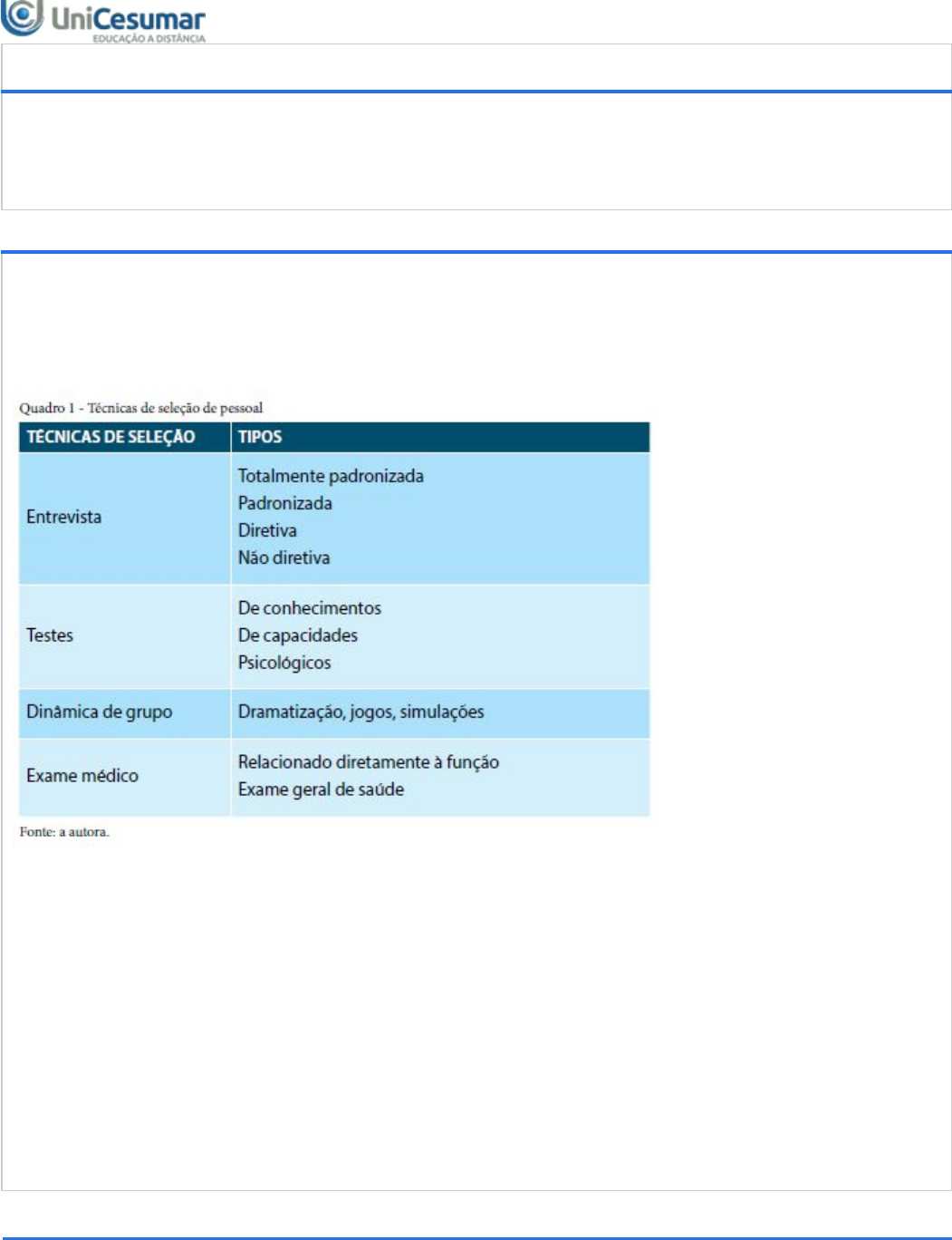 22/03/2023, 20:42 Unicesumar - Ensino a Distância about:blank 1/10 ATIVIDADE 3 - ADMINISTRAÇÃO DE RECURSOS HUMANOS - 51/2023 Período:06/03/2023 08:00 a 24/03/2023 23:59 (Horário de Brasília) Status:ABERTO Nota máxima:0,50 Gabarito:Gabarito será liberado no dia 25/03/2023 00:00 (Horário de Brasília) Nota obtida: 1ª QUESTÃO A coleta de informações sobre o candidato, na tentativa de conhecer tanto a sua experiência e seus conhecimentos sobre o trabalho a ser realizado quanto os aspectos relacionados a sua personalidade, exige a utilização de determinadas técnicas que possam trazer subsídios à avaliação para a tomada de decisão, diminuindo a possibilidade de erro na escolha do candidato. Considerando o papel do profissional de RH no processo da coleta de informações sobre os candidatos, avalie as asserções a seguir e a relação proposta entre elas: I. Nas dinâmicas de grupo, o profissional de RH que está conduzindo o processo seletivo tem a oportunidade de observar como o candidato se comporta, podendo relacionar suas atitudes no momento da seleção com o desempenho que terá na organização. PORQUE II. Todos os profissionais de RH podem e devem buscar conhecer e aplicar testes de personalidade nos candidatos, para garantir um processo seletivo mais qualificado. Assinale a alternativa correta: ALTERNATIVAS 22/03/2023, 20:42 Unicesumar - Ensino a Distância about:blank 2/10 As asserções I e II são proposições verdadeiras, e a II é uma justificativa correta da I. As asserções I e II são proposições verdadeiras, mas a II não é uma justificativa correta da I. A asserção I é uma proposição verdadeira, e a II é uma proposição falsa. A asserção I é uma proposição falsa, e a II é uma proposição verdadeira. As asserções I e II são proposições falsas. 2ª QUESTÃO É possível afirmar que existem pelo menos dois modelos básicos de administração que equilibram, de modo diferenciado, a autoridade, a obediência, a liderança, a disciplina e a autonomia: o modelo diretivo (ou diretivo autoritário) e o modelo participativo (ou consultivo-participativo). As empresas e seus modelos de gestão já vinham em constante processo de mudança por conta da evolução tecnológica, num mercado cada vez mais competitivo e conectado. E, de uma hora para outra, todos são atropelados por esta força transformadora, precipitada pela combinação da pandemia com crise econômica, com efeitos nos planos político e social. A combinação desses elementos e sua intensidade deverão gerar mudanças abrangentes nos modelos de negócios, nas empresas e na gestão. COSTA, Waldeciria Souza da; SILVA, Patrícia Rodrigues da. Administração De Recursos Humanos. Maringá- Pr.: UniCesumar, 2018 e Disponível em: https://www.audiprev.com.br/841/__uma_nova_realidade_- _como_ficarao_as_empresas_e_os_modelos_de_gestao_pos_pandemia. Acesso em: 26 Jan.2021. Considerando as informações acima, avalie as asserções a seguir e a relação proposta entre elas. I. As organizações que adotam o modelo diretivo apresentam práticas rotinizadas que buscam a precisão e a racionalização dos processos. Apresentam uma estrutura de cima para baixo, em que indivíduos que estão no topo da hierarquia decidem o destino de muitos. Na atualidade ainda encontramos organizações adeptas desse modelo, e esse tipo de gestão ainda não pode ser considerado totalmente ultrapassado, inútil ou obsoleto. PORQUE II. Algumas das empresas que ainda adotam este modelo apresentam bons resultados, obviamente dependendo de seus objetivos. Considerando este modelo que contempla chefes autocráticos e que são competentes, basta que se coloquem as pessoas certas no lugar certo. Se os subordinados se identificarem com este tipo de chefia, a empresa alcançará seus objetivos esperados em termos econômico- financeiros. A respeito dessas asserções, assinale a opção correta. ALTERNATIVAS As asserções I e II são proposições verdadeiras, e a II é uma justificativa correta da I. As asserções I e II são proposições verdadeiras, mas a II não é uma justificativa correta da I. A asserção I é uma proposição verdadeira, e a II é uma proposição falsa. A asserção I é uma proposição falsa, e a II é uma proposição verdadeira. As asserções I e II são proposições falsas. 3ª QUESTÃO 22/03/2023, 20:42 Unicesumar - Ensino a Distância about:blank 3/10 Qualquer organização que pretenda ser bem-sucedida preocupa-se em ser um bom ou o melhor lugar para se trabalhar. A saúde no trabalho pode ser definida como o processo que “preocupa-se em manter e assegurar que a estrutura da organização e os procedimentos executados durante a jornada de trabalho estejam corretos, ou seja, garantir que as pessoas se encontram em um ambiente seguro” (ARAUJO; GARCIA, 2010, p. 196). Fonte: adaptado de: COSTA, W. S. da, SILVA, P. R. da. Administração de Recursos Humanos. Maringá: UniCesumar, 2017. Sobre os exemplos dos conceitos que definem os objetivos de um programa de saúde no trabalho, avalie as afirmativas a seguir: I. Programa de incentivo à prática de exercícios físicos. II. Distribuição de EPIs para os trabalhadores de uma fábrica de móveis. III. Assistência psicológica para socorristas de serviços de ambulâncias. IV. Controle da temperatura dos escritórios e recepção de uma empresa. É correto o que se afirma em: ALTERNATIVAS I e II, apenas. II e IV, apenas. I, III e IV, apenas. II, III e IV, apenas. I, II, III e IV. 4ª QUESTÃO 22/03/2023, 20:42 Unicesumar - Ensino a Distância about:blank 4/10 Diante de tanta diversidade de temas a tratar, especialmente se for assumir um papel estratégico na empresa, o titular de Recursos Humanos (RH) deverá adquirir inúmeras competências, que Snell e Bohlander (2013) resumem em quatro: domínio do negócio, domínio do RH, domínio das mudanças e credibilidade pessoal. Notamos, assim, que o preparo do gerente de RH par