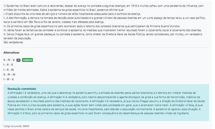 I. O país dispunha de uma rede de serviços e de leitos hospitalares adequados para controle da doença. II. A desinformação, a demora na tomada de decisão pelas autoridades e grande número de pessoas doentes em um curto espaço de tempo levou a um caos social e sanitário em São Paulo e Rio de Janeiro, cidades mais afetadas pela doença. III. Os primeiros casos de gripe espanhola no país ocorreram após o retorno dos soldados brasileiros que participaram da Primeira Guerra. IV. Várias foram as tentativas de combater e controlar a epidemia. As medidas que mostraram melhor resultado foram o isolamento social e o isolamento dos doentes. V. Carlos Chagas teve um grande destaque no combate à epidemia como diretor da Diretoria Geral de Saúde, sendo considerado, por muitos, um verdadeiro salvador da população. a) II e IV estão corretas. b) I, II, III e IV estão corretas. c) I, II, III e V estão corretas. d) III e IV estão corretas.