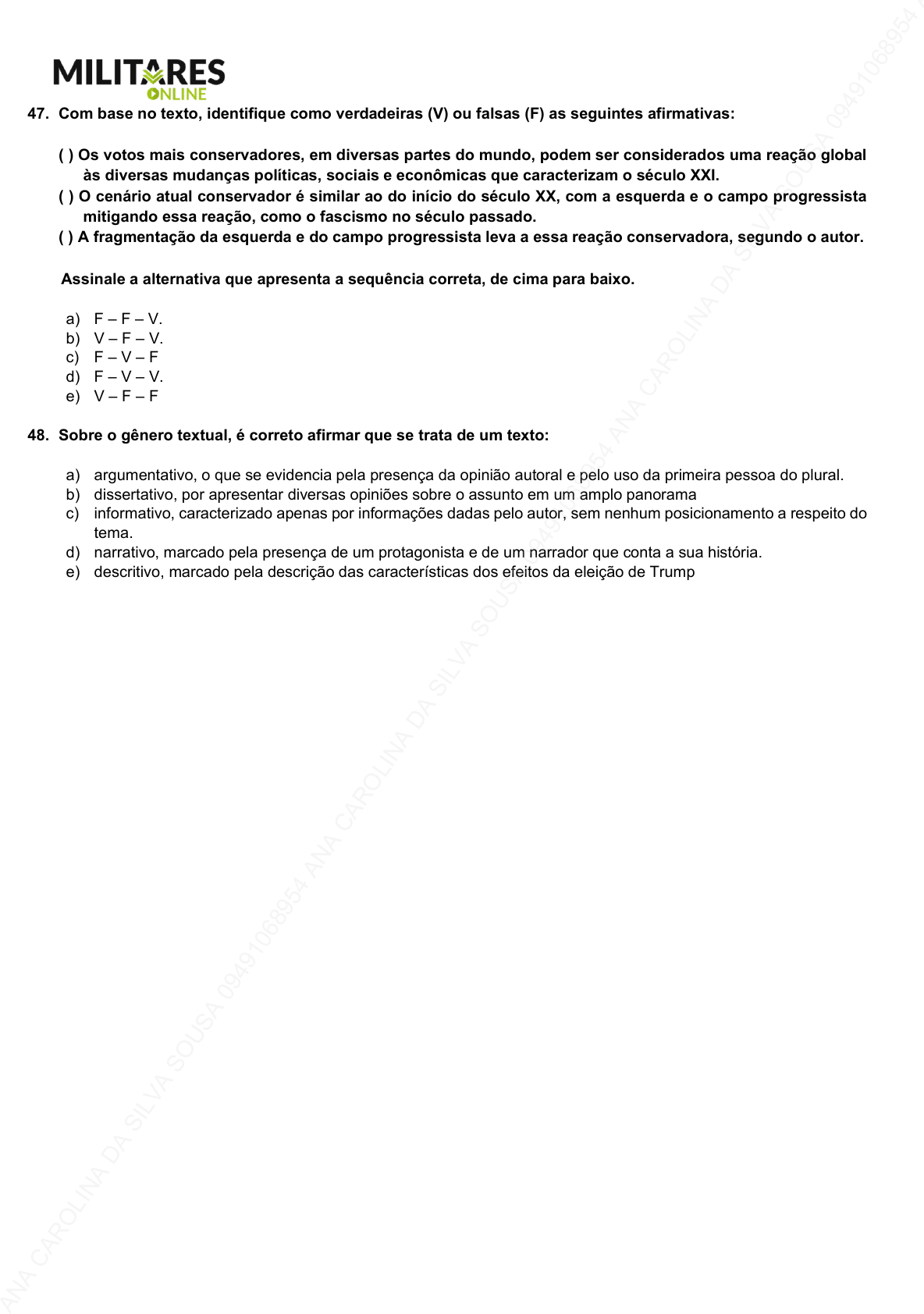 18 47. Com base no texto, identifique como verdadeiras (V) ou falsas (F) as seguintes afirmativas: ( ) Os votos mais conservadores, em diversas partes do mundo, podem ser considerados uma reação global às diversas mudanças políticas, sociais e econômicas que caracterizam o século XXI. ( ) O cenário atual conservador é similar ao do início do século XX, com a esquerda e o campo progressista mitigando essa reação, como o fascismo no século passado. ( ) A fragmentação da esquerda e do campo progressista leva a essa reação conservadora, segundo o autor. Assinale a alternativa que apresenta a sequência correta, de cima para baixo. a) F – F – V. b) V – F – V. c) F – V – F d) F – V – V. e) V – F – F 48. Sobre o gênero textual, é correto afirmar que se trata de um texto: a) argumentativo, o que se evidencia pela presença da opinião autoral e pelo uso da primeira pessoa do plural. b) dissertativo, por apresentar diversas opiniões sobre o assunto em um amplo panorama c) informativo, caracterizado apenas por informações dadas pelo autor, sem nenhum posicionamento a respeito do tema. d) narrativo, marcado pela presença de um protagonista e de um narrador que conta a sua história. e) descritivo, marcado pela descrição das características dos efeitos da eleição de Trump LITERATURA BRASILEIRA 49. Leia o trecho abaixo, extraído de Sagarana, de João Guimarães Rosa: Estremecem, amarelas, as flores da aroeira. Há um frêmito nos caules rosados da erva-de-sapo. A erva-de-anum crispa as folhas, longas, como folhas de mangueira. Trepidam, sacudindo as estrelinhas alaranjadas, os ramos da vassourinha. Tirita a mamona, de folhas peludas, como o corselete de um caçununga, brilhando em verde-azul! A pitangueira se abala, do jarrete à grimpa. E o açoita-cavalos derruba frutinhas fendilhadas, entrando em convulsões. – Mas, meu Deus, como isto é bonito! Que lugar bonito p’r’a gente deitar no chão e se acabar!... É o mato, todo enfeitado, tremendo também com a sezão. (GUIMARÃES ROSA. “Sarapalha”. Sagarana. Obra completa (vol. 1). Nova Aguilar, 1994. p. 295.) O trecho extraído do conto “Sarapalha”, do livro Sagarana, de Guimarães Rosa, exemplifica um aspecto que está presente em todos os contos do mesmo livro. Assinale a alternativa que reconhece esse aspecto de forma adequada. a) A religiosidade cristã católica rege as decisões humanas e transforma os homens e a natureza a partir da ação direta de Deus. b) A ausência de aliterações e a economia de adjetivos são recursos utilizados para representar a aridez da natureza. c) A descrição pormenorizada do espaço físico visa a excluir a dimensão psicológica e mística da narrativa, para fortalecer a feição pitoresca da região. d) A descrição do meio físico é mediada pela visão do narrador, que apresenta a natureza como elemento tão reversível quanto a condição humana. e) São narrados duelos que se travam entre o meio e o homem e que são vencidos apenas pelo uso da força física e da valentia. AN A C AR O LI N A D A SI LV A SO U SA 0 94 91 06 89 54 A N A C AR O LI N A D A SI LV A SO U SA 0 94 91 06 89 54 A N A C AR O LI N A D A SI LV A SO U SA 0 94 91 06 89 54 A N A C AR O LI N A D A SI LV A SO U SA 0 94 91 06 89 54 A N A C AR O LI N A D A SI LV A SO U SA 0 94 91 06 89 54 A N A C AR O LI N A D A SI LV A SO U SA 0 94 91 06 89 54 A N A C AR O LI N A D A SI LV A SO U SA 0 94 91 06 89 54 A N A C AR O LI N A D A SI LV A SO U SA 0 94 91 06 89 54 A N A C AR O LI N A D A SI LV A SO U SA 0 94 91 06 89 54 A N A C AR O LI N A D A SI LV A SO U SA 0 94 91 06 89 54 19 50. A respeito da temática da violência nos contos de Sagarana, de Guimarães Rosa, assinale a alternativa correta. a) Em “Minha gente”, o narrador vai visitar o tio numa região rural e acaba testemunhando um assassinato a foice que tem motivação política, ligado ao envolvimento da família com a disputa eleitoral que está em curso na região. b) Em “Duelo”, a violência é um círculo vicioso, já que a mulher de Turíbio comete adultério com Cassiano, o que leva o marido a matar por engano o irmão do amante; a partir daí, Turíbio e Cassiano passam a se perseguir longamente e os dois acabam morrendo. c) Em “O burrinho pedrês”, um dos vaqueiros que saem de manhã para conduzir a boiada do fazendeiro Major Saulo até a cidade para embarcar no trem de carga planeja a morte de um companheiro por ciúme de uma moça, mas só executa o crime à noite, na volta para a fazenda. d) Em “A hora e vez de Augusto Matraga”, o protagonista é um homem violento que acaba ele próprio sendo vítima de uma tentativa de homicídio à qual sobrevive; esse acontecimento o leva a uma mudança radical e ele abre mão definitivamente de seu comportamento violento. e) Em “Corpo fechado”, citam-se casos de vários valentões de uma pequena cidade, mas o tom é de humor e a violência não é diretamente encenada, já que o personagem principal é um rapaz que não tem medo dos valentões, porque desde pequeno tem o corpo fechado por um feiticeiro. Leia o excerto da obra A falência, de Júlia Lopes de Almeida. Toda a família soluçava à roda do cadáver. Camila tinha no olhar uma fixidez de loucura. A cena da morte reproduzia-se diante dela, como se uma infinita sucessão de espelhos a refletisse consecutivamente. Culpava-se de ter chegado tarde. Esperara o marido em cima por mais de duas horas, cuidosa, com medo que ele fizesse uma loucura, morta por encostar-lhe a cabeça aturdida ao seu peito de mulher enternecida, sentindo que o amava na sua dor, mais do que o tinha amado na felicidade. (ALMEIDA, Júlia Lopes de. A falência. São Paulo: Principis, 2009, p. 185.) 51. Considere as seguintes afirmativas sobre a obra. I. Camila sentia-se culpada pela morte de seu marido Francisco Teodoro, que se suicidou após a descoberta de seu adultério com um amigo próximo da família, dr. Gervásio Gomes. II. Fr