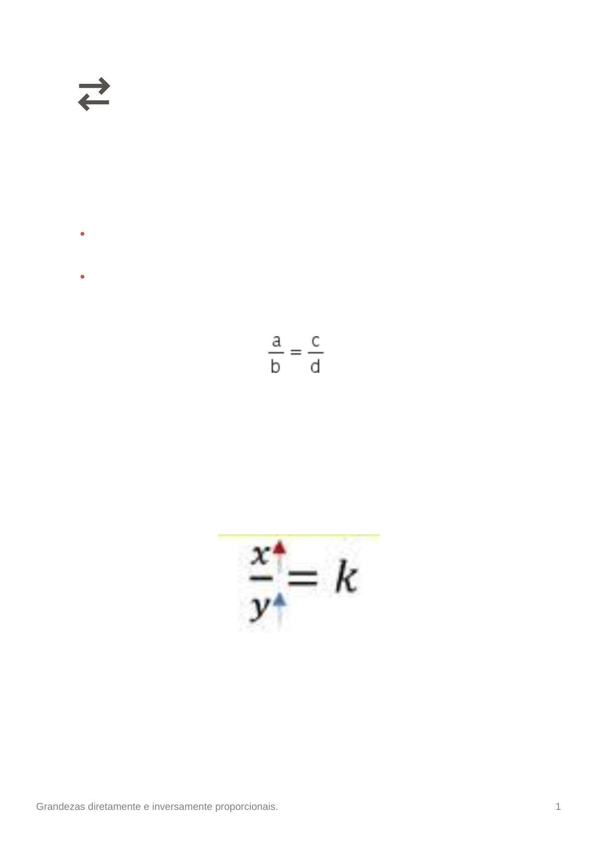 Grandezas diretamente e inversamente proporcionais. 1 Grandezas diretamente e inversamente proporcionais. Grandeza: tudo o que pode ser medido ou calculado. Ex: velocidade, volume, área, etc. Proporção: relação de igualdade entre razões, apresenta duas grandezas em diferentes situações. A igualdade entre a, b, c e d é lida da seguinte forma: a está para b, assim como c está para d. Existem dois tipos de proporcionalidade a diretamente e a inversamente: Proporcionalidade direta. Duas grandezas são diretamente proporcionais quando aumentam, diminuiem, etc na mesma proporcionalidade. Exemplo de proporcionalidade direta: Grandezas diretamente e inversamente proporcionais. 2 Em uma fábrica de sapatos, são feitos 40 sapatos em 2 horas, 60 em 3 horas e 80 em 4 horas, 100 em 5 horas. Tempo (horas) 2 3 4 5 Sapatos (números) 20 40 60 100 Podemos encontrar uma razão nessa situação: O tempo de trabalho é proporcional ao número de sapatos fabricados, pois quando um aumenta, o outro também aumenta. Cálculo de grandeza diretamente proporcional com regra de três. Exemplo: Em 2 horas 200 sapatos Em 4 horas ? sapatos 2.x=200.4 2x= 800 X=2÷800 X=400. Então em 4 horas são produzidos 400 sapatos isso e proporcionalidade. Proporcionalidade inversa. Grandezas diretamente e inversamente proporcionais. 3 A medida que uma grandeza aumento, a outra diminui na mesma proporcionalidade. Exemplo de proporção inversa Maria decidiu contar o tempo que levava indo de casa ao shopping de carro. Com diferentes velocidades. Observe a sequência resistrada: Velocidade 2 4 5 1 Tempo 30 15 12 60 Podemos fazer a seguinte relação com os números das sequências: Nesse exemplo, a sequência de tempo (2, 4, 5 e 1) é inversamente proporcional à velocidade média pedalando (30, 15, 12 e 60) e a constante de proporcionalidade (k) entre essas grandezas é 60. Cálculo de grandeza inversamente proporcional com regra de três. No exemplo do João indo de casa à escola de bicicleta. ↑ maior velocidade = ↓ menor tempo (grandezas inversas) Andando a 30 m/s João demora 2 min para chegar à escola. Se andar a 12 m/s, quanto tempo ele levará para completar o percurso? Grandezas diretamente e inversamente proporcionais. 4 12.x=30.2 12X=60 X= 12÷60 X= 5 Como vimos na tabela do exemplo, se João diminuir a velocidade para 12 m/s, ele aumentará o tempo para 5 min.