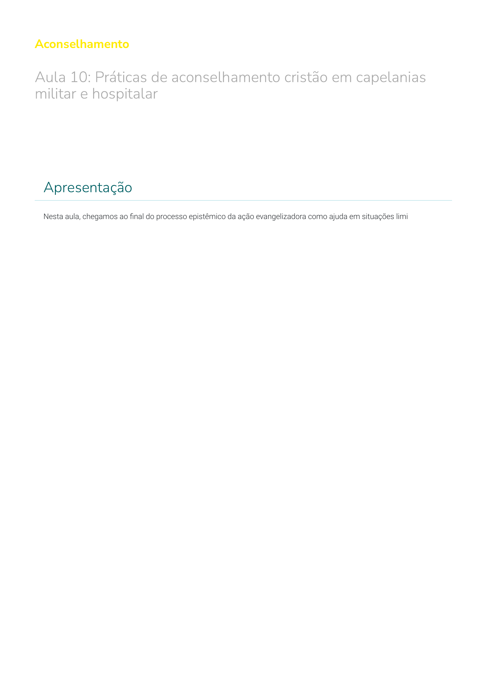 Aconselhamento Aula 10: Práticas de aconselhamento cristão em capelanias militar e hospitalar Apresentação Nesta aula, chegamos ao �nal do processo epistêmico da ação evangelizadora como ajuda em situações limites. Estudaremos aqui duas situações de fronteiras: O aconselhamento nas capelanias hospitalar e militar. Veremos que existem duas situações em que os pro�ssionais da saúde e o enfermo precisam do conselheiro cristão. Primeiro, quando o enfermo entra em cuidados paliativos com mínima possibilidade de recuperação. Já tendo usado todos os recursos da medicina, os pro�ssionais da saúde sabem que apenas um milagre pode reverter a situação. É a hora da oração com fé, amor e esperança no poder de Deus. A segunda situação é quando o enfermo entra em cuidados paliativos sem nenhuma possibilidade de reversão do quadro. Então, o homem de Deus ou a mulher de Deus deve preparar o enfermo para seu encontro com o criador, além de evitar a distanásia ou a eutanásia. A capelania militar, por sua vez, também apresenta desa�os. Ela deve cuidar da saúde espiritual dos pro�ssionais da segurança nacional e local, e ainda orientar os militares no combate ao crime organizado e ao terrorismo em prol da segurança da sociedade e dos cidadãos de bem. Objetivos Investigar a origem e a evolução das capelanias hospitalar e militar; Identi�car os fundamentos bíblicos e teológicos do atendimento hospitalar e militar; Analisar teologicamente as condições de possibilidades de um aconselhamento pastoral hospitalar e militar em defesa da dignidade humana e da vida plena (Jo 10,10). Palavras iniciais Na perspectiva cristã, Jesus Cristo é o paradigma do conselheiro cristão. Ele é o modelo empírico de como ajudar uma ou várias pessoas através do aconselhamento pastoral. Atenção! Aqui existe uma videoaula, acesso pelo conteúdo online Dialogando com as várias formas de conhecimento, sobretudo com as ciências psicológicas, o conselheiro foca em Jesus, o Nazareno, que segundo a teologia de Lucas foi um profeta poderoso em obras e palavras diante de Deus e diante de todo povo. Os quatro evangelhos atestam que Jesus realizou muitos milagres de cura e libertação de todos os tipos de enfermidades (Mc 1,21-3,1-35; Mt 8-9; Lc 6-7; Jo 5,1-47; 9,1-41). Nos Atos dos Apóstolos, Lucas documentou: O primeiro milagre realizado pelos apóstolos Pedro e João foi em nome de Jesus Nazareno (At 3,1-10). A teologia paulina fala que o Espírito concede o dom da cura entre tantos outros dons (1Cor 12, 7-10). Tiago fala da unção e da oração como poder de cura e libertação em nome do Senhor (Tg 5,13-16). Jesus Cristo é o fundamento de toda poimênica e aconselhamento pastoral. As igrejas cristãs devem dar continuidade a esta prática e a este labor pastoral em seu nome. A relação entre Jesus Cristo e a cultura militar É preciso ressaltar um fato interessante: Se Jesus de Nazaré, o Cristo, é o fundamento de toda poimênica e de todo aconselhamento pastoral, como conciliar sua pessoa e sua mensagem com a cultura militar? É verdade que a missão dos militares é manter a paz, embora paradoxalmente uma paz armada. Numa perspectiva preventiva, os militares são necessários tanto para ameaças externas (terrorismo ou outras nações que colocam em risco a soberania) quanto internas. Na “cultura” da violência institucionalizada no Brasil, eles defendem e protegem a sociedade civil e o cidadão de bem do crime organizado. O fato é que Jesus de Nazaré foi perseguido tão logo sua fama se espalhou pela Galileia, Judeia e pelo Império Romano, como “aparelho ideológico imperial”, ou seja, de Estado, na linguagem de Louis Althusser. Lucas nos fala que, no �nal do seu primeiro ano de ministério, Jesus já estava sendo monitorado pelo Império: “Naquele mesmo dia chegaram uns fariseus, dizendo-lhe: Sai, e retira-te daqui, porque Herodes quer matar-te. E respondeu-lhes: Ide, e dizei àquela raposa: Eis que eu expulso demônios, e efetuo curas, hoje e amanhã, e no terceiro dia sou consumado. Importa, porém, caminhar hoje, amanhã, e no dia seguinte, para que não suceda que morra um profeta fora de Jerusalém. Jerusalém, Jerusalém, que matas os profetas, e apedrejas os que te são enviados! Quantas vezes quis eu ajuntar os teus �lhos, como a galinha os seus pintos debaixo das asas, e não quiseste? Eis que a vossa casa se vos deixará deserta. E em verdade vos digo que não me vereis até que venha o tempo em que digais: Bendito aquele que vem em nome do Senhor.” Lucas 6:39-49 Leitura Monitoramento de Jesus Capelania militar É preciso ressaltar as bem-aventuranças que constituem o cristão e, portanto, todo tipo de aconselhamento pastoral Pessoal, grupal, familiar, eclesial, prisional, hospitalar, militar etc. A salvação em Jesus Cristo é universal (Mt 9,10-13; Lc 15). São as igrejas cristãs oferecendo a outra face, como pede Jesus (Mt 5,38-42), além de uma contribuição pedagógica no combate pací�co à violência institucionalizada, ao terrorismo, às guerras eao desarmamento global (Mt 26,52), como construção da paz universal (Is 11,1-9). O capelão militar deve sempre orientar, aconselhar, informar, formar e discernir qual é a vontade de Deus em toda e qualquer situação, pois o Deus de Jesus Cristo não �ca neutro diante das angústias e tristezas, da dor e do sofrimento, dos con�itos e das guerras dos humanos. Ele sempre faz uma opção (Gn 4,1-16; Ex 3,7-10) de justiça e misericórdia pela vida plena (Jo 10,10). “Não matarás” Como aconselhar os militares com relação à legítima defesa dos cidadãos, da soberania nacional e da paz global a partir do mandamento: “Não matarás” (Ex 20,13; Dt 5,17; Mt 5,21-26)? Enquanto houver pessoas armadas com projetos que ameaçam à sociedade civil, enquanto organizações criminosas estiverem agindo com armas empunhadas, enquanto países colocarem em risco outros países, 