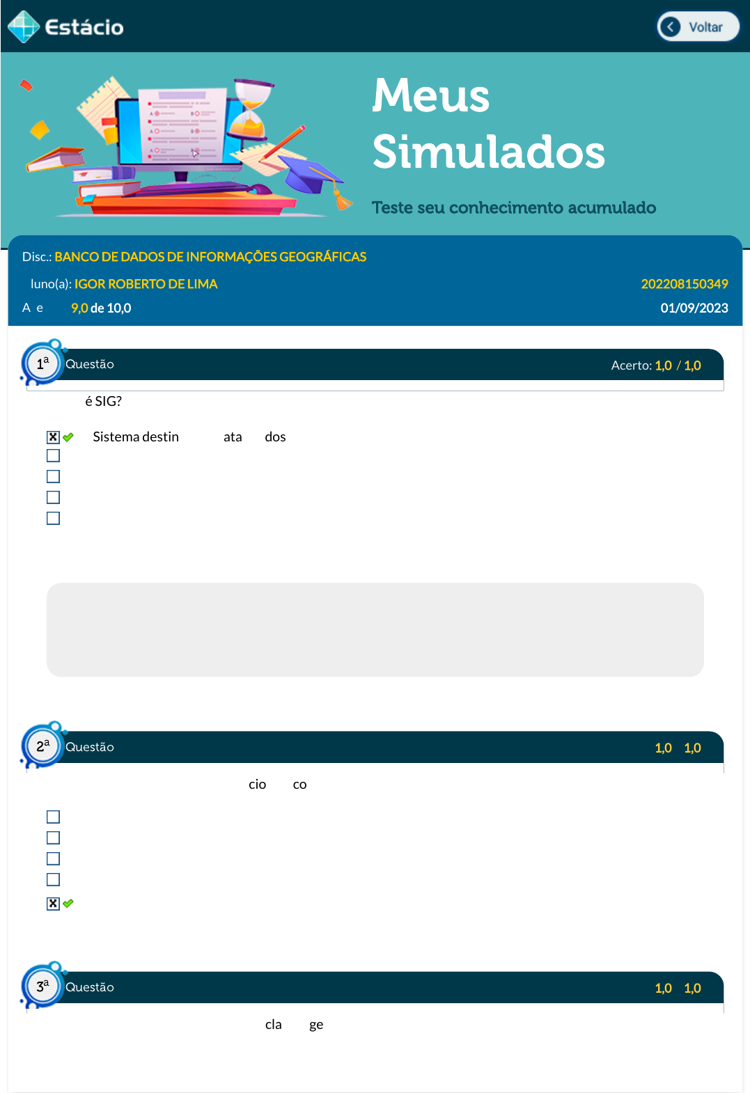 9/1/23, 6:51 PM Estácio: Alunos https://simulado.estacio.br/alunos/ 1/5 Meus Simulados Teste seu conhecimento acumulado Disc.: BANCO DE DADOS DE INFORMAÇÕES GEOGRÁFICAS Aluno(a): IGOR ROBERTO DE LIMA 202208150349 Acertos: 9,0 de 10,0 01/09/2023 Acerto: 1,0 / 1,0 O que é SIG? Sistema destinado a tratar dados geográ�cos. Hardware para medir a posição geográ�ca. Consórcio voltado para o estabelecimento de padrões geográ�cos. Linguagem para manipulação de dados geográ�cos. Órgão de geoprocessamento do governo brasileiro. Respondido em 01/09/2023 18:46:56 Explicação: Um SIG (Sistemas de Informações Geográ�cas) é um sistema destinado a tratar dados geográ�cos. Esses dados são representações de objetos espaciais e de fenômenos da natureza, nos quais a localização geográ�ca é um dado fundamental para que se possa analisar e gerar a informação necessária. Acerto: 1,0 / 1,0 Dentre as alternativas abaixo, selecione a correta em relação ao shape�le. Formato utilizado para armazenamento de fotos de satélites É um exemplo de um sistema de informações geográ�cas. É um formato proprietário de banco de dados geográ�cos. Ferramenta utilizada para identi�car automaticamente dados do mundo real Arquivo que contém dados geoespaciais na forma de vetor. Respondido em 01/09/2023 18:47:26 Acerto: 1,0 / 1,0 O OMT-G possui especializações das classes georreferenciadas, sendo o tipo geocampo um exemplo de especialização. Dentre as classes abaixo, selecione a classe que representa uma das classes possíveis usadas para representar geocampos. Questão1 a Questão2 a Questão3 a https://simulado.estacio.br/alunos/inicio.asp javascript:voltar(); 9/1/23, 6:51 PM Estácio: Alunos https://simulado.estacio.br/alunos/ 2/5 Ponto Linha unidirecional Isolinhas Linha Linha bidirecional Respondido em 01/09/2023 18:47:48 Explicação: Isolinhas são linhas fechadas do tipo geocampo que não têm pontos comuns, ou que não se tocam. Essas linhas têm um valor constante. Um exemplo para esse tipo de classe são as curvas de nível. Acerto: 1,0 / 1,0 Dentre as alternativas abaixo, selecione a correta em relação a resolução espacial no modelo matricial. Uma resolução melhor implica em pixel menor e tamanho de arquivo menor. Uma resolução melhor implica em pixel menor e tamanho de arquivo maior. Uma resolução melhor implica em pixel maior e tamanho de arquivo maior. Não existe relação entre resolução de pixel e tamanho de arquivo. Uma resolução melhor implica em pixel maior e tamanho de arquivo menor. Respondido em 01/09/2023 18:48:33 Acerto: 1,0 / 1,0 Dentre as opções abaixo, selecione a correta em relação ao modelo vetorial de representação de informações geográ�cas. Os objetos ou elementos sempre representam áreas fechadas. Os objetos ou elementos são representados por uma matriz de pixels. Sua representação por células facilita o armazenamento em bancos de dados relacionais. Os objetos ou elementos são representados por um ou mais pares de coordenadas. Necessita de matriz de pixels de alta resolução. Respondido em 01/09/2023 18:49:20 Acerto: 1,0 / 1,0 Dados os seguintes requisitos especí�cos que os modelos conceituais para bancos de dados geográ�cos devem suportar: 1. Aspectos temáticos 2. Objeto geográ�co 3. Visão de campo E dadas as seguintes descrições ( ) Permitem identi�car limites espaciais ( ) Exibem as características do solo e do relevo ( ) Formam um conjunto de objetos ou fenômenos com características e relacionamentos comuns. Considerando a marcação de cima para baixo, qual das sequências abaixo representa a correlação correta? Questão4 a Questão5 a Questão6 a 9/1/23, 6:51 PM Estácio: Alunos https://simulado.estacio.br/alunos/ 3/5 1, 3, 2 2, 3, 1 2, 1, 3 1,2,3 3, 1, 2 Respondido em 01/09/2023 18:49:24 Acerto: 1,0 / 1,0 O que acontece quando é executado o comando SQL a seguir? select ST_Area ( ST_GeogFromText ( 'POLYGON ( (-43.184346 -22.5102751, -43.1844264 -22.510821, -43.18278979999999 -22.5094938, -43.18355469999999 -22.50883799999999) )') ) ; Um erro, pois o polígono não está fechado. Armazena as coordenadas do polígono no banco de dados. Cria uma tabela ST_Area com as informações de um polígono. Desenha o polígono no mapa cartográ�co. Retorna a área do polígono representado pelas coordenadas. Respondido em 01/09/2023 18:49:49 Explicação: ST_GeogFromText cria um polígono a partir de um texto bem de�nido que o descreve, porém a última coordenada deve ser igual à primeira para que o polígono seja fechado. Se for diferente o polígono não é fechado, ocasionando um erro. Acerto: 0,0 / 1,0 Dadas as funções abaixo, selecione a que deve ser utilizada para saber se duas geometrias possuem algum ponto em comum, sem que seus interiores se cruzem. ST_Touches (geometria A, geometria B) ST_Equals (geometria A, geometria B) ST_Overlaps (geometria A, geometria B) ST_Crosses (geometria A, geometria B) ST_Within (geometria A, geometria B) Respondido em 01/09/2023 18:49:59 Explicação: ST_Crosses (geometria A, geometria B): retorna verdadeiro se as geometrias fornecidas tiverem alguns, mas não todos, pontos interiores em comum. ST_Equals (geometria A, geometria B): retorna verdadeiro se as geometrias especi�cadas representarem a mesma geometria. Não é considerada a direcionalidade. ST_Overlaps (geometria A, geometria B): retorna verdadeiro se as geometrias compartilharem espaço, forem da mesma dimensão, mas não forem completamente contidas uma pela outra. ST_Touches (geometria A, geometria B): retorna verdadeiro se as geometrias tiverem pelo menos um ponto em comum, mas seus interiores não se cruzarem. Questão7 a Questão8 a 9/1/23, 6:51 PM Estácio: Alunos https://simulado.estacio.br/alunos/ 4/5 ST_Within (geometria A, geometria B): retorna verdadeiro se a geometria A estiver completamente dentro da B. Acerto: 1,0 / 1,0 Selecione a alternativa correta. As funçõ
