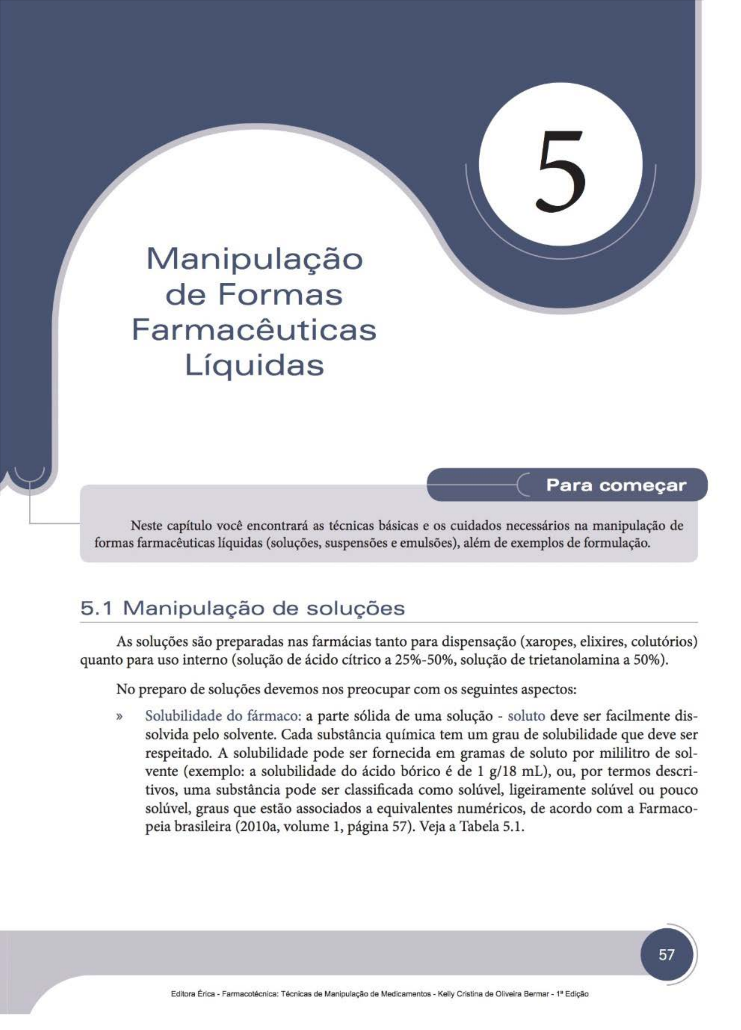 Manipulação de Formas Farmacêuticas Líquidas ~ Para começar Neste capítulo você encontrará as técnicas básicas e os cuidados necessários na manipulação de formas farmacêuticas líquidas (soluções, suspensões e emulsões), além de exemplos de formulação. 5. 1 Manipulação de soluções As soluções são preparadas nas farmácias tanto para dispensação (xaropes, elixires, colutórios) quanto para uso interno (solução de ácido cítrico a 25%-50%, solução de trietanolamina a 50%). No preparo de soluções devemos nos preocupar com os seguintes aspectos: » Solubilidade do fármaco: a parte sólida de uma solução - soluto deve ser facilmente dis- solvida pelo solvente. Cada substância química tem um grau de solubilidade que deve ser respeitado. A solubilidade pode ser fornecida em gramas de soluto por mililitro de sol- vente (exemplo: a solubilidade do ácido bórico é de 1 g/18 mL), ou, por termos descri- tivos, uma substância pode ser classificada como solúvel, ligeiramente solúvel ou pouco solúvel, graus que estão associados a equivalentes numéricos, de acordo com a Farmaco- peia brasileira (2010a, volume 1, página 57). Veja a Tabela 5.1. Editora Érica - Farmacotécnica: Técnicss de Manipulação de Medicamentos - Kelly Cristina de Oliveira Bermar - 1• Edição Tabela 5.1 - Termos descritivos do grau de solubilidade Termo descritivo Partes do solvente necessária para dissolver 1 parte do soluto. Muito solúvel < 1 livremente solúvel 1a10 Solúvel 10 a 30 Pouco solúvel 30 a 100 ligeiramente solúvel 100 a 1.000 Muito pouco solúvel 1.000 a 10.000 Praticamente insolúvel ou insolúvel 10.000 Fonte: Anlllsa, 201oa. » Mistura de líquidos: caso sejam utilizados dois líquidos ou mais na preparação da solução, deve-se observar se eles são miscíveis, ou seja, se são solúveis um no outro. Caso os líqui- dos sejam imiscíveis ou não solúveis, você pode optar pela adição de um agente emulsifi- cante, transformando a mistura em uma emulsão; neste caso, é necessário o uso de uma etiqueta com o aviso: ''.Agite antes de usar:'; utilizar um cossolvente adequado ou contatar o prescritor para mudanças na formulação. » Dissolução dos sólidos: para acelerar o processo de dissolução, pode-se trabalhar com o aumento da temperatura, pois o aquecimento aumenta a velocidade de dissolução; a dimi- nuição da viscosidade; e o tamanho da partícula (quanto menor, mais fácil de ser dissolvida). » Controle microbiológico: as soluções orais e tópicas devem conter excipientes antimi- crobianos. Amplie seus conhecimentos A dissolução dos sólidos é um evento químico no qual compostos iônicos e moleculares são atraídos pelas moléculas do solvente e sofrem uma dissociação iônica ou molecular. Que tal ler um artigo sobre esse assunto? Disponível em: <http://reec.uvigo.es/Volumenes/vol umen6/ ART7 _ Vol6 _ N3.pdf >. Acesso em: 14 mar. 2014 5.1 .1 Técnica de preparo geral para soluções » Conhecer as características do(s) sólido(s) e do(s) líquido(s) utilizado(s) na solução. » Efetuar cálculos necessários para o preparo da solução. » Pesar o soluto em balança de precisão. >> Medir o solvente em vidrarias volumétricas. » Transferir o soluto para o béquer. É importante certificar-se de que todo o material pesado foi transferido. » Dissolver o soluto com apenas uma parte do solvente, favorecendo a dissolução por meio da agitação com bastão de vidro. » Transferir a solução para um balão volumétrico, com o auxílio de um funil. Lavar o béquer, o bastão de vidro e o funil durante esse processo. » Acertar o menisco adicionando pequenos volumes do solvente. - "~'""'''" . "'''"'" "'""'''"" "'""~"" Editora Érica - Farmacotécnica: Técnicas de Manipulação de Medicamentos - Kelly Cristina: de Oliveira Bermar - 1• Edição » Homogeneizar a solução invertendo várias vezes o balão volumétrico. » Filtrar a solução. » Acondicionar em material apropriado e rotular. Fique de olho! No Capítulo 4, item 4.4, nós já estudamos o processo de filtração simples. 5.1 .2 Exemplos de formulações de soluções e técnicas de preparo » Base para xarope ou xarope simples Componentes da formulação Quantidade Sacarose 85g Água purificada 100 ml Técnica de preparo 1. Em banho-maria, temperatura menor que 80° e, dissolver a sacarose em 50 ml de água sob agitação constante. 2. Esperar esfriar. 3. Transferir para o cálice ou outra vidraria volumétrica e adicionar água purificada até o volume desejado. 4. Homogeneizar e filtrar. 5. Acondicionar em frasco de vidro âmbar e rotular. Fonte: Anvlsa, 2012 - Fonootárlo Nacional da Fannacopela Brasileira. » Xarope para diabéticos Componentes da formulação Quantidade Carmelose 2g Solução conservante de parabenos 2,5 g Sacarina sód ica 0,1 g Ciclamato de sódio 50 mg Água purificada q.s.p. 100 ml Técnica de preparo 1. Adicionar, ao poucos, a carmelose a uma parte da água até a dissolução completa. 2. Acrescentar a sacarina e o ciclamato de sódio e homogeneizar. 3. Acrescentar a solução de conservante de parabenos e homogeneizar. 4. Completar o volume no cálice ou em outra vidraria volumétrica. 5. Homogeneizar e filtrar. 6. Acondicionar em frasco de vidro âmbar e rotular. Fonte: Anvisa, 2012 - Formulârio NacionaJ da Fannacopeia Brasi~ira. Manipulação de Formas Farmacêuticas Líquidas Edi1ora Êrica - Farmaootécnica: TécnicttS de Manipulação de Medicamentos - Kelly Cristina de Oliveira Bermar - 1' Edtção » Solução trietanolamina a 50% Componentes da formulação Quantidade Trietanolamina 50g Água purificada q.s.p. lOOmL Técnica de preparo 1. Em um béquer, adicionar a trietanolamina e q.s. (quantidade suficiente) de água. 2. Homogeneizar. 3. Transferir para um balão volumétrico. 4 . Completar o volume com água purificada. 5. Homogeneizar por inversão e acondicionar. Fonte: Anvisa, 2012 - Fotmu!ério Nacional da Farmacopeia
