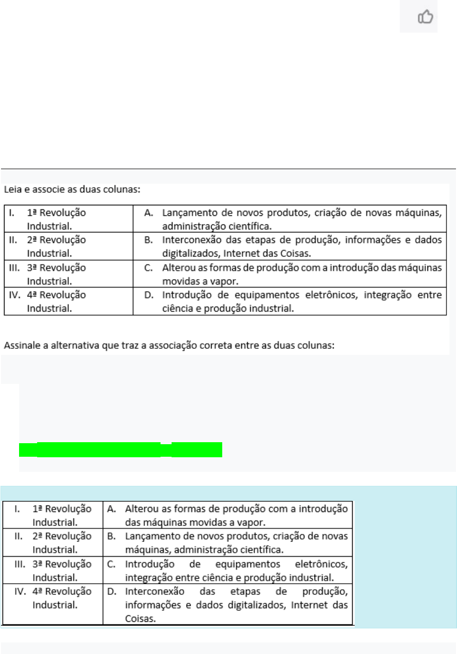 UNOPAR – ANHANGUERASe foi útil, dê uma curtida! ESPECIALIZAÇÃO Educação 4.0: conceito, perspectivas e desafios VALOR: 10 Nota: 10 Prepare-se! Chegou a hora de você testar o conhecimento adquirido nesta disciplina. A Avaliação Virtual (AV) é composta por questões objetivas e corresponde a 100% da média final. Você tem até cinco tentativas para “Enviar” as questões, que são automaticamente corrigidas. Você pode responder as questões consultando o material de estudos, mas lembre-se de cumprir o prazo estabelecido. Boa prova! Parte superior do formulário 1) Alternativas: · I – C; II – B; III – A; IV – D. · I – D; II – C; III – B; IV – A. · I – B; II – A; III – D; IV – C. · I – C; II – A; III – D; IV – B. CORRETO · I – B; II – D; III – A; IV – C. Resolução comentada: Código da questão: 52198 2) Leia o trecho: Desafios – A preparação do aluno para o mercado de trabalho e os desafios da vida no futuro foram alguns dos assuntos abordados no fórum. O presidente do Lide, Fernando Furlan, e a presidente do Instituto Ayrton Senna, Viviane Senna, demonstraram a importância de focar no futuro da educação brasileira. “Precisamos dessa intensidade que vemos na campanha política, essa paixão, direcionada à educação e inovação”, declarou Furlan. “Há muito tenho dito que inclusão digital significa inclusão social. No final das contas, o jovem se prepara para a vida, e a educação é um passaporte importantíssimo. É preciso debater a ineficiência do sistema e a recorrência das questões, principalmente do ensino básico, que muda a criança e a prepara para o futuro. Que esses debates possam ter um efeito multiplicador para que tenhamos um Brasil diferente e muito mais eficiente na área de educação.” Viviane Senna lembrou que o preço de uma educação ineficiente pode ser bem alto. “A questão da educação é crítica, crucial para o desenvolvimento do país”, disse. “Nós sabemos que o custo de não ter educação é altíssimo e todos estão pagando hoje no cenário político, econômico e social. Há uma relação muito importante entre educação e o mundo de inovação, da imensa revolução tecnológica pela qual nós estamos atravessando.” (Fonte: BRASIL, 2018.) O trecho apresenta uma fala proferida em 16 de outubro de 2018, tratando dos impactos da educação na economia do país; segundo as opiniões apresentadas, pode-se dizer que: Alternativas: · Quando a educação não segue os direcionamentos da economia, está fadada a se tornar obsoleta. · A baixa qualidade na educação causa prejuízos diretos nas questões sociais. · A educação não avança como deveria por receber os mesmos incentivos financeiros que a política. · A relação entre educação e economia é direta, pensando-se a formação daqueles que atuarão no mercado de trabalho. CORRETO · A educação não é vista como aquela que vai sustentar a mão de obra para o mercado de trabalho emergente. Resolução comentada: as duas opiniões falam da importância da educação para a economia – principalmente ao se falar do mercado de trabalho e do desenvolvimento tecnológico. Código da questão: 52202 3) Sobre as tecnologias aplicadas à educação, atribua V (verdadeiro) ou F (falso): ( ) Com as TICs, o que mudou foi apenas o modo de disponibilização dos conteúdos. ( ) A produção de conhecimento foi modificada por conta, também, da velocidade da informação. ( ) Barreiras culturais são transpostas, já que todos os alunos podem visitar outros lugares e conhecer outras culturas. ( ) A disponibilização de todo conteúdo pode originar o problema de qualidade no conteúdo acessado, já que tudo é disponibilizado do mesmo modo e sem filtro. Em seguida, assinale a alternativa que contenha a sequência correta: Alternativas: · F – F – V – V. · F – V – F – V. CORRETO · V – V – F – F. · F – V – V – F. · V – V – F – V. Resolução comentada: a primeira é falsa, pois não mudou apenas o modo de disponibilização: o próprio conteúdo sofreu modificações para que fosse adequada a cada tecnologia. A segunda é verdadeira, já que os meios tecnológicos possibilitam acompanhar o surgimento de novidades em todos os âmbitos. A terceira é falsa, pois as barreiras culturais são transpostas pela possibilidade de serem acessadas por meio da internet, e não pela visita dos alunos. A quarta é verdadeira, pois o grande número de informações disponibilizado não permite filtro de qualidade e, assim, tanto conteúdos verdadeiros quanto falsos são divulgados. Código da questão: 52223 4) Leia e associe as duas colunas Assinale a alternativa que traz a associação correta entre as duas colunas: Alternativas: · I – C; II – A; III – B. CORRETO · I – A; II – B; III – C. · I – B; II – C; III – A. · I – C; II – B; III – A. · I – B; II – A; III – C. Resolução comentada: enquanto defensora dos valores estabelecidos para um grupo social, a educação tradicional busca uma transformação cada vez menor, para que sejam preservados os valores educacionais, por exemplo, que põe o professor como mais importante no processo (é preciso permanecer do modo como já é). A Educação 4.0 está diretamente relacionada ao mundo do trabalho, utilizando-se das novas metodologias (ativas) para desenvolver novas habilidades na aprendizagem, e tentando responder às necessidades que a sociedade contemporânea apresenta. Código da questão: 52207 5) Sobre as características da Indústria 4.0, leia as afirmativas abaixo e assinale-as com V (verdadeiro) ou F (falso): ( ) Robôs avançados: são empregados apenas para executar atividades repetitivas, para que o homem não precise se desgastar com elas. ( ) Internet das Coisas: operação de equipamentos a distância, por meio da conexão com a internet, permite realizar processos, acionar máquinas, controlar si