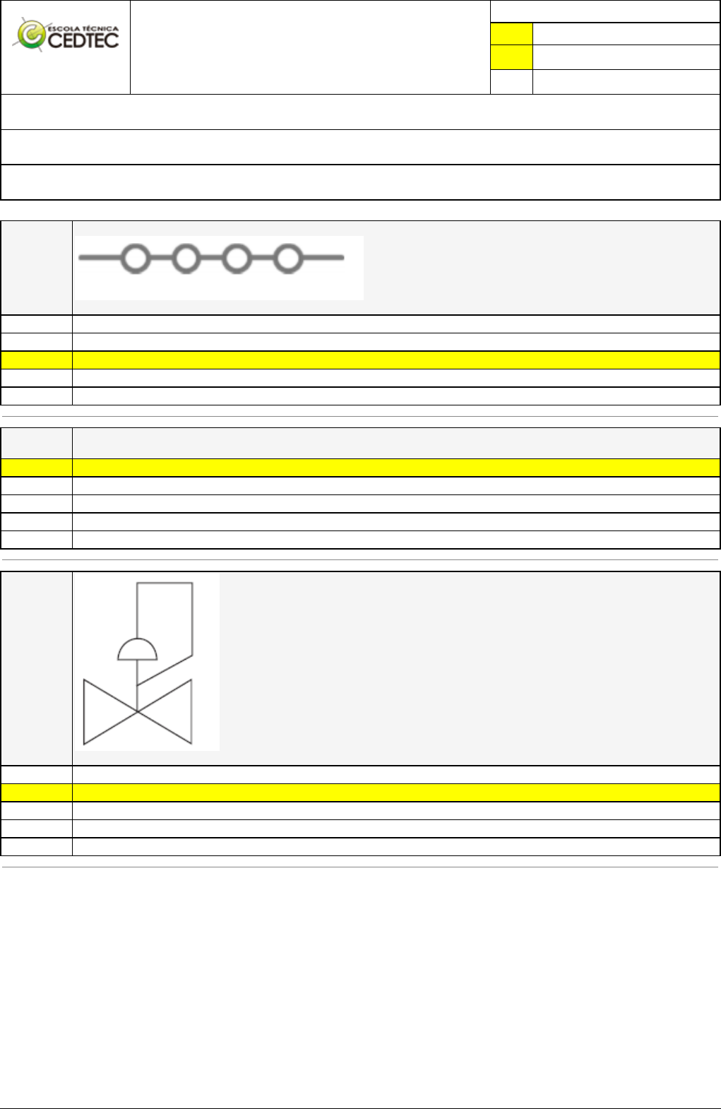 Pincel Atômico - 24/08/2023 00:50:28 1/2 JARDEL SIMAO DOS SANTOS CAMINHO DO CONHECIMENTO Atividade finalizada em 24/08/2023 00:50:19 (tentativa: 2) LEGENDA Resposta correta na questão # Resposta correta - Questão Anulada X Resposta selecionada pelo Aluno Disciplina: AUTOMAÇÃO ELÉTRICA [capítulos - 113] - Avaliação com questões, com o peso total de 4,33 pontos Turma: Curso Técnico: Eletrotécnica - Grupo: EAD - 07/23 - EAD ELE [94181] Aluno(a): 91480068 - JARDEL SIMAO DOS SANTOS - Respondeu 3 questões corretas, obtendo um total de 3,25 pontos como nota Questão 001 Considere a imagem abaixo. A simbologia ilustrada, utilizada em projetos de automação de processos industriais, corresponde: A) À ligação mecânica. B) Ao sinal elétrico. X C) Ao sinal de software. D) Ao sinal pneumático. E) Ao tubo capilar. Questão 002 Atuadores são dispositivos responsáveis pela variação de parâmetros do processo a ser controlado. Esses equipamentos recebem sinais de comando provenientes de controladores e agem sobre o sistema. São dispositivos atuadores, EXCETO: X A) Paquímetros B) Compressores C) Válvulas hidráulicas D) Bombas E) Motores elétricos Questão 003 De acordo com a Norma ISA RP 5.1, que válvula de controle o símbolo acima representa? A) Atuador hidráulico X B) Auto atuada de diafragma C) Atuador pneumático D) Atuador elétrico E) Transmissão pneumática Pincel Atômico - 24/08/2023 00:50:28 2/2 Questão 004 A Norma S51 ISA (International Society of Automation) estabelece os símbolos gráficos para identificação dos instrumentos e dos sistemas de instrumentação usados para medição e controle. De acordo com a Norma S51 ISA, o símbolo da figura representa um instrumento: A) Indicador controlador de umidade, montado no painel principal de controle. B) Controlador independente multivariável, montado atrás do painel principal de controle. C) Controlador independente de temperatura, montado atrás do painel principal de controle. X D) Indicador controlador multivariável, montado no painel principal de controle. E) Controlador independente de umidade, montado atrás do painel principal de controle.