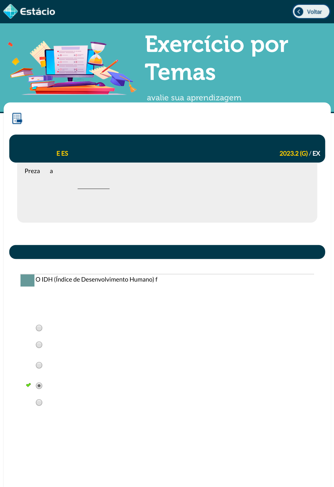 Exercício por Temas avalie sua aprendizagem O IDH (Índice de Desenvolvimento Humano) foi criado pelo Programa das Nações Unidas para o Desenvolvimento (PNUD), para medir a qualidade de vida e desenvolvimento social e econômico dos países, sendo representado por um valor de 0 a 1. Para compor o IDH, alguns indicadores são calculados. A seguir estão listados alguns dos indicadores calculados. Assinale a alternativa que traz um indicador que NÃO compõem o IDH: FUNDAMENTOS DA EPIDEMIOLOGIA E ESTATÍSTICA ROSANA VAZ RIBEIRO 202203383401 FUND EPIDEM E ES 2023.2 (G) / EX Prezado (a) Aluno(a), Você fará agora seu EXERCÍCIO! Lembre-se que este exercício é opcional, mas não valerá ponto para sua avaliação. O mesmo será composto de questões de múltipla escolha. Após responde cada questão, você terá acesso ao gabarito comentado e/ou à explicação da mesma. Aproveite para se familiarizar com este modelo de questões que será usado na sua AV e AVS. 02422 - INTRODUÇÃO À EPIDEMIOLOGIA 1. o coe�ciente de adultos alfabetizados, ou seja, o percentual de indivíduos com idade superior a 15 anos capazes de ler e escrever em relação ao número de habitantes na mesma faixa etária. a expectativa de vida ao nascer, pois ter uma vida longa e saudável re�ete a qualidade do acesso aos serviços de saúde e a qualidade dos próprios serviços de saúde. o coe�ciente bruto de frequência à escola, ou seja, o percentual de indivíduos que frequentam os cursos do ensino fundamental, médio e superior relacionado com o número de habitantes com idade entre 7 e 22 anos da localidade. o número de domicílios com fornecimento de agua em quantidade e qualidade satisfatórias, pois re�ete a situação de saúde e renda da população. a paridade do poder de compra, que compara o quanto a moeda de determinado país pode comprar em termos internacionais, ou seja, comparada com o dólar estadunidense. Data Resp.: 22/08/2023 13:29:36 Explicação: Para compor o IDH os indicadores calculados são esperança de vida ao nascer, coe�ciente de adultos alfabetizados, coe�ciente bruto de frequência à escola, paridade do poder de compra e produto interno bruto per capta. O número de domicílios com água disponível de qualidade não é avaliando, assim não compõem o IDH. javascript:voltar(); javascript:voltar(); (SES/SC-2012) Em termos gerais, os indicadores de saúde são medidas-síntese que contêm informação relevante sobre determinados atributos e dimensões do estado de saúde, bem como do desempenho do sistema de saúde. Em relação aos indicadores de saúde, assinale a alternativa correta. O Índice de Desenvolvimento Humano (IDH) tem por objetivo medir a qualidade de vida e desenvolvimento social e econômico dos países. Nesse contexto, quais são os critérios considerados na construção desse indicador? (COPERVE/UFSC-2018) Em geral, números absolutos de casos de doenças ou mortes não são utilizados para avaliar o nível de saúde, pois não levam em conta o tamanho da população. Dessa forma, os indicadores de saúde são construídos por meio de razões, em forma de proporções, coe�cientes ou índices. Sobre a mortalidade proporcional por idade, é correto a�rmar que: 2. O coe�ciente de incidência da doença representa o risco de ocorrência de novos casos de uma doença na população. O coe�ciente de prevalência da doença representa o risco de ocorrência de novos casos de uma doença na população. O coe�ciente de mortalidade infantil representa a proporção de óbitos de crianças do nascimento até os quatro anos, onze meses e vinte e nove dias de idade. O coe�ciente de mortalidade infantil precoce representa a proporção de óbitos de crianças de 0 a 27 dias (inclusive) em relação ao total de nascidos vivos (por 1000). O coe�ciente de mortalidade geral representa a proporção de óbitos entre os casos da doença, sendo um indicativo da gravidade da doença ou agravo na população. Data Resp.: 22/08/2023 13:30:26 Explicação: A incidência representa os casos novos ocorridos em determinada população dentro de um determinado intervalo. O coe�ciente de mortalidade geral tem no seu denominador o número de habitantes e não os casos da doença, esse seria um coe�ciente de letalidade. Além disso, o coe�ciente de mortalidade neonatal é que representa os óbitos de 0 a 27 dias em relação ao total de nascidos vivos. A prevalência indica o total de casos e não apenas os novos e o coe�ciente de mortalidade infantil inclui crianças de até um ano de idade. 3. Produto interno bruto per capta, esperança de vida ao nascer e coe�ciente de adultos alfabetizados. Paridade do poder de compra, escolaridade média de adultos e esperança de vida ao nascer. Coe�ciente bruto de frequência à escola, esperança de vida ao nascer e estado nutricional infantil. Esperança de vida ao nascer, índice de criminalidade e coe�ciente de adultos alfabetizados. Estado nutricional infantil, índice de criminalidade e escolaridade média de adultos. Data Resp.: 22/08/2023 13:31:05 Explicação: A construção do IDH incorpora três dimensões (saúde, renda e educação) incluindo os seguintes critérios: esperança de vida ao nascer, coe�ciente de adultos alfabetizados, coe�ciente bruto de frequência à escola, paridade do poder de compra e produto interno bruto per capta. Estado nutricional infantil, índice de criminalidade e Paridade do poder de compra não compõem o IDH. 4. Os dados coletados em estudos epidemiológicos são utilizados para calcular coe�cientes e índices, que contribuirão para a análise da situação de saúde de uma população. Sobre os coe�cientes e índices avalie as assertivas a seguir: I - Os coe�cientes, também chamados de taxas, têm por objetivo mensurar uma probabilidade, ou seja, o risco de um indivíduo ser acometido pelo evento estudado. II - Já os índices, também chamados de propor