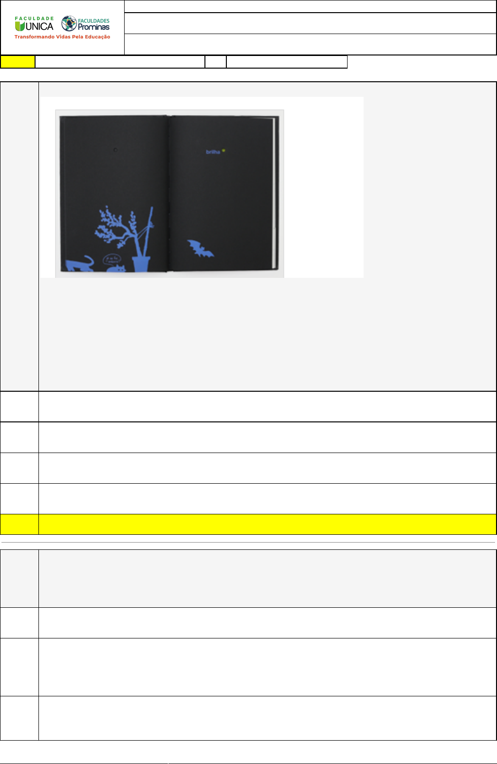 03/09/2023 10:03:35 1/5 REVISÃO DE SIMULADO Nome: POLIANA PEREIRA DA SILVA DE OLIVEIRA Disciplina: Literatura Infanto Juvenil Respostas corretas são marcadas em amarelo X Respostas marcardas por você. Questão 001 1. Observe a imagem abaixo do livro Na noite escura, de Bruno Munari 2. Note que o livro possui uma composição pouco comum no meio editorial: folhas pretas, ilustrações em silhuetas nas cores azuis, mescla de tipografias, pouco texto, um furo na parte superior das duas páginas. Na página da esquerda, o balão de fala que sai do gato diz: “Já se foi?”. Na página da direita, ao lado do furo amarelo, está a palavra “brilha”. Nesse sentido, é possível afirmar que A) Na noite escura é uma história em quadrinhos pois utiliza o balão de fala para expressar a fala do personagem representada pelo gato X B) Na noite escura não é considerado um livro da área de literatura, pois apresenta um formato típicos de livro de artista C) Na noite escura é um livro com ilustração, uma vez que há a presença do texto verbal. D) Na noite escura é um livro imaginativo, pois relaciona texto e imagem de uma forma criativa. E) Na noite escura é um livro objeto, pois desenvolve a sua narrativa interagindo texto, imagem, além dos aspectos gráficos e plásticos de forma consciente Questão 002 Icônico se entende por representação ou reprodução que é exata ou fidedigna, pois tem como qualidade, no âmbito do estudo semiótico, ter a propriedade de representar o mundo objetivo por semelhança ou ser a imagem, isto é, representação de um objeto real. O termo “icônico” está associado à ideia de: A) Ícone, que não pode se vincular a um tipo de representação, sendo capaz apenas de simbolizar uma determinada época, cultura ou área de conhecimento, por exemplo. B) Ícone, que pode se vincular a um tipo de representação, sendo capaz de simbolizar uma determinada época, cultura ou área de conhecimento, por exemplo. Também pode simbolizar alguém muito famoso na área literária ao qual não queremos dar o devido destaque. C) Ícone, que pode se vincular a um tipo de representação, sendo capaz de simbolizar uma determinada época, mas não podemos usar esse termo para simbolizar cultura ou área de conhecimento, por exemplo. 03/09/2023 10:03:35 2/5 D) Ícone, que pode se vincular a um tipo de representação, porém não é capaz de simbolizar uma determinada época, cultura ou área de conhecimento, por exemplo. X E) Ícone, que pode se vincular a um tipo de representação, sendo capaz de simbolizar uma determinada época, cultura ou área de conhecimento, por exemplo. Questão 003 Para Nikolajeva e Scott (2011) os paratextos, como títulos, capas ou guardas, podem ser relevantes para a construção da narrativa do livro ilustrado. Assim, a narrativa principal pode se integrar a esses paratextos. Desse modo, analise as capas de frente e verso do livro “O outro lado”, de Istvan Banyai: Sobre a relação entre a capa de frente e de verso do livro, assim como a orelha do lado esquerdo, podemos concluir: A) Que as capas dialogam com o significado do título “O outro lado”, pois numa cena aparece uma criança olhando por um espaço em que, do outro lado, está um cachorro. Assim como na orelha do lado esquerdo a ilustração do autor está de costas para o leitor. B) Que exceto as orelhas do livro, as capas, tanto de frente e verso, podem ser consideradas paratextos, como é possível perceber em O outro lado. C) Que o Outro lado não possui paratextos, visto que os elementos pré-textuais não podem sem integrados à narrativa dos livros ilustrados. D) Que o autor de O outro lado não entende o paratexto como um recurso criativo para a sua obra, visto que não se utiliza dos elementos pré-textuais para potencializar a narrativa do livro imagem. X E) Que as capas, lidas em conjunto, não estabelecem conexão com o título “O outro lado” que, aparece espelhado tanto na parte amarela quanto na parte preta das capas de frente e verso. 03/09/2023 10:03:35 3/5 Questão 004 Analise a imagem das capas do livro Aperte aqui, de Hervé Tullet, abaixo: Considerando a proposta do livro demonstrada na imagem acima, é possível afirmar que este é um livro-objeto lúdico. Desse modo, pode ser classificado como A) livro-imagem, pois a imagem é predominante. B) história em quadrinhos, pois mescla texto verbal e visual. C) livro com ilustração, pois a palavra é predominante. D) imaginativos, pois as imagens representam textos. X E) livro interativo, pois requer a interação do leitor. Questão 005 Nikolajeva e Scott (2011) consideram os paratextos (títulos, capas ou guardas) ainda mais importantes no livro ilustrado, em relação ao romance. De modo que a capa pode ser um elemento importante, isto é, integrar a narrativa. Nesse caso, a narrativa pode iniciar já na capa, como é o caso de Abra este pequeno livro, de Klaumeier e Lee. As guardas iniciais e finais podem tanto fornecer boas informações sobre a obra, como complementá-la ou contradizê-la. Em resumo, podemos concluir que: A) A capa é uma parte importante do livro. Elas podem agregar informações, complementá-las e até contradizê-las. Sendo ela, mas ela não pode compor a narrativa. X B) A capa é uma parte importante do livro. Elas podem agregar informações, complementá-las e até contradizê-las. Sendo ela, inclusive, capaz de entregar à narrativa. C) A capa é uma forma de abrilhantar o livro e de convencer o leitor que aquele é o melhor livro. Elas podem agregar informações, complementá-las e até contradizê-las. Sendo ela, inclusive, capaz de entregar à narrativa. D) A capa nem sempre é lida mesmo sendo um aparte importante do livro. Elas podem agregar informações, complementá-las e até contradizê-las. Sendo ela, inclusive, capaz de entregar à narrativa. E) A capa é uma parte importante do livro. Só que elas não podem agregar informações, complementá-las e