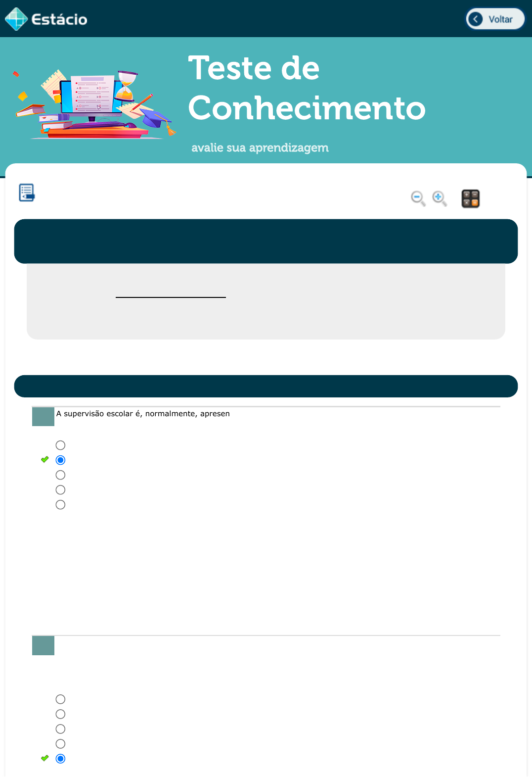 06/12/22, 17:12 Estácio: Alunos https://simulado.estacio.br/alunos/ 1/5 Teste de Conhecimento avalie sua aprendizagem A supervisão escolar é, normalmente, apresentada por meio de problemas, mas é fundamental que ela seja capaz de desenhar e propor soluções. O Supervisor Escolar, para realizar um diagnóstico, deve prioritariamente: De acordo com Freire, a ação pedagógica, em qualquer instância, apresenta três dimensões. Essas dimensões também estão apresentadas à supervisão. (FREITAS, A. L. de S. Pedagogia da conscientização: um legado de Paulo Freire à formação de professores. Porto Alegre: EDIPUCRS, 2011.), Quais são estas dimensões descritas por Freire? SUPERVISÃO E ORIENTAÇÃO EDUCACIONAL Lupa Calc. DGT0763_202001347755_TEMAS Aluno: ANDERSON NOGUEIRA Matr.: 202001347755 Disc.: SUPERVISÃO E ORIEN 2022.3 EAD (G) / EX Prezado (a) Aluno(a), Você fará agora seu TESTE DE CONHECIMENTO! Lembre-se que este exercício é opcional, mas não valerá ponto para sua avaliação. O mesmo será composto de questões de múltipla escolha. Após responde cada questão, você terá acesso ao gabarito comentado e/ou à explicação da mesma. Aproveite para se familiarizar com este modelo de questões que será usado na sua AV e AVS. OBJETOS DE ESTUDO, FORMAÇÃO E ATUAÇÃO 1. coletar somente dados da realidade física da escola. ouvir todos os segmentos da escola para definir suas necessidades. conversar com os pais de alunos e mostrar-lhes a escola. chamar os funcionários da escola e ouvi-los em particular. chamar os pais e responsáveis e ouvir suas queixas a respeito da disciplina. Data Resp.: 06/12/2022 16:51:32 Explicação: Quando se trabalha necessidade de criar mecanismos se discute as portas abertas, como a escola é necessariamente polifônica, composta por muitas vozes. Cabe ao supervisor buscar reconhecer que não basta sua opinião sim a perspectiva de investigar todas as possibilidades possíveis notando formas de transformar os problemas enfrentados em soluções. 2. Dimensões política, estética e técnico-pedagógico. Dimensão epistemológica, formativa e técnica. Dimensões formativa, política e estética Dimensão estética, política e disciplinar. Dimensões epistemológica, política e estética Data Resp.: 06/12/2022 16:53:46 javascript:voltar(); javascript:voltar(); javascript:diminui(); javascript:aumenta(); javascript:calculadora_on(); 06/12/22, 17:13 Estácio: Alunos https://simulado.estacio.br/alunos/ 2/5 No Projeto Pedagógico pensamos em ação/ transformação, ou seja, o que queremos fazer. Para realizar essa ação transformadora é necessário que o supervisor esteja atento no processo de sua implementação a: (Japeri - RJ / 2013 - adaptada) Em seu artigo I, a lei prevê que a orientação educacional se destina a assistir ao educando, individualmente ou em grupo, no âmbito das escolas e sistemas escolares de nível médio e primário visando ao desenvolvimento integral e harmonioso de sua personalidade, ordenando e integrando os elementos que exercem influência em sua formação e preparando-o para o exercício das opções básicas. Neste sentido, o exercício da profissão de orientador educacional está fundamentado pela: (Seropédica - RJ / 2013 - adaptada) A relação do orientador educacional com os discentes tem uma natureza direta. Além disso deve ter uma relação próxima com o corpo docente da escola, a fim de acompanhar o processo de aprendizagem dos alunos, identificando suas dificuldades e barreiras. Assinale a alternativa CORRETA acerca do fazer pedagógico do Orientador Educacional com o tipo de relação estabelecida com a comunidade escola: Explicação: Para Freire, a ação pedagógica, em qualquer instância, apresenta três dimensões: epistemológica, política e estética. Essas dimensões estão presentes em todas as práticas educativas, mesmo que inconscientemente, muitas vezes, nem percebemos esses caminhos e descaminhos em nossa jornada pedagógica. Ao educar, ensinar, a prática está baseada em uma ou mais teorias, o trabalho é voltado para a manutenção do sistema ou por sua transformação, e sentimentos estão envolvidos nessa ação, sejam eles positivos ou negativos. 3. contratar supervisores renomados para que construam o sonho desejado. localizar o melhor professor / gestor no grupo para a ação caminhar. conhecer as necessidades e limites da escola. conhecer outros projetos pedagógicos e os que resultaram em sucesso. localizar os parceiros da discussão que empreendam a ação por nós. Data Resp.: 06/12/2022 16:58:05 Explicação: O supervisor pedagógico escolar deve ser o primeiro atento às dificuldades da própria escola. O PPP, uma vez definido, deve ser definido levando em consideração as características da escola e suas necessidades. Mais que isso, na sua implementação deve ser tomado em conta pelo supervisor que estratégias, faseamentos, pensando especialmente quais são as necessidades e os limites que a própria escola leva para sua realidade. A ideia de buscar melhores professores conhecer outros professores contratar supervisores para fazer a função não estão previstas entendidas dentro desse escopo dessa função. OBJETOS DE ESTUDO, FORMAÇÃO E ATUAÇÃO 4. Lei nº 5564, de 21 de dezembro de 1978 Lei nº 5564, de 21 de dezembro de 1968 Lei nº 4024, de 20 de setembro de 1961 Lei nº 4024, de 21 de setembro de 1968 Lei nº 9394, de 20 de setembro de 1961 Data Resp.: 06/12/2022 16:59:32 Explicação: Gabarito: Lei nº 5564, de 21 de dezembro de 1968 Justificativa: Essa questão aborda a origem e desenvolvimento da Orientação Educacional no Brasil. Várias foram as legislações que abordaram esse tema ao longo da história. É importante que o profissional dessa área conheça a legislação que regula e fundamenta sua atuação, bem como as legislações que regulamentam a educação no país, como a Lei de Diretrizes e Bases da Educação Nacional, e que proteg