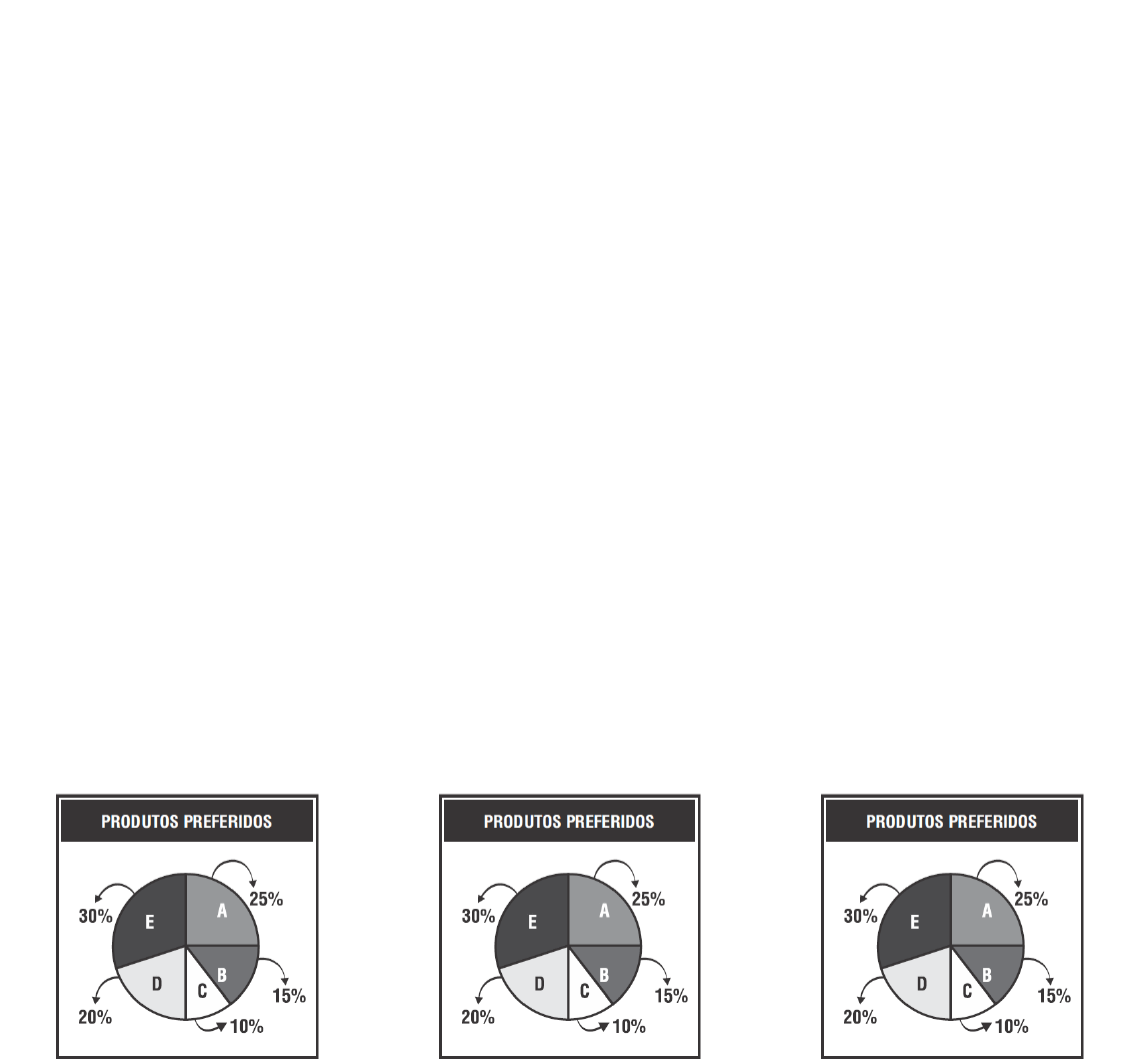 01. Júnior comprou uma chuteira em uma promoção com 15% de desconto. Antes dessa promoção, a chuteira custava R$ 320,00. Qual foi o valor pago por Júnior ao comprar essa chuteira? A) R$ 48,00 B) R$ 298,66 C) R$ 272,00 D) R$ 305,00 02. Lucas tem uma dívida de R$ 5 000,00 com o banco. Este mês, ele conseguiu pagar 30% dessa dívida. Qual foi a quantia dessa dívida paga por Lucas ao banco neste mês? A) R$ 30,00 B) R$ 50,00 C) R$ 1 500,00 D) R$ 3 500,00 03. Após uma reforma e a compra de novos aparelhos, a mensalidade de uma academia que custava R$ 52,00 teve um aumento de 75%. Qual é o preço da mensalidade após esse aumento? A) R$ 75,00 B) R$ 87,00 C) R$ 91,00 D) R$ 127,00 04. Marina quer comprar uma mochila que custa R$ 60,00, mas, para pagamento à vista, a loja oferece um desconto de 5%. Se Marina optar pelo pagamento à vista, ela vai pagar? A) R$ 30,00 B) R$ 55,00 C) R$ 57,00 D) R$ 59,70 05. Mauro pagava, mensalmente, R$ 1150,00 referente ao aluguel do apartamento em que mora. No entanto, ele foi notificado que, no próximo mês, o aluguel terá um aumento de 6% sobre o valor atual. Com esse aumento, o valor do aluguel do apartamento de Mauro passará a ser A) R$ 1 081,00. B) R$ 1 156,00. C) R$ 1 219,00. D) R$ 1 840,00. 06. Patrícia tinha R$ 6 000,00 em sua poupança no banco. Ela utilizou 40% desse valor para fazer uma viagem. Quanto desse valor Patrícia utilizou para fazer essa viagem? A) R$ 40,00 B) R$ 60,00 C) R$ 2 400,00 D) R$ 3 600,00 07. Uma empresa de cosméticos lançou no mercado 5 produtos diferentes: A, B, C, D e E. O gráfico abaixo mostra o resultado de uma pesquisa feita para verificar a preferência dos consumidores em relação a esses produtos. Se foram entrevistados 2400 consumidores, defina a quantidade de pessoas que preferem cada produto. 01. Júnior comprou uma chuteira em uma promoção com 15% de desconto. Antes dessa promoção, a chuteira custava R$ 320,00. Qual foi o valor pago por Júnior ao comprar essa chuteira? A) R$ 48,00 B) R$ 298,66 C) R$ 272,00 D) R$ 305,00 02. Lucas tem uma dívida de R$ 5 000,00 com o banco. Este mês, ele conseguiu pagar 30% dessa dívida. Qual foi a quantia dessa dívida paga por Lucas ao banco neste mês? A) R$ 30,00 B) R$ 50,00 C) R$ 1 500,00 D) R$ 3 500,00 03. Após uma reforma e a compra de novos aparelhos, a mensalidade de uma academia que custava R$ 52,00 teve um aumento de 75%. Qual é o preço da mensalidade após esse aumento? A) R$ 75,00 B) R$ 87,00 C) R$ 91,00 D) R$ 127,00 04. Marina quer comprar uma mochila que custa R$ 60,00, mas, para pagamento à vista, a loja oferece um desconto de 5%. Se Marina optar pelo pagamento à vista, ela vai pagar? A) R$ 30,00 B) R$ 55,00 C) R$ 57,00 D) R$ 59,70 05. Mauro pagava, mensalmente, R$ 1150,00 referente ao aluguel do apartamento em que mora. No entanto, ele foi notificado que, no próximo mês, o aluguel terá um aumento de 6% sobre o valor atual. Com esse aumento, o valor do aluguel do apartamento de Mauro passará a ser A) R$ 1 081,00. B) R$ 1 156,00. C) R$ 1 219,00. D) R$ 1 840,00. 06. Patrícia tinha R$ 6 000,00 em sua poupança no banco. Ela utilizou 40% desse valor para fazer uma viagem. Quanto desse valor Patrícia utilizou para fazer essa viagem? A) R$ 40,00 B) R$ 60,00 C) R$ 2 400,00 D) R$ 3 600,00 07. Uma empresa de cosméticos lançou no mercado 5 produtos diferentes: A, B, C, D e E. O gráfico abaixo mostra o resultado de uma pesquisa feita para verificar a preferência dos consumidores em relação a esses produtos. Se foram entrevistados 2400 consumidores, defina a quantidade de pessoas que preferem cada produto. 01. Júnior comprou uma chuteira em uma promoção com 15% de desconto. Antes dessa promoção, a chuteira custava R$ 320,00. Qual foi o valor pago por Júnior ao comprar essa chuteira? A) R$ 48,00 B) R$ 298,66 C) R$ 272,00 D) R$ 305,00 02. Lucas tem uma dívida de R$ 5 000,00 com o banco. Este mês, ele conseguiu pagar 30% dessa dívida. Qual foi a quantia dessa dívida paga por Lucas ao banco neste mês? A) R$ 30,00 B) R$ 50,00 C) R$ 1 500,00 D) R$ 3 500,00 03. Após uma reforma e a compra de novos aparelhos, a mensalidade de uma academia que custava R$ 52,00 teve um aumento de 75%. Qual é o preço da mensalidade após esse aumento? A) R$ 75,00 B) R$ 87,00 C) R$ 91,00 D) R$ 127,00 04. Marina quer comprar uma mochila que custa R$ 60,00, mas, para pagamento à vista, a loja oferece um desconto de 5%. Se Marina optar pelo pagamento à vista, ela vai pagar? A) R$ 30,00 B) R$ 55,00 C) R$ 57,00 D) R$ 59,70 05. Mauro pagava, mensalmente, R$ 1150,00 referente ao aluguel do apartamento em que mora. No entanto, ele foi notificado que, no próximo mês, o aluguel terá um aumento de 6% sobre o valor atual. Com esse aumento, o valor do aluguel do apartamento de Mauro passará a ser A) R$ 1 081,00. B) R$ 1 156,00. C) R$ 1 219,00. D) R$ 1 840,00. 06. Patrícia tinha R$ 6 000,00 em sua poupança no banco. Ela utilizou 40% desse valor para fazer uma viagem. Quanto desse valor Patrícia utilizou para fazer essa viagem? A) R$ 40,00 B) R$ 60,00 C) R$ 2 400,00 D) R$ 3 600,00 07. Uma empresa de cosméticos lançou no mercado 5 produtos diferentes: A, B, C, D e E. O gráfico abaixo mostra o resultado de uma pesquisa feita para verificar a preferência dos consumidores em relação a esses produtos. Se foram entrevistados 2400 consumidores, defina a quantidade de pessoas que preferem cada produto.