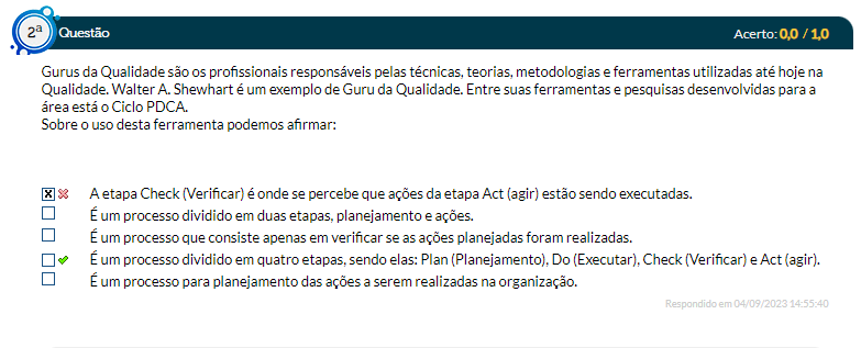 Gurus da Qualidade são os profissionais responsáveis pelas metodologias e ferramentas utilizadas até hoje na Qualidade. Walter A. Shewhart é um exemplo de Guru da Qualidade. Entre suas ferramentas e pesquisas desenvolvidas para a O Ciclo PDCA. Sobre uso desta ferramenta podemos afirmar: