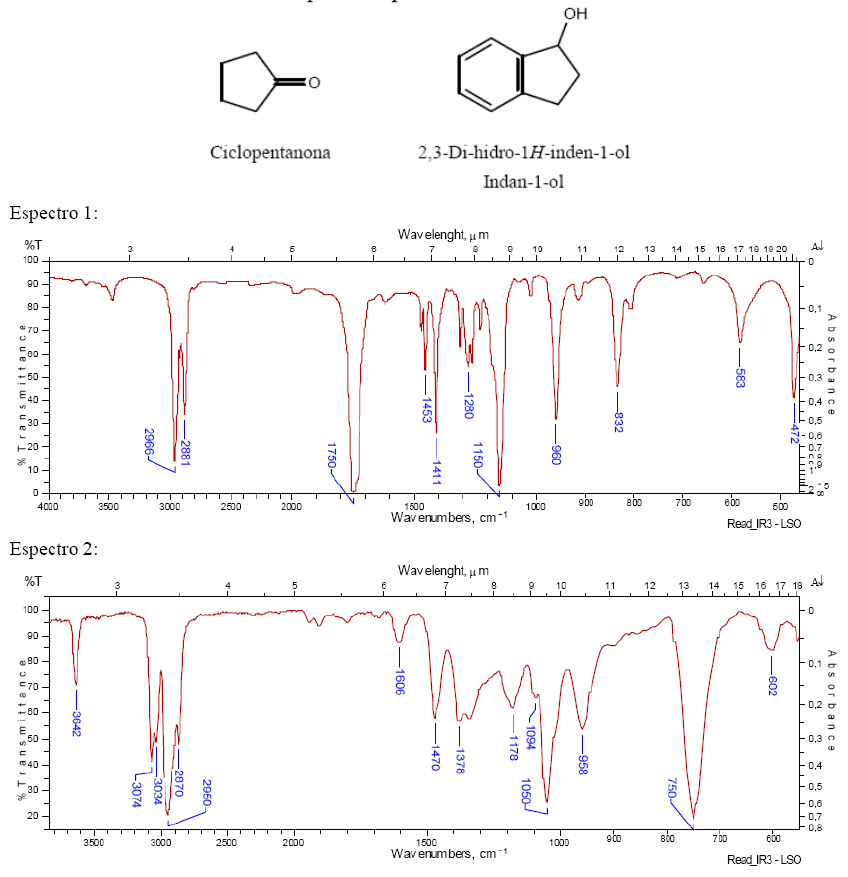 UNIVERSIDADE FEDERAL DO AMAPÁ CURSO DE FARMÁCIA DISCIPLINA: QUÍMICA ORGÂNICA PROFESSORA: SHEYLLA SUSAN MOREIRA DA SILVA DE ALMEIDA EXERCÍCIOS 1. Os dois espectros abaixo correspondem à ciclopentanona e ao 2,3-di-hidro-1H-inden- 1-ol (fórmulas a seguir). Qual espectro corresponde a qual estrutura? 2. Abaixo é mostrado o espectro de infravermelho do éter alílico e fenílico. Aquecendo este éter a refluxo (sem solvente) por 5-6 horas, obtém-se um óleo do qual podemos extrair, com solução aquosa de hidróxido de sódio a 20 %, um certo material; acidulando esta solução aquosa, extraindo com solvente, secando e evaporando, obtém- se finalmente o produto cujo espectro de infravermelho é mostrado adiante. Proponha uma estrutura para o produto final e um mecanismo para a reação. 3. O espectro mostrado a seguir é de um composto de fórmula C10H14. (a) Calcule o número de insaturações. (b) Pelo número de insaturações você acha que o composto poderia ser um aromático derivado do benzeno? (c) Pelo espectro de infravermelho o que você conclui? É aromático ou não? 4. Os espectros a seguir correspondem aos xilenos (dimetilbenzenos) orto, meta e para. Qual corresponde a qual? 5. Cada um dos três espectros a seguir pertence a cada um dos três possíveis isômeros do trimetilbenzeno. Qual é qual? 6. Os seis espectros mostrados adiante correspondem às estruturas representadas a seguir. Decida qual espectro corresponde a qual estrutura. Justifique identificando as principais bandas de cada um. 7. Os dois espectros a seguir correspondem aos isômeros com fórmula C10H20O: um deles é da decan-2-ona e outro é do decanal. Decida qual é qual identificando as principais bandas características. 8. Os dois compostos correspondentes aos espectros a seguir são isômeros, ambos com fórmula molecular C8H8O2. Deduza a fórmula estrutural de cada um identificando as suas principais bandas, considerando que têm estruturas simples e são substâncias comumente encontradas em laboratórios. 9. Uma substância de fórmula C5H9N apresenta o espectro de infravermelho mostrado a seguir. Deduza sua estrutura indicando as principais bandas.. 10. Uma substância de fórmula C8H8O apresenta o espectro de infravermelho mostrado abaixo. Deduza sua estrutura indicando as principais bandas. 11. Deduza a fórmula estrutural indicando as principais bandas da substância correspondente ao espectro abaixo, cuja fórmula molecular é C8H10O. 12. Um composto de fórmula molecular C8H7OCl tem no seu espectro de infravermelho uma absorção característica a 1695 cm-1 e o seu espectro de RMN protônico é o seguinte: Justificar a estrutura do composto. 13. Um composto de fórmula molecular C10H12O tem os espectros de IV e RMN representados na figura. Interpretar. 14. Um composto de fórmula molecular C8H8O apresenta uma banda intensa no infravermelho a 1700 cm-1 e o seguinte espectro de RMN. Propor justificando uma estrutura para o composto. 15 a) O espectro de 1H RMN de uma cetona, com fórmula molecular C6H12O, tem dois sinais (d = 1,2 ppm e d = 2,0 ppm) com intensidades relativas de (3:1). Proponha uma estrutura para esta molécula. b) Existem dois isômeros de fórmula molecular C6H12O2 que são moléculas relacionadas com a cetona descrita na alínea anterior. Os espectros de 1H RMN desses isómeros são os seguintes: Isômero A (d = 1,5 ppm e d = 2,0 ppm) com intensidades relativas de (3:1). Isômero B (d = 1,2 ppm e d = 3,6 ppm) com intensidades relativas de (3:1). Todos estes sinais são singletos. A que classe de compostos pertence estes isômeros? Quais as suas estruturas? 16. Um composto de fórmula molecular C4H10O2 apresenta uma banda larga no infravermelho a 3200 cm-1. O seu espectro de ressonância magnética nuclear protônico apresenta os seguintes sinais e áreas relativas: 1,23 (dupleto, área 3); 1,68 (multipleto, área 2); 3,80 (tripleto, área 2); 4,03 (multipleto, área 1). Propor uma estrutura para este composto. 17. O espectro de RMN de duas substancias isoméricas, com fórmula C10H12O, aparecem a seguir. Identifique as estruturas dos isômeros sabendo que os espectros infravermelhos destas substâncias apresentam bandas ao redor de 1715 cm-1 e na região de 1600 a 1450 cm-1. 18. Os 4 espectros seguintes se referem a espectros de RMN de ésteres aromáticos mono substituídos cuja fórmula molecular corresponde a C10H12O2. Tente identificar as estruturas correspondentes. 19. Uma substancia cuja formula molecular é C5H10O2 apresenta o espectro de RMN indicado abaixo e apresenta bandas intensas em 3450 cm-1 (banda larga) e em 1713 cm-1 no espectro infravermelho. Qual a estrutura desta substancia? 20. O espectro de RMN de 13C do éster C5H8O2 é apresentado a seguir, e as multiplicidades de cada pico (s = singleto, d = dupleto, t = tripleto, q = quarteto), eliminado por desacoplamento de spin, se encontra indicado no espectro. Qual a estrutura da molécula baseado neste espectro, e faça uma atribuição de cada pico no espectro. 21. Segue o espectro RMN de próton e de 13C de uma cetona cuja formula é C7H14O. A partir deste espectro identifique a estrutura desta cetona. 22. O espectro de RMN de próton de uma substancia C8H18 apresenta apenas um sinal a 0,86 ppm. O espectro de 13C por sua vez apresenta 2 picos, um muito intenso a 26 ppm e outro fraco a 35 ppm. A partir destas informações, qual seria estrutura proposta para esta substância. 23. Para o tetracloreto de carbono(1), clorofórmio(2), diclorometano(3) e o cloreto de metila(4) nos espectros de RMN de 13C totalmente acoplados com hidrogênios, quais as ordens crescentes de maior deslocamento químico e maior multiplicidade dos sinais, respectivamente? 24. Como é possível diferenciar seguramente os isômeros do 2-heptenal por RMN de 1H? 25. Abaixo são apresentados dois espectros de RMN 1H. Dentre os compostos 3- pentanol, 2-pentanol, 3-pentamina, 2-pentamina, 2-pentanona, qual corresponde ao espectro A e qual a