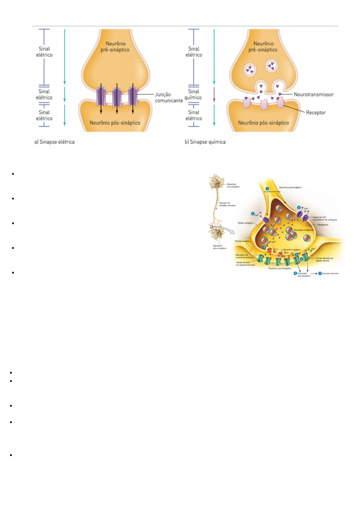 Sinapse Sinapse elétrica A transferência de informação ocorre de forma direta. Os íons se difundem de um neurônio para outro por junções comunicantes. Cada canal da junção comunicante, é formada por dois canais proteicos, chamados de conéxon. Isso forma um canal contínuo qu conecta a membrana de duas células. Cada junção comunicante contém cerca de cem conexinas tubulares, que agem como túneis para conectar o citosol das duas células diretamente. À medida que os íons fluem de uma célula para outra através das conexinas, o potencial de ação espalha-se de uma célula para outra. As junções comunicantes são comuns no músculo liso visceral, no músculo cardíaco e no embrião em desenvolvimento. Elas também ocorrem no encéfalo. Comunicação mais rápida: Em uma sinapse elétrica, o potencial de ação passa diretamente da célula pré-sináptica para a célula pós-sináptica. Sincronização: As sinapses elétricas podem sincronizar (coordenar) a atividade de um grupo de neurônios ou fibras musculares. As sinapses elétricas têm duas vantagens principais: 1. 2. Sinapse química A transmissão de informações vai ocorrer de forma indireta. As membranas plasmáticas dos neurônios pré-sinápticos e pós-sinápticos são separadas pela fenda sináptica, um espaço que é preenchido com líquido intersticial. Nos terminais axoniais do neurônio transmissor, existem vesículas sinápticas, que possuem neuromediadores. Em resposta a um impulso nervoso, o neurônio pré-sináptico libera um neurotransmissor que se difunde através do fluido na fenda sináptica e se liga a receptores na membrana plasmática do neurônio pós-sináptico. O neurônio pós-sináptico recebe o sinal químico e, por sua vez, produz um potencial pós-sináptico. Um impulso nervoso chega a um botão sináptico (ou varicosidade) de um axônio pré-sináptico. A fase de despolarização do impulso nervoso abre canais de Ca2+ dependentes de voltagem que estão presentes na membrana dos botões sinápticos. À medida que as membranas das vesículas fundem-se com a membrana plasmática, as moléculas de neurotransmissores dentro das vesículas são liberadas na fenda sináptica. As moléculas de neurotransmissores difundem-se através da fenda sináptica e se ligam aos receptores de neurotransmissores na membrana plasmática do neurônio pós-sináptico. A ligação de moléculas de neurotransmissores a seus receptores em canais ativados por ligante abre os canais e permite que íons específicos fluam através da membrana. Conforme os íons fluem através dos canais abertos, a voltagem através da membrana muda. Essa alteração na voltagem é um potencial pós-sináptico. Quando um potencial despolarizante pós-sináptico atinge o limiar, ele dispara um impulso nervoso no axônio do neurônio pós-sináptico. 1. 2. 3. 4. 5. 6. 7.