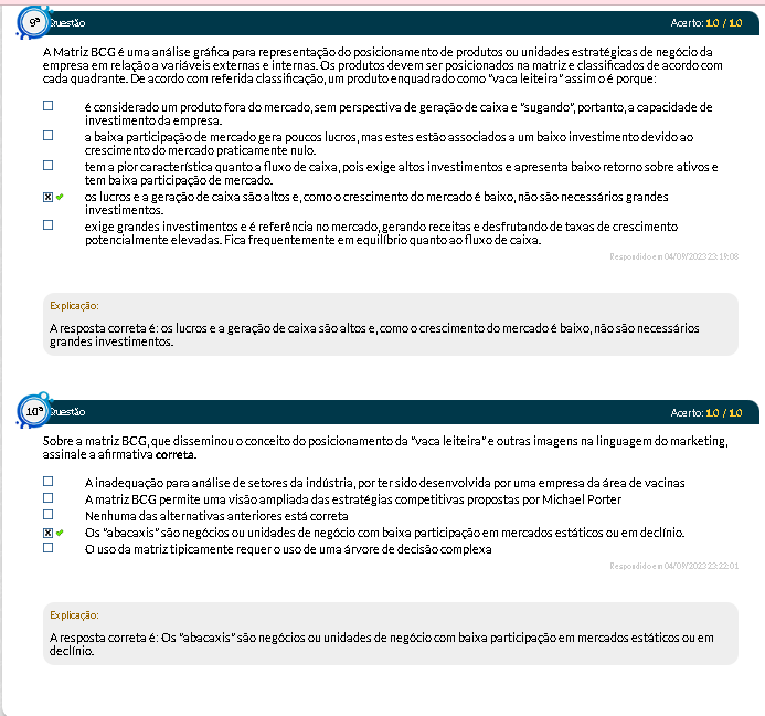 A Matriz BCG é uma análise gráfica para representação do posicionamento de produtos ou unidades estratégicas de negócio da empresa em relação a variáveis externas e internas. Os produtos devem ser posicionados na matrize classificados de acordo com cada quadrante. De acordo com referida classificação, um produto enquadrado como 'vaca' é porque: é considerado um produto fora do mercado, sem perspectiva de geração de caixa e 'sugando', portanto, a capacidade de investimento da empresa. Assinale a afirmativa correta sobre a matriz BCG. A - A inadequação para análise de setores da indústria, por ter sido desenvolvida por uma empresa da área de vacinas. B - A matriz BCG permite uma visão ampliada das estratégias competitivas propostas por Michael Porter. C - Nenhuma das alternativas anteriores está correta. D - Os 'abacaxis' são negócios ou unidades de negócio com baixa participação em mercados estáticos ou em crescimento. E - O uso da matriz tipicamente requer o uso de uma árvore de decisão complexa.
