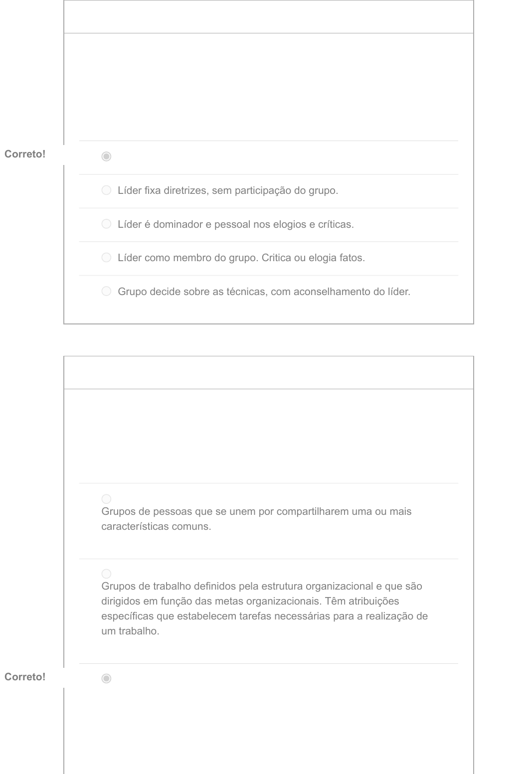 10/04/2023, 21:54 Clique aqui para iniciar a AP2: (UNIGRANRIO - EAD) COMPORTAMENTO ORGANIZACIONAL GRD-0062 (Turma 7) https://afya.instructure.com/courses/59906/quizzes/193913 1/8 2,5 / 2,5 ptsPergunta 1 “Liderança é o processo de influenciar as atividades de um grupo organizado em direção a realização de um objetivo” (RAUCH; BEHLING, apud YUKL, 1998, p. 2-3). Existem três estilos de liderança, sendo autocrática, democrática e liberal. Assinale a alternativa que representa uma característica da liderança liberal: Grupo tem liberdade para dividir as tarefas. Correto!Correto! Líder fixa diretrizes, sem participação do grupo. Líder é dominador e pessoal nos elogios e críticas. Líder como membro do grupo. Critica ou elogia fatos. Grupo decide sobre as técnicas, com aconselhamento do líder. 2,5 / 2,5 ptsPergunta 2 Segundo Robbins (2010), um grupo é definido como dois ou mais indivíduos, interdependentes e interativos, que se reúnem visando à obtenção de determinado objetivo. Assinale a opção que corresponde ao conceito de grupos de comando. Grupos de pessoas que se unem por compartilharem uma ou mais características comuns. Grupos de trabalho definidos pela estrutura organizacional e que são dirigidos em função das metas organizacionais. Têm atribuições específicas que estabelecem tarefas necessárias para a realização de um trabalho. Composto por indivíduos que se reportam diretamente a um superior hierárquico, sendo determinado pelo organograma da organização. Correto!Correto! 10/04/2023, 21:54 Clique aqui para iniciar a AP2: (UNIGRANRIO - EAD) COMPORTAMENTO ORGANIZACIONAL GRD-0062 (Turma 7) https://afya.instructure.com/courses/59906/quizzes/193913 2/8 São formados por pessoas que se reúnem para executar determinada tarefa, não se limitando ao superior hierárquico como na classificação anterior, mas unidos por interesses comuns. Grupos que não são estruturados formalmente, mas que emergem como resposta à necessidade de interação social. 2,5 / 2,5 ptsPergunta 3 Para realizar as funções já definidas e desempenhar os papéis também sinalizados, algumas habilidades são necessárias aos gestores para que atinjam os objetivos das organizações. Correlacione os conceitos com as referidas habilidades e assinale a alternativa que apresenta a sequência correta: 1-Habilidades Técnicas 2-Habilidades Humanas 3-Habilidades Conceituais ( ) Capacidade de trabalhar com outras pessoas, compreendendo as informações e motivando-as, tanto individualmente como em grupos. ( ) Capacidade de aplicação de conhecimentos ou habilidades específicas. ( ) Capacidade cognitiva para analisar informações e diagnosticar situações complexas. 2, 1, 3 Correto!Correto! 3, 2, 1 1, 2, 3 2, 3, 1 1, 3, 2 2,5 / 2,5 ptsPergunta 4 Os valores e as atitudes estão relacionados quando tratamos de um indivíduo. As atitudes refletem uma predisposição individual com 10/04/2023, 21:54 Clique aqui para iniciar a AP2: (UNIGRANRIO - EAD) COMPORTAMENTO ORGANIZACIONAL GRD-0062 (Turma 7) https://afya.instructure.com/courses/59906/quizzes/193913 3/8 relação a alguma situação, mas fundamentalmente envolvem julgamentos que foram feitos em relação a essa situação. Correlacione as três partes da atitude com os seus significados: 1-Afetivo 2-Cognitivo 3-Comportamental ( ) Refere-se a ação que move o comportamento em relação a uma pessoa ou situação. ( ) Refere-se ao afeto e às emoções envolvidas em determinada situação ou direcionadas a uma pessoa. ( ) Refere-se à crença ou opinião acerca de uma pessoa ou situação. 3; 2; 1. 1; 3; 2. 1; 2; 3. 3; 1; 2. Correto!Correto! 2; 3; 1. 2,5 / 2,5 ptsPergunta 5 As empresas também esperam atitudes que demonstrem que o gestor tem profissionalismo, estando preocupado e pronto, desejando aprender. O desenvolvimento da empatia para entender o que o outro precisa e conseguir transmitir o que se deseja também é fundamental, pois independentemente do ramo de atividade escolhido, qualquer gestor vai lidar com pessoas, que precisarão ser compreendidas e ter seus desejos interpretados. A partir disso, existem alguns conceitos que precisam ser conhecidos quando tratamos do processo de aprendizagem, sendo percepção, personalidade, atitudes, inteligência emocional e valores. Assinale a alternativa que representa o conceito de personalidade: É o processo pelo qual os indivíduos organizam e interpretam suas impressões sensoriais com a finalidade de dar sentido ao seu meio. São as convicções básicas de que um modo específico de conduta ou uma condição de existência é individual ou socialmente preferível ao modo oposto. 10/04/2023, 21:54 Clique aqui para iniciar a AP2: (UNIGRANRIO - EAD) COMPORTAMENTO ORGANIZACIONAL GRD-0062 (Turma 7) https://afya.instructure.com/courses/59906/quizzes/193913 4/8 É a capacidade da pessoa de ser autoconsciente do seu estado afetivo (reconhecer suas próprias emoções, quando as sente), detectar as emoções nos outros e administrar as pistas e informações transmitidas pelas emoções. São afirmações avaliatórias, favoráveis ou desfavoráveis com relação a objetos, pessoas e eventos. É a soma total das maneiras como uma pessoa reage e interage com as demais. Correto!Correto! 2,5 / 2,5 ptsPergunta 6 Equipes são grupos que evoluíram, visto que a existênciade uma equipe depende da comunhão de objetivos e da influência dacultura organizacional. Considerando esse conceito, assinale a opção que corresponde a uma característica da equipe: Responsabilidade: Individual Habilidades: Aleatórias e variadas Sinergia: Neutra (às vezes negativa) Meta: Compartilhar informações Meta: Desempenho coletivo Correto!Correto! 10/04/2023, 21:54 Clique aqui para iniciar a AP2: (UNIGRANRIO - EAD) COMPORTAMENTO ORGANIZACIONAL GRD-0062 (Turma 7) https://afya.instructure.com/courses/59906/quizzes/193913 5/8 Características de um grupo: Meta - Compartilham informações Sinergia - Neutros