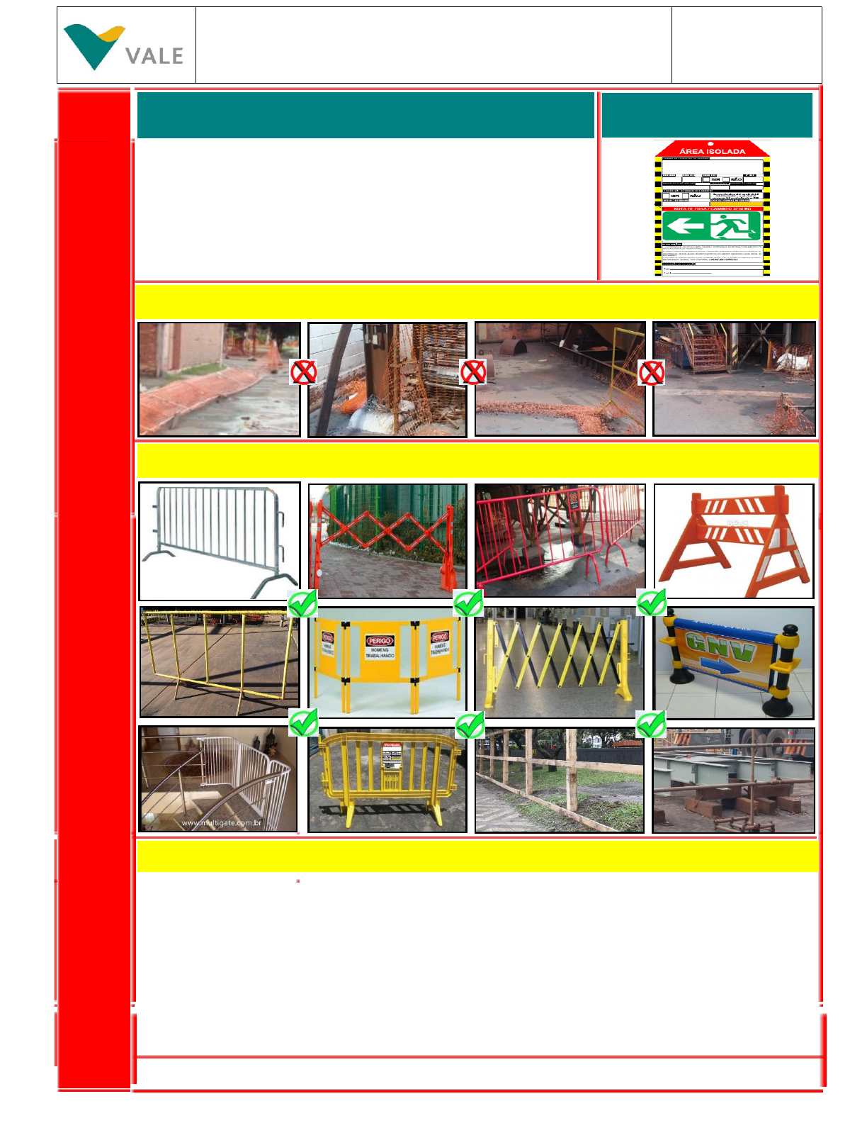 ALERTA DE SEGURANÇA 2019 A LE R TA D E SE G U R A N Ç A Gerência de Segurança do Trabalho – Diretoria de Pelotização Isolamento: Ato de delimitar determinada área ou equipamento mediante anteparo apropriado com a finalidade de impedir que terceiros acessem a área de risco; Dispositivo de isolamento: Acessório utilizado como anteparo para impedir o acesso a uma área ou um determinado equipamento; Recomendações: Toda barreira física deve estar identificada com a placa de sinalização padrão; As barreiras devem estar firmes e conectadas, afim de evitar sua queda com facilidade; Após a atividade ou não existência de riscos para terceiros, a barreira física deve ser retirada; Antes de instalar o isolamento, deve-se avaliar a possibilidade de permitir a passagem de veículos, pessoas e equipamentos de forma segura; A Fita zebrada (usada pelo Bombeiro e Patrimonial) e o Cerquite só devem ser utilizados de forma provisória e ou em casos de emergência; Isolamento de situações com risco de queda de altura, deve ser instalado barreira física, com capacidade suficiente para evitar queda de pessoas. BARREIRA FÍSICA PARA ISOLAMENTO DE ÁREA Porque o cerquite não deve ser utilizado para isolamento de área Modelo de barreiras físicas que devem ser utilizadas PLACA DE ISOLAMENTO PRO - 6218