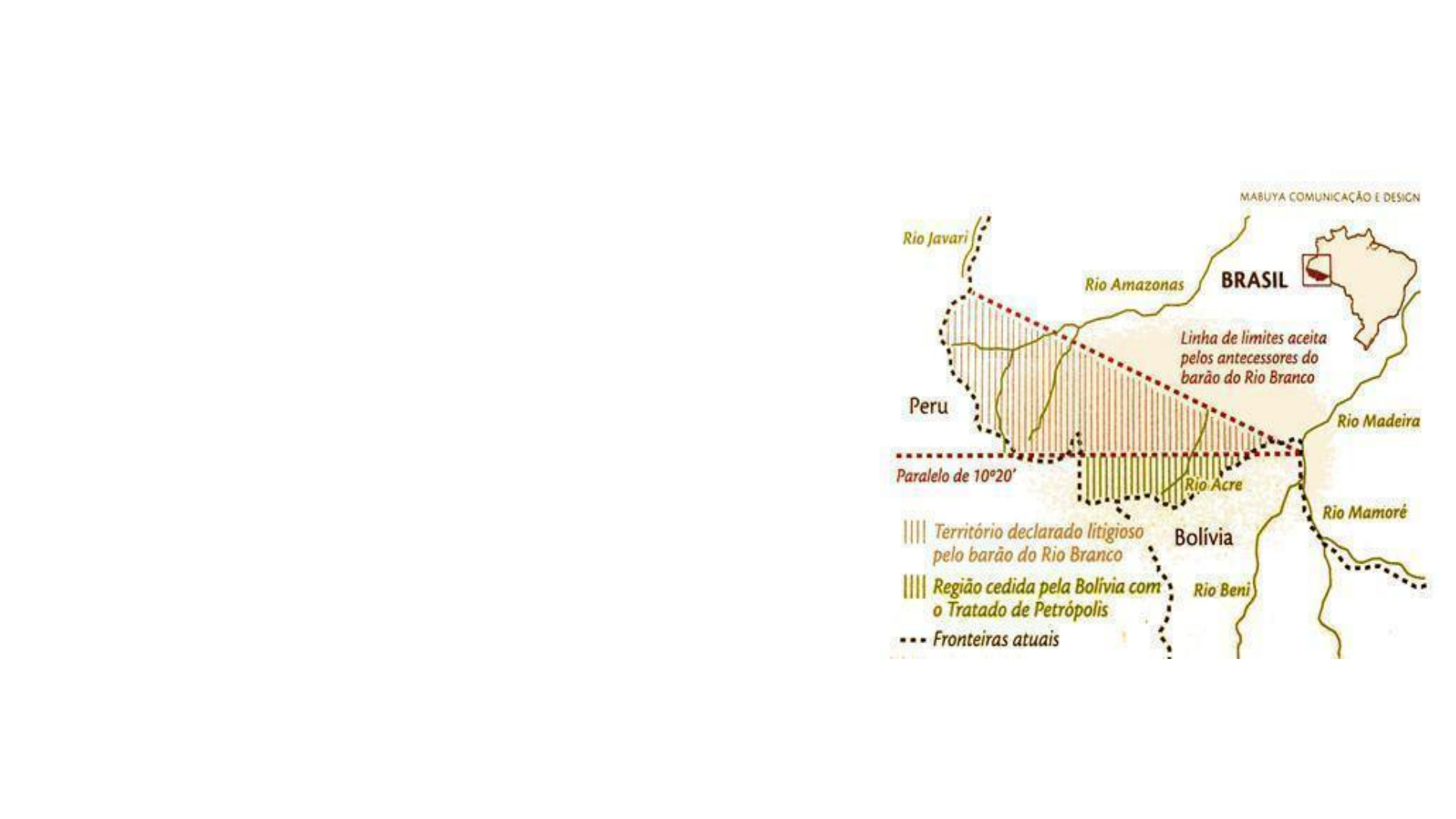 Tratados e Limites ✓Tratado de Petrópolis - 1903 ✓Período: 17/11/1903 ✓Assinado entre Brasil e Bolívia ✓Objetivo: Diminuir os conflitos entre seringueiros brasileiros e autoridades bolivianas, que determina a área territorial que formou o estado do Acre(antes pertencia à Bolivia), foi anexado ao território do Brasil. Uma das cláusulas do Tratado de Petrópolis, foi a construção de uma ferrovia margeando os rios Madeira e Mamoré.