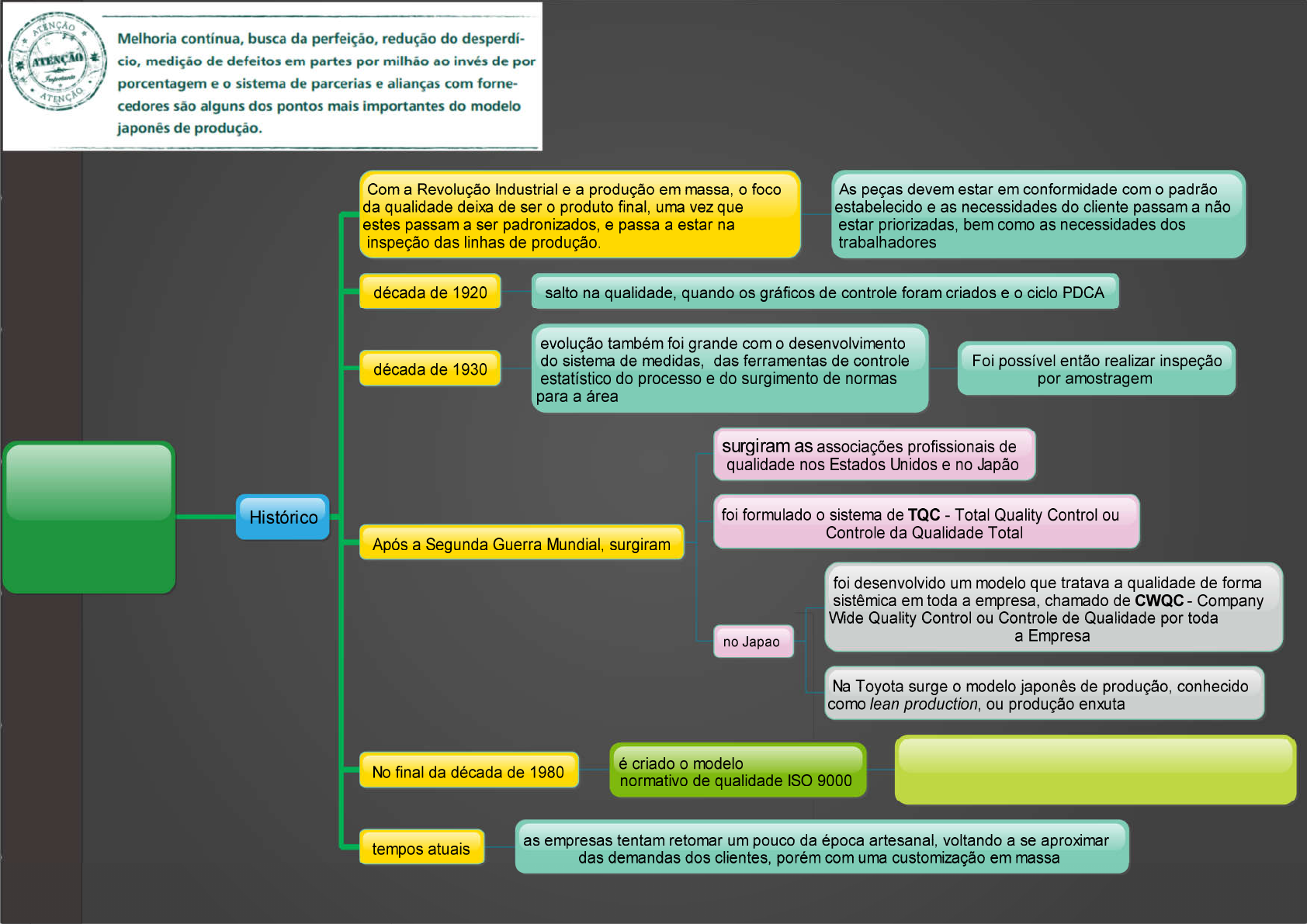 CONCEITOS DA GESTÃO PELA QUALIDADE TOTAL Os fornecedores passam a ter que se certificar nesse modelo para garantir qualidade para seus clientes, o que passou a ser critério de eliminação em licitações é qualquer um que recebe ou é afetado pelo produto ou processo. Os clientes podem ser internos (são afetados pelo produto e são membros da empresa que o fabrica) ou externos (são afetados pelo produto, mas não são membros da empresa que o produz). WALTER A. SHEWHART W. EDWARDS DEMING ensinou aos altos executivos formas de elaborou uma lista de 14 pontos que têm sido diretrizes de qualidade em todo o mundo até hoje JOSEPH MOSES JURAN ARMAND FEIGENBAUM avalia o desempenho operacional, comparando com os objetivos e corrigindo o plano de ação quando necessário aperfeiçoamento do desempenho atual para atingimento de novos níveis, tornando a empresa mais competitiva Pode-se verificar isso em uma de suas definições de qualidade: “Qualidade é a composição total das características de marketing, projeto, produção e manutenção dos bens e serviços, através dos quais os produtos atenderão às expectativas do cliente A Toyota dois princípios mais importantes preocupação inicial era eliminar o desperdício e as perdas sofridas pelas indústrias e alavancar os níveis de produtividade por intermédio da aplicação de métodos e técnicas da engenharia industrial os operários são os responsáveis pela qualidade de seu trabalho, eliminando mais um desperdício a partir do momento que um inspetor no final da linha de produção não é mais necessário para a melhoria da qualidade, a Toyota deixou de simplesmente consertar o produto com defeito,a empresa parava a linha de produção, os funcionários identificavam “o que” na linha de produção causava o defeito e, quando descobriam, corrigiam a causa do defeito. A partir daí nenhum produto daquela linha de produção apresentava defeito, aumentando a produtividade é um grupo de voluntários do mesmo setor que se reúne regularmente para estudar e propor a solução de problemas que estejam comprometendo a qualidade e a eficiência dos produtos Um serviço pode ser definido como uma ‘mudança’ na condição de uma pessoa ou de um bem pertencente a um agente econômico, que vem à baila como resultado da atividade de outro agente econômico, por acordo prévio, ou seja, solicitação da pessoa ou agente econômico anterior CATEGORIAS GENÉRICAS DE QUALIDADE CATEGORIAS GENÉRICAS DE QUALIDADE dimensões da qualidade É outra categoria bastante empírica, está diretamente relacionada ao ponto de vista do cliente ou do público-alvo. É a aparência de um produto, o sentimento ou sensação que a imagem dele provoca CONCEITOS E DESENVOLVIMENTO DE TOTAL QUALITY MANAGEMENT (TQM) DEFINIÇÃO DE TQM Uma filosofia de liderança que visa garantir a sobrevivência e o crescimento sustentado da organização, através da detecção e satisfação total das necessidades e expectativas de todos os seus clientes (clientes- internos e externos) - utilizando-se de uma metodologia científica orientada a promover a melhoria contínua na qualidade de seus produtos, serviços e processos A TQM pode ainda ser definida também como um conceito para se atingir abordagens sistêmicas para a gestão da qualidade, integrando todos os aspectos da qualidade que envolva pessoas, equipamentos, recursos computacionais e estrutura organizacional AS FASES DA EVOLUÇÃO DA QUALIDADE No início da era industrial, os processos de fabricação eram todos artesanais, as quantidades fabricadas eram pequenas e o artesão era o único trabalhador, e este era o responsável praticamente por todo o processo. Neste contexto, a inspeção era a ferramenta de controle e melhoria na qualidade do produto Soluções de problemas eram vistos como atividades fora das responsabilidades deste departamento. “O que surgiu foi um conceito no qual a alta gerência separou-se do processo de gerenciamento da qualidade” Algumas ferramentas foram introduzidas para melhorar estas ações, como a carta de controle que é utilizada para documentar e analisar a ocorrência desses eventos e, a partir deste momento, implementar melhorias e mudanças, visando os padrões de qualidade desejados AS FASES DA EVOLUÇÃO DA QUALIDADE Com o passar do tempo, a qualidade passou a ser percebida como uma disciplina estratégica, com foco maior no cliente e nos concorrentes, sendo uma oportunidade de diferenciação da concorrência. Dessa forma, a qualidade faz parte do planejamento estratégico um produto ou serviço de qualidade deve atender às necessidades do cliente e para isto deve-se ter um bom projeto, sem defeitos, com o custo baixo, que seja seguro e ainda que seja entregue no local certo, na quantidade certa e no prazo certo. Satisfação do cliente passa a ser algo extremamente valorizado, não estando somente relacionada com a entrega de um produto/serviço de baixo custo, no prazo, em quantidades certas, mas algo que supere suas expectativas Para identificar os FCS, deve ser formulada e respondida a seguinte pergunta O Grupo de Trabalho (GT) envolvido no desenvolvimento do planejamento estratégico organizacional deve elaborar uma lista com os FCS para cada objetivo Serve para reduzir a quantidade de itens de uma lista extensa a poucos itens. Os participantes da votação selecionam 20% do total de itens. Os mais votados permanecem, novamente os participantes selecionam 20% de itens dentre os que restaram, e assim sucessivamente, até que restem poucos itens Os sistemas de gestão devem ser desenvolvidos de forma a adequar-se aos requisitos de gestão, os quais se caracterizam pelos seguintes aspectos: É uma filosofia de liderança que visa garantir a sobrevivência e o crescimento sustentado da organização, através da detecção e satisfação total das necessidades e expectativas de todos os seus clientes, utilizando-se para isso de uma metodologia científica