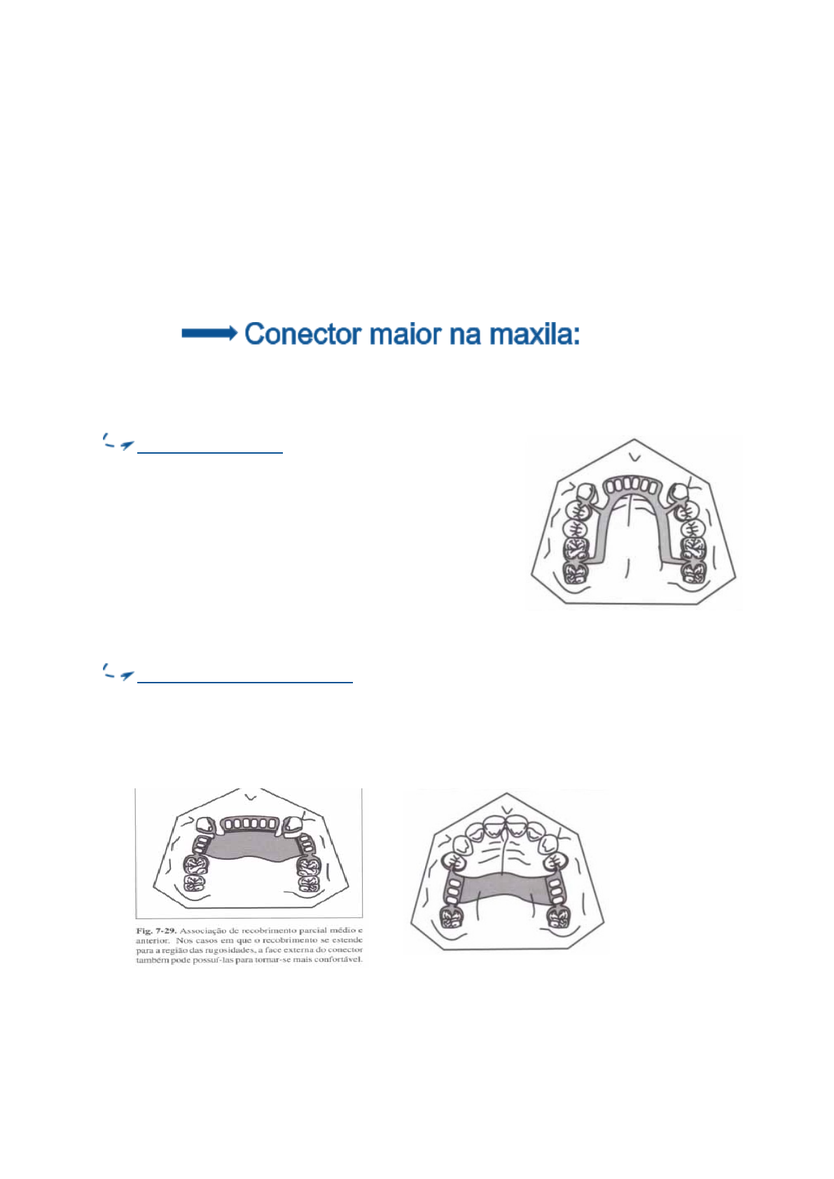 Conectore� Maiore� - São responsáveis por unir todos os componentes da ppr. - Uma de sua característica é a rigidez, para que ocorra uma melhor distribuição de forças. - Distribuem forças sem importar onde elas ocorrem. - Aumenta a eficácia de outro componente. - Não há necessidade para alívio da maxila. - Contato é importante para que haja garantia de suporte e estabilidade. - Distância de 4mm a 6mm da gengiva marginal livre. BARRA PALATINA: - Anterior, média e posterior. - + espessa = + rígida. - Menos confortável. - Secção em forma de D. - Muito utilizada (e de fácil fabricação). - Possui menor rigidez (comparada a outros). - Tem indicação em espaços protéticos pequenos. - E indica em classe III e IV. RECOBRIMENTO PARCIAL: - Anterior, médio e posterior. - + largos e + finos. - Oferecem uma boa rigidez. - É indicado para espaços protéticos pequenos e médios. - Classe I, II, III e IV. RECOBRIMENTO TOTAL: - Todo palato. - Metal ou resina acrílica. - Indicado em espaços protéticos maiores. - E indicados quando houver poucos elementos remanescentes. - Garante estabilidade, retenção e suporte. DUPLA BARRA: - Anterior e posterior. - Possui espaço livre na região central. - Barra em D. - Espessura vai de acordo com as necessidades biomecânicas. - Excelente rigidez. - Uso universal. - Todas as classes (I, II, III e IV). DUPLA BIPARTIDA: - Divide em 2 (região anterior e outra posterior). - É indicada quando se deseja evitar sobrecarga em dentes remanescentes. BARRA LINGUAL: - Próxima do assoalho bucal. - Distância da gengiva marginal livre de 3mm a 4mm. - Secção em forma de meia pêra. - Importantes nos conectores mandibulares. - Espaço entre o conector e a mucosa. - Espaço para movimentação evitando a intrusão nos tecidos. - Barra Universal. - Todas as classes de Kennedy. CHAPEADO LINGUAL: - Recobre desde o cíngulo além da gengiva marginal. - Alívio nas ameias e gengivas marginais. - Usado quando não há espaço para pôr uma barra lingual. - Retenção indireta (contatos com os dentes). - Indicado para rebordos muito reabsorvidos. SPLINT LINGUAL: - Localização no terço médio e cervical do dente (sem atingir a gengiva). - Retenção indireta nos dentes. - PPF nos dentes anteriores- reparos para receber os conectores). Conectore� Menore� - Vai unir o grampo às grades da sela e/ou aos conectores maiores. CARACTERÍSTICAS: - Volume suficiente - rigidez - Alívio na área de gengiva marginal. - Forma achatada e larga plano guia. - Forma triangular. - Ângulo reto com a conexão maior. - Deve ser colocado em espaços interdentais. Sel� Metaloplastic� / Sel� Metálic� - Preenche o espaço protético, reconstruindo funcional e esteticamente os tecidos ósseos e mucosa alterados pela perda de dente. - Serve de base para fixação dos dentes artificiais. - Transmite força mastigatórias. - Evita impactação de alimentos, desconforto e injúria. - Favorece a fonética. - Alivio 0,5 a 1mm. - Forma de grade.