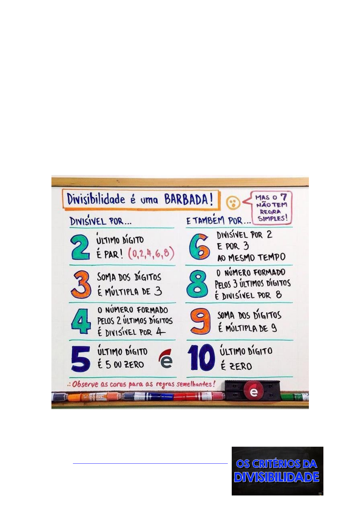 Série: 7º ano Disciplina: Matemática CRITÉRIOS DE DIVISIBILIDADE Nessa primeira unidade, vamos revisar assuntos do 6º ano essenciais para prosseguirmos na nossa caminhada matemática. Lembram dos Critérios de Divisibilidade de alguns números naturais? Para relembrar cada detalhe, clique no link abaixo e assista a uma videoaula que irá esclarecer suas dúvidas. https://www.youtube.com/watch?v=5FZ1xqTpndQ&t=1s Aplique o que você aprendeu nas atividades a seguir! Fonte: Meu bloco de passatempos – Matemática. Edições Usborne Fonte: https://studylibpt.com/doc/1488382/matem%C3%A1tica-8_m%C3%BAltiplos-divisores Página 1 Página 2 Página 3 Página 4