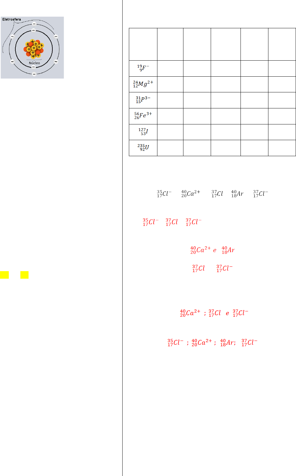 1. Sobre a representação, indique V para as afirmativas verdadeiras e F para as falsas: ( F ) o átomo está neutro, ou seja, tem o mesmo número de prótons e nêutrons no núcleo. ( F ) as partículas positivas e negativas se encontram na eletrosfera. ( F ) no núcleo estão os prótons e os nêutrons em igual quantidade ( F ) o núcleo, região onde se encontram os elétrons, é a região mais densa do átomo, pois concentra toda a sua massa. 2. Determine o número atômico de um átomo cujo subnível de maior energia é o 3p4. Se o máximo é o 3p4, vamos escrever a distribuição eletrônica até chegar ao 3p4: 1s² 2s² 2p6 3s² 3p4 Agora vamos somar a quantidade de elétrons: 2 + 2 + 6 + 2 + 4 = 18 3. Determine o número de massa de um átomo que contém 45 nêutrons e 7 elétrons no quarto nível energético, sua camada de valência. Se ele possui 7 elétrons no 4 nível de energia temos que reescrever a distribuição eletrônica até atingir os 7 elétrons no 4º nível: 1s² 2s² 2p6 3s² 3p6 4s² 3d10 4p5 Somando a quantidade de elétrons temos: 2 + 2 + 6 + 2 + 6 + 2 + 10 + 5 = 35 Portanto, como ele não está falando que é um íon podemos considerar que ele está no estado fundamental: e = p = 35 A = p + n A = 35 + 45 A = 80 4. Escreva a distribuição eletrônica, conforme o diagrama de Pauling, para as espécies químicas a seguir. a) 6C 1s² 2s² 2p² b) 11Na 1s² 2s² 2p6 3s¹ c) 15P3- 1s² 2s² 2p6 3s² 3p6 d) 20Ca2+1s² 2s² 2p6 3s² 3p6 e) 35Br - 1s² 2s² 2p6 3s² 3p6 4s² 3d10 4p6 f) 36Kr 1s² 2s² 2p6 3s² 3p6 4s² 3d10 4p6 g) 55Cs+ 1s² 2s² 2p6 3s² 3p6 4s² 3d10 4p6 5s² 4d10 5p6 h) 82Pb 1s² 2s² 2p6 3s² 3p6 4s² 3d10 4p6 5s² 4d10 5p6 6s² 4f14 5d10 6p² 5. Determine as características indicadas na tabela a seguir para as espécies químicas representadas: Espécie Química Prótons (p) Elétrons (e) Nêutrons (n) Número atômico (Z) Número de massa (A) 9 10 19 – 9 = 10 9 19 12 10 24 – 12 = 12 12 24 15 18 31 – 15 = 16 15 31 26 23 56 – 26 = 30 26 56 53 53 127 – 53 = 74 53 127 92 92 235 – 92 = 143 92 235 6. Observe as espécies químicas e responda às questões, justificando suas respostas: a) Quais são isótopos? b) Quais são isóbaros? e c) Quais são isótonos? d) Quais são isoeletrônicos? 7. Considere as seguintes afirmativas sobre dois elementos genéricos X e Y: X tem número de massa igual a 40 X é isóbaro de Y Y tem o número de nêutrons igual a 20. Assinale a alternativa que apresenta, respectivamente, o número atômico e a configuração eletrônica para o cátion bivalente de Y. (A) 20 e 1s² 2s² 2p6 3s² 3p6 4s² (B) 18 e 1s² 2s² 2p6 3s² 3p6 4s² (C) 20 e 1s² 2s² 2p6 3s² 3p6 4s² 4p² (D) 20 e 1s² 2s² 2p6 3s² 3p6 (E) 18 e 1s² 2s² 2p6 3s² 3p6 8. O quadro a seguir apresenta as partículas básicas da estrutura de quatro espécies químicas na forma de átomo ou íon. Espécie Química Prótons Elétrons Nêutrons A 17 17 18 B 20 18 20 C 17 18 18 D 19 19 20 Com base nessas informações, assinale V para as afirmativas verdadeiras e F para as falsas. Quando falsas, reescreva a frase corrigindo-a: ( F ) a espécie A é um átomo com número atômico 17 e número de massa 35 O número atômico está correto, mas seu número de massa é A = 17 + 18 = 36 ( F ) as espécies B e C são isótopos, pois apresentam o mesmo número de elétrons e, consequentemente, o mesmo número atômico. As espécies não são isótopos, pois não apresentam o mesmo número de prótons. ( F ) As espécies A e C correspondem ao mesmo elemento químico, pois têm o mesmo número de nêutrons As espécies A e C correspondem ao mesmo elemento químico, pois tem o mesmo número de prótons. ( F ) a espécie B é um cátion bivalente A espécie B tem mais elétrons do que prótons, portanto, é um ânion. E como só possui 1 elétron a mais é chamado de ânion monovalente. 9. O diagrama de Pauling é um método dos elétrons, de um átomo ou de um íon, na eletrosfera. Nessa configuração, os elétrons são dispostos em ordem crescente de energia, visto que, segundo Bohr, todas as vezes que o elétron recebe energia, ele salta para uma camada mais externa à qual ele se encontra e, no momento de sua volta para a camada de origem, o elétron emite luz, em virtude da energia absorvida anteriormente. De acordo com o Diagrama de Pauling, responda: a) Qual o número de elétrons na camada de valência para o átomo de cálcio (20Ca40)? 1s² 2s² 2p6 3s² 3p6 4s² Sua camada de valência é a mais externa: 4s², e possui 2 elétrons. b) Qual (is) é(são) o(s) subnível (eis) que aparece (m) na camada de valência do átomo (26Fe56)? 1s² 2s² 3p6 3s³ 3p6 4s² 3d6 O subnível que aparece na camada de valência é o 4s² c) Qual é a distribuição eletrônica para o íon de estrôncio (38Sr2+)? 1s² 2s² 2p6 3s² 3p6 4s² 3d10 4p6 d) Qual o número atômico de um átomo que apresenta o subnível 5p² mais energético? 1s² 2s² 2p6 3s² 3p6 4s² 3d10 4p6 5s² 4d10 5p² Podemos somar a quantidade de elétrons agora já que está no estado fundamental: 2 + 2 + 6 + 2 + 6 + 2 + 10 + 6 + 2 + 10 + 2 = 50 e = p = 50