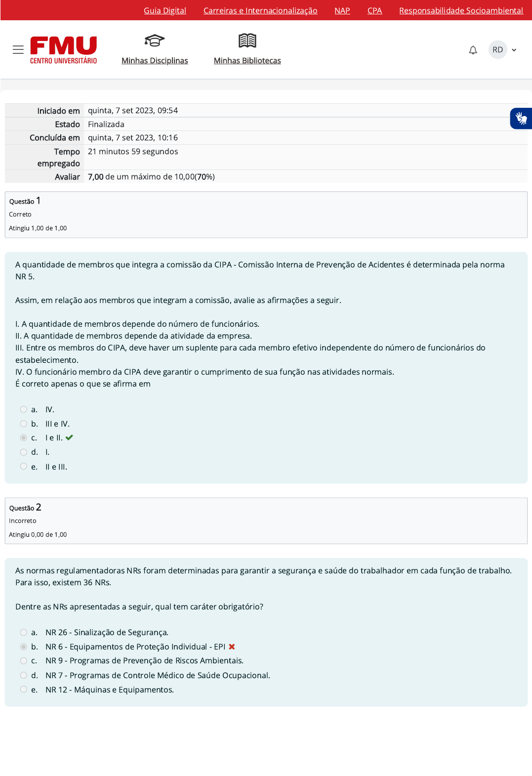 07/09/2023, 10:16 Atividade 2 (A2): Revisão da tentativa https://ambienteacademico.com.br/mod/quiz/review.php?attempt=2817409&cmid=1079125 1/4 Iniciado em quinta, 7 set 2023, 09:54 Estado Finalizada Concluída em quinta, 7 set 2023, 10:16 Tempo empregado 21 minutos 59 segundos Avaliar 7,00 de um máximo de 10,00(70%) Questão 1 Correto Atingiu 1,00 de 1,00 Questão 2 Incorreto Atingiu 0,00 de 1,00 A quantidade de membros que integra a comissão da CIPA - Comissão Interna de Prevenção de Acidentes é determinada pela norma NR 5. Assim, em relação aos membros que integram a comissão, avalie as a�rmações a seguir. I. A quantidade de membros depende do número de funcionários. II. A quantidade de membros depende da atividade da empresa. III. Entre os membros do CIPA, deve haver um suplente para cada membro efetivo independente do número de funcionários do estabelecimento. IV. O funcionário membro da CIPA deve garantir o cumprimento de sua função nas atividades normais. É correto apenas o que se a�rma em a. IV. b. III e IV. c. I e II. d. I. e. II e III. As normas regulamentadoras NRs foram determinadas para garantir a segurança e saúde do trabalhador em cada função de trabalho. Para isso, existem 36 NRs. Dentre as NRs apresentadas a seguir, qual tem caráter obrigatório? a. NR 26 - Sinalização de Segurança. b. NR 6 - Equipamentos de Proteção Individual - EPI c. NR 9 - Programas de Prevenção de Riscos Ambientais. d. NR 7 - Programas de Controle Médico de Saúde Ocupacional. e. NR 12 - Máquinas e Equipamentos. Guia Digital Carreiras e Internacionalização NAP CPA Responsabilidade Socioambiental Minhas Disciplinas Minhas Bibliotecas RD https://codely-fmu-content.s3.amazonaws.com/Moodle/GuiaDigital/Guia+digital/index.html https://carreiras.fmu.br/ https://codely-fmu-content.s3.amazonaws.com/Moodle/NAP/inicial/nap/fmu/index.html https://codely-fmu-content.s3.amazonaws.com/Moodle/CPA/landing_CPA/index.html https://portal.fmu.br/sustentabilidade https://ambienteacademico.com.br/ https://ambienteacademico.com.br/ https://ambienteacademico.com.br/course/view.php?id=236 07/09/2023, 10:16 Atividade 2 (A2): Revisão da tentativa https://ambienteacademico.com.br/mod/quiz/review.php?attempt=2817409&cmid=1079125 2/4 Questão 3 Correto Atingiu 1,00 de 1,00 Questão 4 Incorreto Atingiu 0,00 de 1,00 Questão 5 Correto Atingiu 1,00 de 1,00 Os membros da CIPA - Comissão Interna de Prevenção de Acidentes devem passar por um treinamento a ser realizado antes do início do mandato. Qual o treinamento que os membros da CIPA devem receber? a. Primeiros socorros. b. Sobre suas atribuições no CIPA. c. Legislação, normas e administrativo. d. Segurança, perigo e risco. e. Da prática de suas atividades na empresa. A NR 5 CIPA - Comissão Interna de Prevenção de Acidentes determina o caso das empresas que contratam empreiteiras ou prestadoras de serviço. De quem é a responsabilidade a implementação da CIPA na relação acima? a. Responsabilidade individua da contratante e contratada pela implementação de suas respectivas CIPAs, sem intervenção cruzada. b. Responsabilidade conjunta da contratante e contratada. c. Responsabilidade da contratada. d. Responsabilidade individual da contratante e contratada de implementar e garantir o cumprimento as medidas de segurança respectivamente. e. Responsabilidade da contratante. O artigo 225 da constituição de 1988 afirma que todos têm o direito ao meio ambiente ecologicamente equilibrado. Esse direito deve ser assegurado pelo poder público. Qual dos itens a seguir o poder público é incumbido e cumprir para garantir a efetividade desse direito? a. Promover a produção, a comercialização e o emprego de técnicas, métodos e substâncias que comportem risco para vida. b. Incentivar a pesquisa e manipulação de material genético para aumentar a diversidade. c. Controlar as entidades dedicadas à educação ambiental em todos os níveis de ensino e a conscientização pública. d. Preservar e restaurar os processos ecológicos essenciais e prover o manejo ecológico das espécies e ecossistemas. e. Proteger as atividades de caça, pesca e cultivo com o intuito de sobrevivência e subsistência do indivíduo. Guia Digital Carreiras e Internacionalização NAP CPA Responsabilidade Socioambiental Minhas Disciplinas Minhas Bibliotecas RD https://codely-fmu-content.s3.amazonaws.com/Moodle/GuiaDigital/Guia+digital/index.html https://carreiras.fmu.br/ https://codely-fmu-content.s3.amazonaws.com/Moodle/NAP/inicial/nap/fmu/index.html https://codely-fmu-content.s3.amazonaws.com/Moodle/CPA/landing_CPA/index.html https://portal.fmu.br/sustentabilidade https://ambienteacademico.com.br/ https://ambienteacademico.com.br/ https://ambienteacademico.com.br/course/view.php?id=236 07/09/2023, 10:16 Atividade 2 (A2): Revisão da tentativa https://ambienteacademico.com.br/mod/quiz/review.php?attempt=2817409&cmid=1079125 3/4 Questão 6 Correto Atingiu 1,00 de 1,00 Questão 7 Correto Atingiu 1,00 de 1,00 Questão 8 Correto Atingiu 1,00 de 1,00 A Norma Regulamentadora 4 estabelece Serviços Especializados em Segurança e Medicina do Trabalho (SESMT). Todas as empresas devem manter uma comissão para promover a saúde e proteger a integridade do trabalhador no local de trabalho. O dimensionamento da comissão mencionada é determinado de acordo com alguns critérios, incluindo: a. Número de acidentes nos últimos 12 meses. b. Número total de estabelecimentos de trabalho. c. Tamanho da área do ambiente de trabalho. d. Grau de risco da atividade principal. e. Quantidade de atividades exercidas pela empresa. A comissão de Serviços Especializados em Segurança e Medicina do Trabalho (SESMT), que deve ser implementada em toda empresa, possui pro�ssionais especializados para as funções exigidas. A partir do texto, avalie as a�rmações a seguir. I. Engenheiro deve possuir no mínimo pós-graduação. II. Auxiliar de enfermagem deve possuir no m