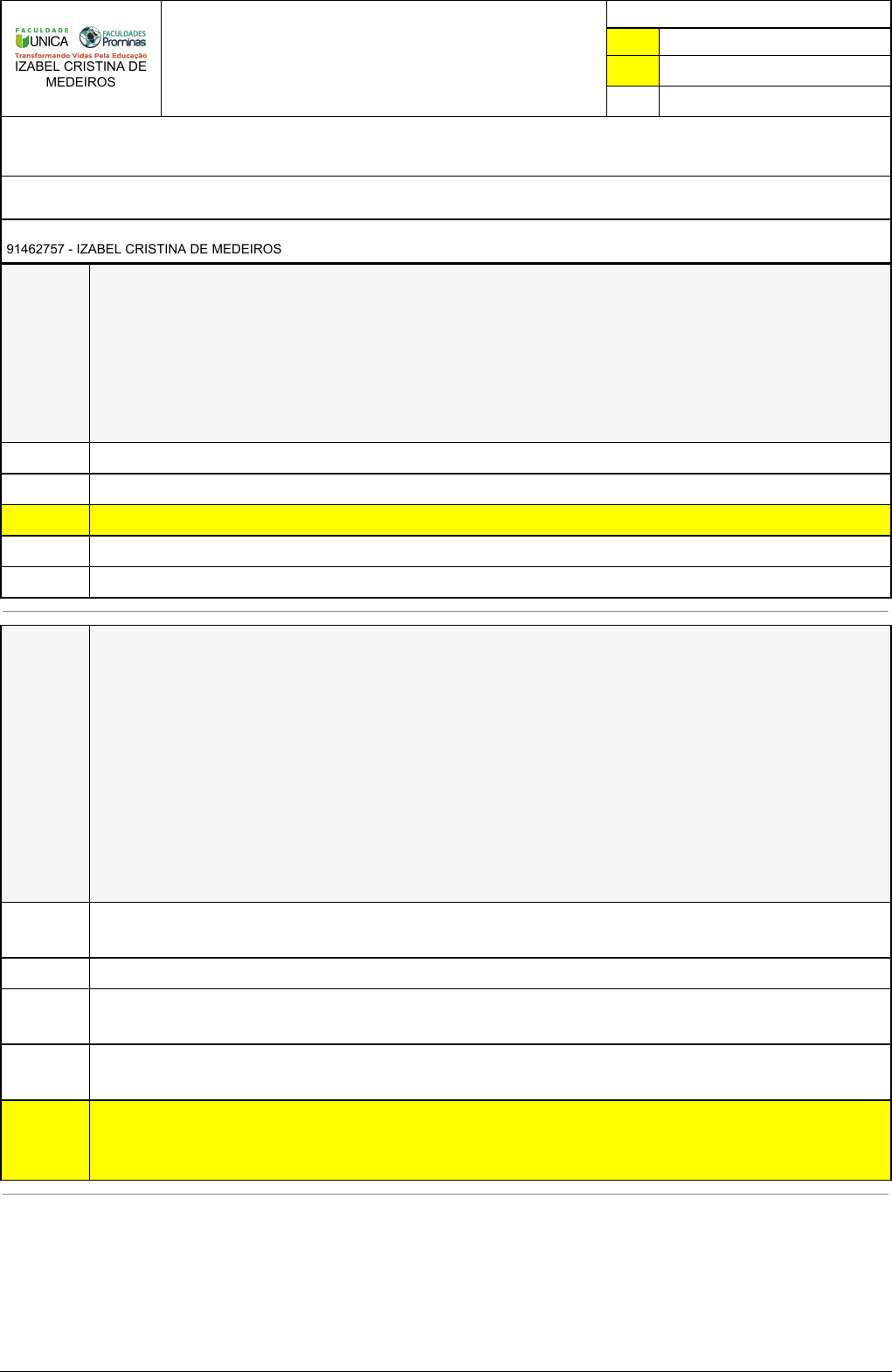 Pincel Atômico - 07/09/2023 11:08:37 1/4 IZABEL CRISTINA DE MEDEIROS Exercício Caminho do Conhecimento - Etapa 4 (23074) Atividade finalizada em 09/05/2023 20:24:26 (926886 / 1) LEGENDA Resposta correta na questão # Resposta correta - Questão Anulada X Resposta selecionada pelo Aluno Disciplina: BASE NACIONAL COMUM CURRICULAR(BNCC): HISTÓRIA, CONCEPÇÃO, POLÍTICA E REFERENCIAIS PEDAGÓGICOS [854630] - Avaliação com 8 questões, com o peso total de 3,33 pontos [capítulos - 2] Turma: Segunda Graduação: Segunda Graduação 6 meses - Licenciatura em Pedagogia - Grupo: MAIO/2023 - SGegu0A270423 [90629] Aluno(a): 91462757 - IZABEL CRISTINA DE MEDEIROS - Respondeu 8 questões corretas, obtendo um total de 3,33 pontos como nota [359879_1522 30] Questão 001 Sobre a elaboração do currículo, assinale a alternativa que indica o que é preciso ter no currículo. I. Diretrizes do MEC e necessidades dos alunos. II. Particularidades da região onde a instituição está inserida e práticas pedagógicas inovadoras. III. Uso de tecnologias e avaliação constante dos alunos. IV. Objetivos e metas que se desejam alcançar. V, F, V, F. F, F, F, V. X V, V, V, V. F, F, V, V. V, V, F, F. [359879_1522 28] Questão 002 A organização do currículo se tornou necessária porque, com o surgimento da escolarização em massa, precisou-se de uma padronização do conhecimento a ser ensinado, ou seja, que as exigências do conteúdo fossem as mesmas. No entanto, o currículo não diz respeito apenas a uma relação de conteúdos, mas envolve também: “questões de poder, tanto nas relações professor/aluno e administrador/professor, quanto em todas as relações que permeiam o cotidiano da escola e fora dela, ou seja, envolve relações de classes sociais (classe dominante/classe dominada) e questões raciais, étnicas e de gênero, não se restringindo a uma questão de conteúdos”. (HORNBURG e SILVA, 2007, p.1) Sobre currículo, assinale a alternativa correta. Podemos considerar que o Currículo é um documento informal que direciona todo trabalho pedagógico. O Currículo serve como um elo de ligação entre a cultura da sociedade e as famílias. O Currículo norteia o trabalho pedagógico apenas no âmbito da sala de aula e sala de recursos multifuncionais, mas vai muito além do ambiente escolar. O currículo reflete a realidade da escola, seus documentos nortadores e as necessidades de cada docente. X O Currículo Escolar é um dos principais documentos de articulação para a produção de livros e materiais didáticos, é um documento de apoio na elaboração de parâmetros de avaliações internas e externas e orienta a formação de professores. Pincel Atômico - 07/09/2023 11:08:37 2/4 [359879_1527 39] Questão 003 (ENADE 2017). A educação, fundada na transdisciplinaridade e apoiada na multidimensionalidade humana, vai além do racionalismo clássico e reconhece a importância das emoções e dos sentimentos, a voz da intuição dialogando com a razão e com a emoção subjacente, recuperando a polissemia dos símbolos, as diferentes linguagens e possibilidades de expressão do ser humano. Enfim, reconhece a subjetividade humana não como uma realidade coisificante, mas como um processo vivo do indivíduo/sujeito concreto. MORAES, M. C. Transdisciplinaridade e Educação. Rizoma Freireano. v. 6, 2010. Disponível em: https://bit.ly/3z6YemV. Acesso em: 17 jul. 2017 (adaptado). Considerando as implicações da educação transdisciplinar na organização do trabalho pedagógico, assinale a opção correta. O pensamento formulado a partir da transdisciplinaridade implica a atitude de abertura para a troca de diferentes saberes e conhecimentos, sendo necessário que o planejamento do trabalho pedagógico contemple, simultaneamente, diálogos entre os conteúdos das disciplinas na perspectiva transversal. Arte, História e Geografia, componentes curriculares que deram início ao pensamento transdisciplinar, têm em comum a articulação de seus conteúdos, que se autoalimentam de modo polissêmico e simbólico no plano didático, o que exige a contextualização das produções humanas, dos tempos e dos espaços, e que impede a fragmentação do conhecimento dessas áreas. A transdisciplinaridade implica a formação do pensamento racionalizado sobre diferentes áreas de conhecimento, associada à avaliação pedagógica dos resultados, que despreza a visão segmentada e disciplinar do ser humano, considerado sujeito antropoético, ou seja, não se avaliam conteúdos, mas vivências manifestas em atitudes relacionais antropológicas e éticas. Na educação fundada na transdisciplinaridade, valorizam-se as diferentes áreas de conhecimento, considerando a criticidade, criatividade, auto-organização ecológica daquilo que surge de dentro para fora dos sujeitos aprendentes, ultrapassando as fronteiras do conhecimento. X A organização do trabalho pedagógico sob a perspectiva transdisciplinar implica a formação do ser humano em suas múltiplas dimensões, promovendo o desenvolvimento integral do ser que pensa, fala, deseja e age, em vivências que favorecem o autoconhecimento, e tornando o pensamento aberto a tudo que transcenda a fragmentação do conhecimento e do ser. [359879_1527 43] Questão 004 (IDCAP 2020). A principal definição de _________________ é que este consiste em uma seleção de conhecimentos que estarão presentes no contexto escolar, seja em forma de conteúdos na sala de aula, ou em de forma oculta no ambiente escolar e na sua comunidade. Marque a alternativa que preenche corretamente a lacuna: Projeto de Trabalho. Inclusão escolar. Avaliação. Psicologia da Aprendizagem. X Currículo escolar. Pincel Atômico - 07/09/2023 11:08:37 3/4 [359879_1527 34] Questão 005 (ENADE 2017) Aos poucos, rabiscos vão se transformando em agrupamentos de rabiscos, vão aparecendo algumas bolinhas e traços soltos dos agrupamentos. Isso se deve ao fato de as crianças começare