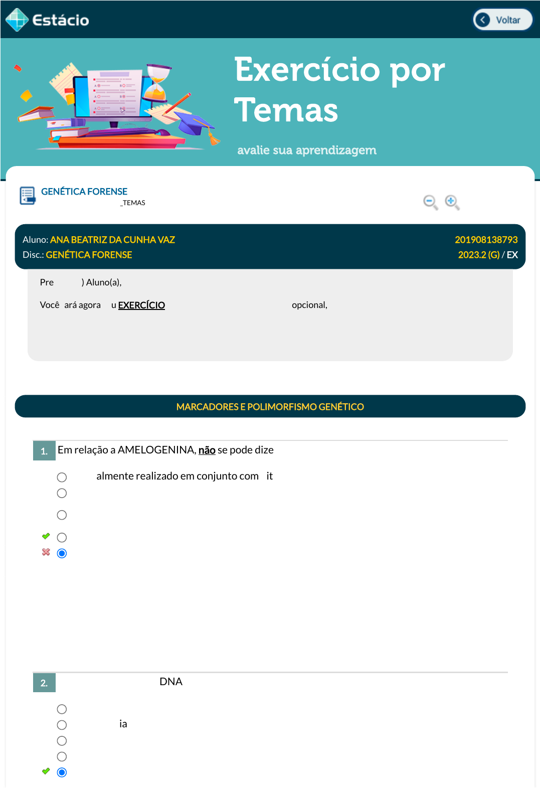 Exercício por Temas avalie sua aprendizagem Em relação a AMELOGENINA, não se pode dizer que: O sequenciamento de DNA permite estipular: GENÉTICA FORENSE Lupa ARA0776_201908138793_TEMAS Aluno: ANA BEATRIZ DA CUNHA VAZ Matr.: 201908138793 Disc.: GENÉTICA FORENSE 2023.2 (G) / EX Prezado (a) Aluno(a), Você fará agora seu EXERCÍCIO! Lembre-se que este exercício é opcional, mas não valerá ponto para sua avaliação. O mesmo será composto de questões de múltipla escolha. Após responde cada questão, você terá acesso ao gabarito comentado e/ou à explicação da mesma. Aproveite para se familiarizar com este modelo de questões que será usado na sua AV e AVS. MARCADORES E POLIMORFISMO GENÉTICO 1. É usualmente realizado em conjunto com kit de tipagem STR. É um marcador de gênero Os produtos de PCR gerados a partir do gene amelogenina possui tamanho diferentes para os cromossomos Y e X. Podem ser usados para a identi�cação individual Não possibilitam traçar parentesco Data Resp.: 07/09/2023 14:12:46 Explicação: A resposta correta é: Podem ser usados para a identi�cação individual 2. A sequência funcional do genoma A sequência funcional do Epigenoma A sequência de proteínas A sequência funcional dos genes A sequência de nucleotídeos do genoma Data Resp.: 07/09/2023 14:13:57 javascript:voltar(); javascript:voltar(); javascript:diminui(); javascript:aumenta(); Em determinadas situações, a análise do DNA nuclear não pode ser aplicada (como em casos onde o DNA está degradado ou em que o material biológico não apresenta o DNA nuclear). Nestes casos, o perito pode analisar: Na herança monogênica polialélica temos a participação de: O mais adequado marcador genético para identi�cação post mortem é: Explicação: A resposta correta é: A sequência de nucleotídeos do genoma 3. mtDNA Amelogenina Mini-STR X-STR Y-STR Data Resp.: 07/09/2023 14:16:03 Explicação: A resposta correta é: mtDNA 4. Vários alelos e vários loci Apenas 1 gene e vários alelos Vários alelos e 1 locus Apenas 1 gene e vários loci Vários genes e vários alelos Data Resp.: 07/09/2023 14:17:27 Explicação: A resposta correta é: Vários alelos e 1 locus 5. HLA CNP. VNTR STR SNP Data Resp.: 07/09/2023 14:19:02 Explicação: A resposta correta é: STR Não Respondida Não Gravada Gravada Exercício por Temas inciado em 07/09/2023 14:08:47.