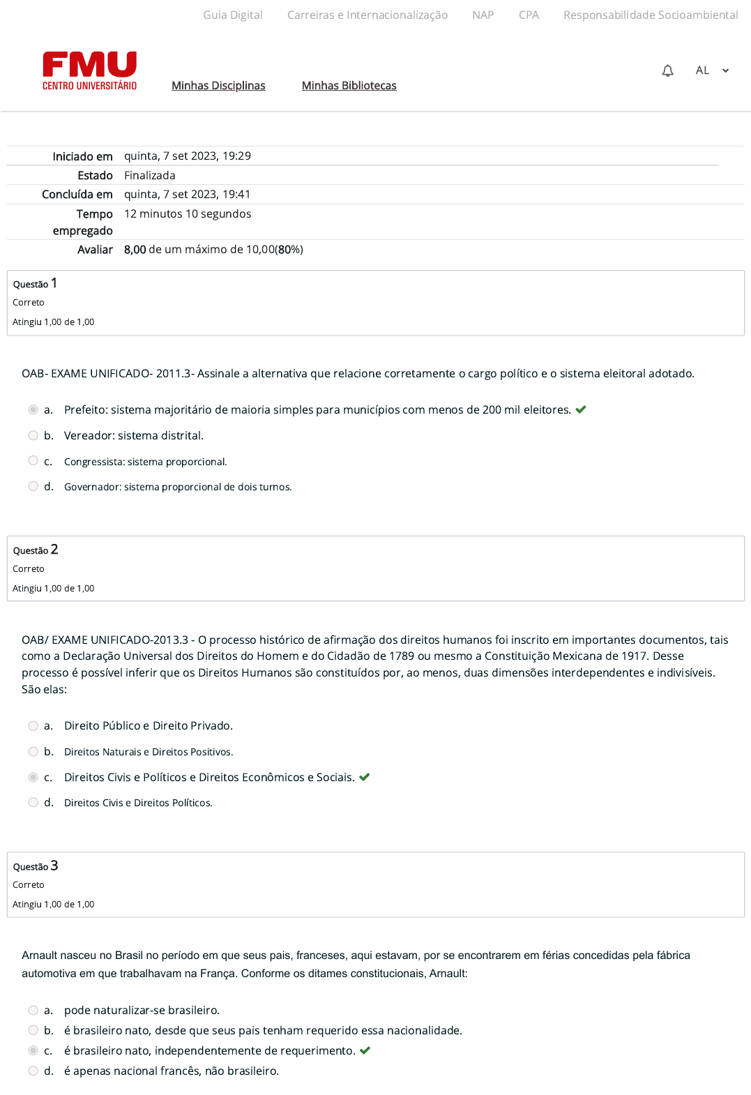Iniciado em quinta, 7 set 2023, 19:29 Estado Finalizada Concluída em quinta, 7 set 2023, 19:41 Tempo empregado 12 minutos 10 segundos Avaliar 8,00 de um máximo de 10,00(80%) Questão 1 Correto Atingiu 1,00 de 1,00 Questão 2 Correto Atingiu 1,00 de 1,00 Questão 3 Correto Atingiu 1,00 de 1,00 OAB- EXAME UNIFICADO- 2011.3- Assinale a alternativa que relacione corretamente o cargo político e o sistema eleitoral adotado. a. Prefeito: sistema majoritário de maioria simples para municípios com menos de 200 mil eleitores. b. Vereador: sistema distrital. c. Congressista: sistema proporcional. d. Governador: sistema proporcional de dois turnos. OAB/ EXAME UNIFICADO-2013.3 - O processo histórico de a�rmação dos direitos humanos foi inscrito em importantes documentos, tais como a Declaração Universal dos Direitos do Homem e do Cidadão de 1789 ou mesmo a Constituição Mexicana de 1917. Desse processo é possível inferir que os Direitos Humanos são constituídos por, ao menos, duas dimensões interdependentes e indivisíveis. São elas: a. Direito Público e Direito Privado. b. Direitos Naturais e Direitos Positivos. c. Direitos Civis e Políticos e Direitos Econômicos e Sociais. d. Direitos Civis e Direitos Políticos. Arnault nasceu no Brasil no período em que seus pais, franceses, aqui estavam, por se encontrarem em férias concedidas pela fábrica automotiva em que trabalhavam na França. Conforme os ditames constitucionais, Arnault: a. pode naturalizar-se brasileiro. b. é brasileiro nato, desde que seus pais tenham requerido essa nacionalidade. c. é brasileiro nato, independentemente de requerimento. d. é apenas nacional francês, não brasileiro. Guia Digital Carreiras e Internacionalização NAP CPA Responsabilidade Socioambiental Minhas Disciplinas Minhas Bibliotecas AL https://codely-fmu-content.s3.amazonaws.com/Moodle/GuiaDigital/Guia+digital/index.html https://carreiras.fmu.br/ https://codely-fmu-content.s3.amazonaws.com/Moodle/NAP/inicial/nap/fmu/index.html https://codely-fmu-content.s3.amazonaws.com/Moodle/CPA/landing_CPA/index.html https://portal.fmu.br/sustentabilidade https://ambienteacademico.com.br/ https://ambienteacademico.com.br/ https://ambienteacademico.com.br/course/view.php?id=236 Questão 4 Correto Atingiu 1,00 de 1,00 Questão 5 Correto Atingiu 1,00 de 1,00 Questão 6 Incorreto Atingiu 0,00 de 1,00 Devanir nasceu na Itália no período em que seu pai, brasileiro, lá residia em caráter permanente. À luz da sistemática constitucional, é correto afirmar que Devanir: a. será cidadão brasileiro caso a sua mãe também tenha nacionalidade brasileira. b. é considerado cidadão brasileiro, caso tenha sido registrado na repartição brasileira competente. c. somente será nacional brasileiro caso requeira a sua naturalização. d. será cidadão brasileiro caso venha a residir no território brasileiro e opte por essa nacionalidade até os 18 anos. Determinada lei federal provocou alterações no regime jurídico dos servidores públicos federais, resultando em prejuízos para um grupo de cinquenta servidores espalhados pelo território nacional, os quais tiveram direito adquirido violado. Ato contínuo, a associação nacional da categoria ajuizou arguição de descumprimento de preceito fundamental, postulando que fosse declarada a inconstitucionalidade parcial da mencionada lei e que as perdas de cada um dos servidores fossem recompostas pela União. No tocante ao uso da Arguição de Descumprimento de Preceito Fundamental, ADPF, no caso concreto, ele é: a. cabível, já que foi violado um preceito fundamental, com a correlata afronta à esfera jurídica individual. b. incabível, apenas na parte em que é postulado o reconhecimento da inconstitucionalidade da lei. c. incabível, pelo fato de a associação nacional não ter legitimidade para ingressar com a arguição. d. incabível, por não estar presente a subsidiariedade e por ser direcionado a situações individuais e concretas. Sabe-se que a Lei nº 9.868/1999 dispõe sobre processo e julgamento da Ação Direta de Inconstitucionalidade e da Ação Declaratória de Constitucionalidade perante o Supremo Tribunal Federal. Assim sendo, nos termos da referida lei, assinale a alternativa correta. a. A decisão que declara a constitucionalidade ou a inconstitucionalidade da lei ou do ato normativo em ação direta ou em ação declaratória é irrecorrível, ressalvada a interposição de embargos declaratórios, não podendo, igualmente, ser objeto de ação rescisória. b. Será admitida intervenção de terceiros no processo de ação declaratória de constitucionalidade. c. Da decisão que indeferir a petição inicial da ADCO caberá agravo regimental. d. A decisão sobre a constitucionalidade ou a inconstitucionalidade da lei ou do ato normativo somente será tomada se presentes na sessão pelo menos seis ministros. Guia Digital Carreiras e Internacionalização NAP CPA Responsabilidade Socioambiental Minhas Disciplinas Minhas Bibliotecas AL https://codely-fmu-content.s3.amazonaws.com/Moodle/GuiaDigital/Guia+digital/index.html https://carreiras.fmu.br/ https://codely-fmu-content.s3.amazonaws.com/Moodle/NAP/inicial/nap/fmu/index.html https://codely-fmu-content.s3.amazonaws.com/Moodle/CPA/landing_CPA/index.html https://portal.fmu.br/sustentabilidade https://ambienteacademico.com.br/ https://ambienteacademico.com.br/ https://ambienteacademico.com.br/course/view.php?id=236 Questão 7 Correto Atingiu 1,00 de 1,00 Questão 8 Correto Atingiu 1,00 de 1,00 OAB/EXAME UNIFICADO-2015.3- A Assembleia Legislativa do Estado M, ao constatar a ausência de normas gerais sobre matéria em que a União, os Estados e o Distrito Federal possuem competência legislativa concorrente, resolve tomar providências no sentido de legislar sobre o tema, preenchendo os vazios normativos decorrentes dessa lacuna. Assim, dois anos após a Lei E/2013 ter sido promulgada pelo Estado M, o Congresso Nacional promulga a Lei F/2