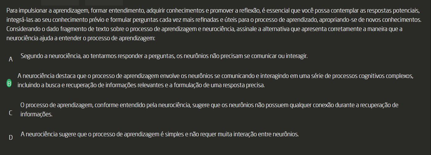Para impulsionar a aprendizagem, formar entendimento, adquirir conhecimentos e promover a reflexão, é essencial que você possa contemplar as respostas potenciais, integrá-las ao seu conhecimento prévio e formular perguntas cada vez mais refinadas e úteis para processo de aprendizado, apropriando-se de novos conhecimentos. Considerando dado fragmento de texto sobre processo de aprendizagem e neurociência, assinale a alternativa que apresenta corretamente a maneira que a neurociência ajuda a entender o processo de aprendizagem: A - Segundo a neurociência, ao tentarmos responder a perguntas, os neurônios não precisam se comunicar interagir. B - A neurociência destaca que o processo de aprendizagem envolve os neurônios se comunicando e interagindo em uma série de processos cognitivos complexos, incluindo a busca e recuperação de informações relevantes e a formulação de uma resposta precisa. C - O processo de aprendizagem, conforme entendido pela neurociência, sugere que os neurônios não possuem qualquer conexão durante a recuperação de informações. D - A neurociência sugere que o processo de aprendizagem é simples e não requer muita interação entre neurônios.