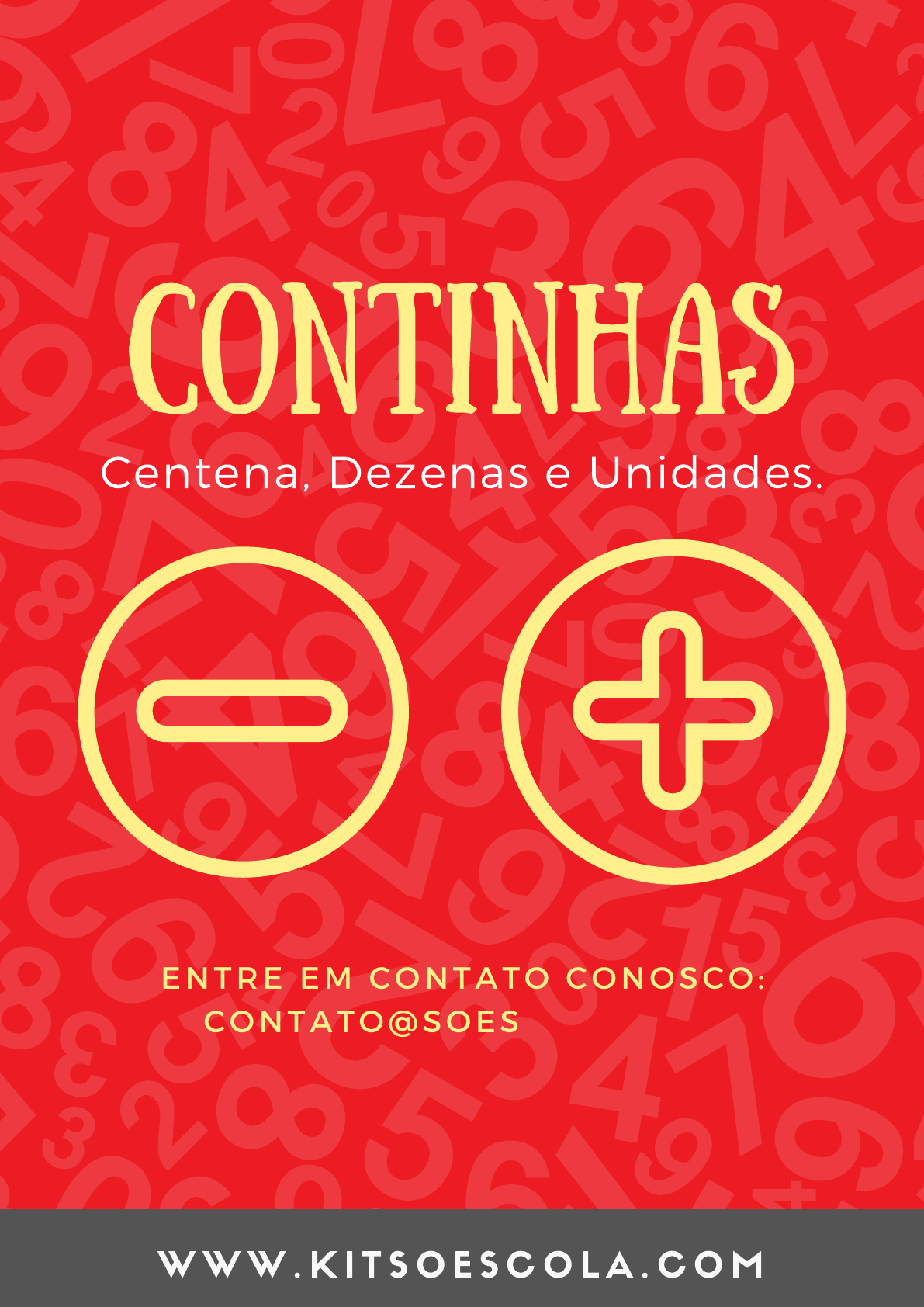 F E I T O P O R K I T S Ó E S C O L A CONTINHAS Centena, Dezenas e Unidades. E N T R E E M C O N T A T O C O N O S C O : C O N T A T O @ S O E S C O L A . C O M WWW.K I T SO E SCO LA .COM http://www.kitsoescola.com/loja http://www.kitsoescola.com/loja Caro cliente, é com grande alegria que agradecemos por depositar sua confiança em nosso trabalho e profissionalismo. Nos empenhamos ao máximo para alcançar a qualidade que você procura e é uma grande motivação ter a aprovação de clientes especiais como você. Esperamos que a nossa parceria seja duradoura e que nosso trabalho sempre corresponda com as suas expectativas! OBRIGADA PELA COMPRA! https://kitsoescola.com/loja/ https://kitsoescola.com/loja/ SÓ ESCOLA é um portal dedicado a educação que está no ar desde janeiro de 2014. Nossa missão é contribuir para o progresso cultural e social brasileiro, por meio do processo educacional, proporcionando assim uma educação de qualidade e de fácil acesso. SOBRE NÓS CONHEÇA NOSSA LOJA https://kitsoescola.com/loja/ https://kitsoescola.com/loja https://kitsoescola.com/loja/ https://kitsoescola.com/loja/ Não é permitido usar os arquivos para marcas, logotipos e qualquer outro item que faça parte de uma identidade visual comercial de terceiros. Não é permitido registrar produtos que contenham nossos arquivos. Não é permitido vetorizar nossos arquivos. Não é permitido alterar as ilustrações e revendê-las independente do formato ou extensão do arquivo. Não é permitida a revenda de "arquivos" em hipótese alguma, os mesmos são de venda exclusiva do KIT SÓ ESCOLA e sempre destinados ao cliente final. Não é permitido compartilhar, enviar, doar parte ou todo o arquivo seja em grupos de WhatsApp, sites, blogs, e-mail. O que pode e não pode fazer com os arquivos: Produto de uso PESSOAL. A compra dos materiais KIT SÓ ESCOLA não concede a você o direito de comercialização do mesmo. Todos os direitos autorais estão reservados a KIT SÓ ESCOLA. TERMOS E CONDIÇÕES DIGITAIS https://kitsoescola.com/loja/ https://kitsoescola.com/loja/ https://kitsoescola.com/loja/ https://kitsoescola.com/loja/ C CENTENA DDEZENA U UNIDADE 0 1 2 3 4 5 6 7 8 9 0 1 2 3 4 5 6 7 8 9 0 1 2 3 4 5 6 7 8 9 NOME:__________________________________ DATA:__/__/___ CONTINHAS DE ADIÇÃO (DEZENA E UNIDADE): D U 2 3 4 5+ = D U 3 2 1 9+ = D U 4 6 2 3+ = D U 4 4 4 5+ = D U 3 3 1 6+ = D U 1 3 1 6+ = D U 4 5 3 5+ = D U 1 1 6 3+ = D U 2 1 4 1+ = NOME:__________________________________ DATA:__/__/___ CONTINHAS DE ADIÇÃO (DEZENA E UNIDADE): D U 3 7 4 3+ = D U 6 8 1 2+ = D U 6 2 2 2+ = D U 2 4 3 5+ = D U 6 3 2 6+ = D U 4 3 2 6+ = D U 3 5 4 0+ = D U 3 1 2 2+ = D U 4 2 1 9+ = NOME:__________________________________ DATA:__/__/___ CONTINHAS DE ADIÇÃO (DEZENA E UNIDADE): D U 1 1 4 1+ = D U 1 2 4 0+ = D U 1 3 3 9+ = D U 1 6 3 3+ = D U 3 1 1 9+ = D U 2 2 2 9+ = D U 1 1 7 0+ = D U 2 7 3 2+ = D U 1 9 7 1+ = NOME:__________________________________ DATA:__/__/___ CONTINHAS DE ADIÇÃO (CENTENA, DEZENA E UNIDADE): C D 1 1 2 5+ = U 3 2 C D 2 3 3 5+ = U 5 2 C D 5 2 2 6+ = U 1 5 C D 5 3 2 4+ = U 4 4 C D 1 2 3 2+ = U 7 2 C D 1 1 2 2+ = U 1 2 NOME:__________________________________ DATA:__/__/___ CONTINHAS DE ADIÇÃO (CENTENA, DEZENA E UNIDADE): C D 2 2 3 5+ = U 3 2 C D 4 3 2 5+ = U 3 7 C D 6 5 2 4+ = U 2 5 C D 7 2 1 5+ = U 2 5 C D 4 2 2 8+ = U 8 3 C D 2 2 4 4+ = U 2 4 NOME:__________________________________ DATA:__/__/___ CONTINHAS DE ADIÇÃO (CENTENA, DEZENA E UNIDADE): C D 4 1 4 2+ = U 1 1 C D 6 3 2 2+ = U 4 2 C D 1 8 7 1+ = U 8 1 C D 2 1 5 3+ = U 1 3 C D 6 1 2 7+ = U 1 2 C D 3 2 5 5+ = U 3 5 NOME:__________________________________ DATA:__/__/___ APRESENTE O RESULTADO DAS ADIÇÕES ABAIXO: A) 157 + 128= C D + = U B) 256 + 132= C D + = U C) 267 + 134= C D + = U D) 343 + 256= C D + = U E) 282 + 141= C D + = U F) 721 +312= C D + = U NOME:__________________________________ DATA:__/__/___ APRESENTE O RESULTADO DAS ADIÇÕES ABAIXO: A) 192 + 177= C D + = U B) 333 + 242= C D + = U C) 227 + 244= C D + = U D) 343 + 343= C D + = U E) 733 + 41= C D + = U F) 521 +82= C D + = U NOME:__________________________________ DATA:__/__/___ APRESENTE O RESULTADO DAS ADIÇÕES ABAIXO: A) 123 + 234= C D + = U B) 245 + 369= C D + = U C) 357 + 478= C D + = U D) 456 + 319= C D + = U E) 514 + 41= C D + = U F) 667+9= C D + = U NOME:__________________________________ DATA:__/__/___ CONTINHAS DE SUBTRAÇÃO (DEZENA E UNIDADE): D U 3 1 2 1- = D U 4 9 4 5- = D U 5 6 2 3- = D U 3 7 1 7- = D U 7 7 4 7- = D U 8 9 2 9- = D U 5 6 2 4- = D U 7 4 3 3- = D U 8 2 4 1- = NOME:__________________________________ DATA:__/__/___ CONTINHAS DE SUBTRAÇÃO (DEZENA E UNIDADE): D U 8 4 2 2- = D U 5 4 1 3- = D U 9 8 4 5- = D U 8 8 4 4- = D U 9 9 1 9- = D U 7 7 5 3- = D U 2 6 1 4- = D U 5 4 2 3- = D U 6 2 2 1- = NOME:__________________________________ DATA:__/__/___ CONTINHAS DE SUBTRAÇÃO (DEZENA E UNIDADE): D U 2 8 1 3- = D U 3 3 2 1- = D U 4 8 3 4- = D U 5 7 2 7- = D U 6 9 4 4- = D U 7 2 3 1- = D U 8 2 3 1- = D U 9 2 5 1- = D U 7 2 4 3- = NOME:__________________________________ DATA:__/__/___ CONTINHAS DE SUBTRAÇÃO (DEZENA E UNIDADE): D U 7 3 1 0- = D U 5 8 3 1- = D U 7 2 2 1- = D U 5 5 2 3- = D U 9 7 2 3- = D U 8 5 6 4- = D U 7 5 2 4- = D U 8 5 4 4- = D U 8 8 4 4- = NOME:__________________________________ DATA:__/__/___ CONTINHAS DE SUBTRAÇÃO (CENTENA, DEZENA E UNIDADE): C D 5 0 2 1- = U 8 8 C D 5 2 4 1- = U 0 7 C D 5 2 1 0- = U 3 8 C D 8 4 1 2- = U 1 1 C D 2 5 2 1- = U 4 3 C D 9 3 5 2- = U 0 6 NOME:__________________________________ DATA:__/__/___ CONTINHAS DE SUBTRAÇÃO (CENTENA, DEZENA E UNIDADE): C D 9 1 6 1- = U 0 5 C D 7 3 4 1- = U 2 9 C D 6 2 2 0- = U 1 2 C D 3 2 1 2- = U 8 9 C D 4 5 1 5- = U 9 1 C D 8 0 6 2- = U 4 4 NOME:__________________________________ DATA:__/__/___ CONTINHAS DE SUBTRAÇÃO (CENTENA, DEZENA E UNIDADE): C D 7 9 2 8- = U 0 4 C D 4 9 4 3- = U 0 0 C D 3 7 1 0- = U 6 9 C D 2 7 1 6- = U 7 5 C D 6 3 4 2- = U 9 4 C D 4 2 1 1- = U 2 3 NOME: