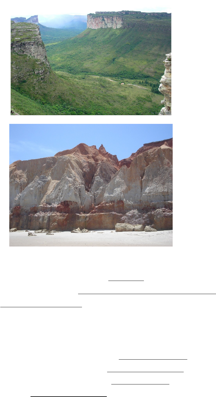 Semelhanças e Diferenças entre Chapadas e Tabuleiros Semelhanças entre chapadas e tabuleiros · São conjuntos de formas de relevo de topo plano; · Apresentam suas feições de relevo esculpidas em rochas sedimentares; · São delimitadas por escarpas. Diferenças entre chapadas e tabuleiros · Hipsometria: Os tabuleiros apresentam altitudes mais baixas, enquanto as chapadas situam-se em altitudes mais elevadas; · Localização: Os tabuleiros situam-se próximos ao litoral e as chapadas no interior dos continentes.