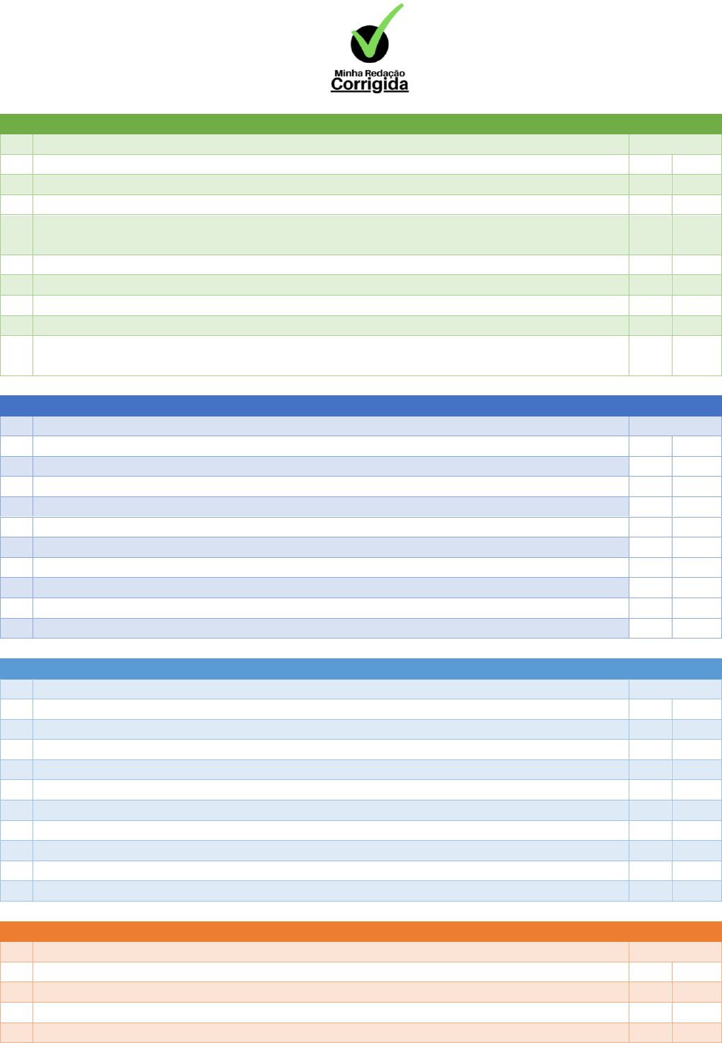 @minha.redacao.corrigida Checklist para introduções Etapas que devem ser seguidas Validação 01 A introdução possui contextualização? Sim Não 02 A contextualização foi escrita em menos de dois períodos? Sim Não 03 A relação entre a contextualização e a apresentação do tema está clara? Sim Não 04 A ligação entre a contextualização e a apresentação do tema possui pronome demonstrativo, conectivo ou outra forma adequada de retomada? Sim Não 05 A introdução possui apresentação do tema como um problema? Sim Não 06 A apresentação do tema possui palavras-chaves da frase temática ou sinônimos? Sim Não 07 O tema foi apresentado como um problema a ser discutido/ resolvido? Sim Não 08 A introdução antecipa quais são as causas do problema (sinalizando projeto de texto)? Sim Não 09 As causas do problema estão apresentadas de modo coerente com a introdução, sem indicação abrupta? Sim Não Checklist para desenvolvimento I Etapas que devem ser seguidas Validação 01 O parágrafo começa com conectivo aceito como interparágrafos? Sim Não 02 O desenvolvimento possui tópico frasal (coerente com a introdução)? Sim Não 03 Há repertório pertinente e produtivo? Sim Não 04 Há interpretação do repertório (consequências, exemplos, comparações)? Sim Não 05 Há no mínimo quatro períodos? Sim Não 06 Há progressão temática (sem mudança abrupta de assunto e sem repetição)? Sim Não 07 O parágrafo é coerente (sem contradições)? Sim Não 08 As informações são desenvolvidas adequadamente (sem lacunas)? Sim Não 09 O texto é bem organizado (sem falhas de projeto de texto)? Sim Não 10 Há fechamento do parágrafo (conclusão ou consequência)? Sim Não Checklist para desenvolvimento II Etapas que devem ser seguidas Validação 01 O parágrafo começa com conectivo aceito como interparágrafos? Sim Não 02 O desenvolvimento possui tópico frasal (coerente com a introdução)? Sim Não 03 Há repertório pertinente e produtivo? Sim Não 04 Há interpretação do repertório (consequências, exemplos, comparações)? Sim Não 05 Há no mínimo quatro períodos? Sim Não 06 Há progressão temática (sem mudança abrupta de assunto e sem repetição)? Sim Não 07 O parágrafo é coerente (sem contradições)? Sim Não 08 As informações são desenvolvidas adequadamente (sem lacunas)? Sim Não 09 O texto é bem organizado (sem falhas de projeto de texto)? Sim Não 10 Há fechamento do parágrafo (conclusão ou consequência)? Sim Não Checklist para conclusão Etapas que devem ser seguidas Validação 01 O parágrafo começa com conectivo aceito como interparágrafos? Sim Não 02 A conclusão possui tópico frasal? Sim Não 03 Há proposta de intervenção completa? Sim Não 04 As discussões propostas nos parágrafos de desenvolvimento foram retomadas? Sim Não