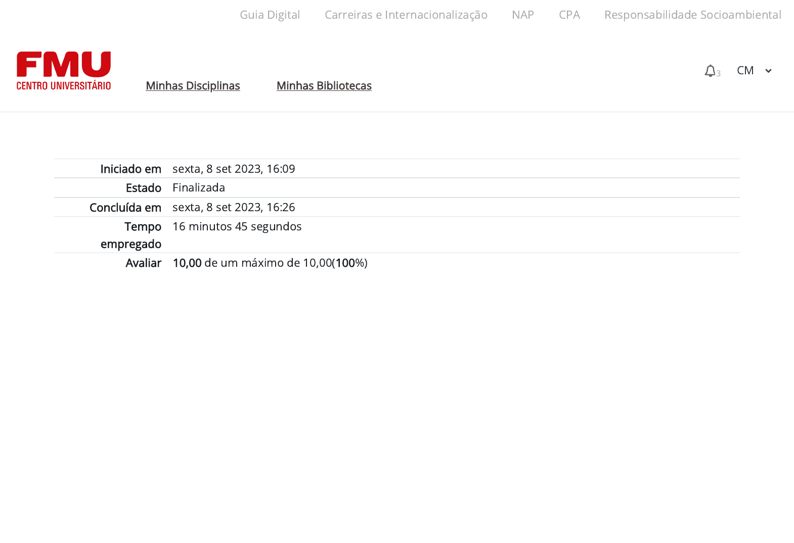 Iniciado em sexta, 8 set 2023, 16:09 Estado Finalizada Concluída em sexta, 8 set 2023, 16:26 Tempo empregado 16 minutos 45 segundos Avaliar 10,00 de um máximo de 10,00(100%) Guia Digital Carreiras e Internacionalização NAP CPA Responsabilidade Socioambiental Minhas Disciplinas Minhas Bibliotecas 3 CM https://codely-fmu-content.s3.amazonaws.com/Moodle/GuiaDigital/Guia+digital/index.html https://carreiras.fmu.br/ https://codely-fmu-content.s3.amazonaws.com/Moodle/NAP/inicial/nap/fmu/index.html https://codely-fmu-content.s3.amazonaws.com/Moodle/CPA/landing_CPA/index.html https://portal.fmu.br/sustentabilidade https://ambienteacademico.com.br/ https://ambienteacademico.com.br/ https://ambienteacademico.com.br/course/view.php?id=236 Questão 1 Correto Atingiu 1,00 de 1,00 De modo geral, a vigilância em saúde busca criar possíveis situações de riscos que podem impactar a saúde individual e coletiva. Esses riscos não são apenas associados a doenças infecciosas, mas sim a qualquer risco que possa expor alguém ao desenvolvimento de um estado patológico, seja físico ou mental. Considerando os tipos de riscos das vigilâncias, analise as a�rmativas. I. O excesso de carga horária é um risco iatrogênico. II. A poluição auditiva em grandes fábricas é um risco ocupacional. III. A falta de tratamento de esgoto é um risco institucional. IV. A violência é um dos tipos de risco social. V. Os riscos institucionais são vinculados aos procedimentos em saúde. Agora, assinale a alternativa com as a�rmativas corretas. a. I, II e III. b. II, III e IV. c. I, II e V. d. I, III e V. e. II e IV. Guia Digital Carreiras e Internacionalização NAP CPA Responsabilidade Socioambiental Minhas Disciplinas Minhas Bibliotecas 3 CM https://codely-fmu-content.s3.amazonaws.com/Moodle/GuiaDigital/Guia+digital/index.html https://carreiras.fmu.br/ https://codely-fmu-content.s3.amazonaws.com/Moodle/NAP/inicial/nap/fmu/index.html https://codely-fmu-content.s3.amazonaws.com/Moodle/CPA/landing_CPA/index.html https://portal.fmu.br/sustentabilidade https://ambienteacademico.com.br/ https://ambienteacademico.com.br/ https://ambienteacademico.com.br/course/view.php?id=236 Questão 2 Correto Atingiu 1,00 de 1,00 Leia o trecho a seguir. “Moradores do Distrito Federal e das demais unidades da federação participam, a partir desta semana, da coleta de informações da Pesquisa Nacional de Saúde (PNS). Realizado pelo Instituto Brasileiro de Geogra�a e Estatística (IBGE), o estudo atingirá 108 mil domicílios em mais de 2 mil municípios do Brasil até fevereiro de 2020. Ele tem o objetivo de investigar a prevalência de doenças crônicas não transmissíveis e quanti�car a população com incapacidades físicas” (SECRETARIA DE SAÚDE DO DISTRITO FEDERAL, 2019). SECRETARIA DE SAÚDE DO DISTRITO FEDERAL. Coleta de dados para a Pesquisa Nacional de Saúde é iniciada. Secretaria de Saúde do Distrito Federal. Brasília, 2019. Disponível em: http://www.saude.df.gov.br/coleta-de-dados-para-a-pesquisa-nacional-de-saude-e-iniciada/. Acesso em: 22 dez. 2020. Agora, analise as alternativas abaixo. I. A coleta de dados para vigilância é centralizada na esfera federal, e as esferas municipais e estaduais não têm autonomia para coleta, apenas para análise. II. Os planos de controle e prevenção são elaborados a partir da coleta e análise de dados. III. Os dados de coleta são mantidos em sigilo pelas unidades de saúde, não sendo divulgados para a população de modo geral. IV. As etapas de coleta incluem o processamento, a análise, a interpretação de dados e a análise da e�cácia da coleta. V. Os dados podem ser coletados em campanhas (entrevistas) e análises de prontuários. Assinale a alternativa com as alternativas corretas. a. III, IV e V. b. II, IV e V. c. I, II e V. d. I, II e IV. e. I, II e III. Guia Digital Carreiras e Internacionalização NAP CPA Responsabilidade Socioambiental Minhas Disciplinas Minhas Bibliotecas 3 CM http://www.saude.df.gov.br/coleta-de-dados-para-a-pesquisa-nacional-de-saude-e-iniciada/ https://codely-fmu-content.s3.amazonaws.com/Moodle/GuiaDigital/Guia+digital/index.html https://carreiras.fmu.br/ https://codely-fmu-content.s3.amazonaws.com/Moodle/NAP/inicial/nap/fmu/index.html https://codely-fmu-content.s3.amazonaws.com/Moodle/CPA/landing_CPA/index.html https://portal.fmu.br/sustentabilidade https://ambienteacademico.com.br/ https://ambienteacademico.com.br/ https://ambienteacademico.com.br/course/view.php?id=236 Questão 3 Correto Atingiu 1,00 de 1,00 A vigilância em saúde é composta por determinadas frentes que se preocupam com segmentos especí�cos que impactam a saúde coletiva. Esses segmentos podem estar relacionados com o modo de vida, a exposição a compostos nocivos, as interações ambientais, entre outros fatores. A�nal, a saúde é um conceito muito mais complexo que a “ausência de doença”. Ponderando sobre as subáreas da vigilância em saúde, enumere as situações, indicando qual vigilância está relacionada com a situação. 1 - Vigilância Ambiental 2 - Vigilância Epidemiológica 3 - Vigilância da Saúde do Trabalhador [ ] Uma determinada região apresentou aumento de doenças respiratórias devido à extensa eliminação de fuligem de uma empresa local. [ ] Uma escola do interior foi fechada devido ao aumento do número de alunos com sarampo. [ ] Uma cidade fortaleceu campanhas de vacinação devido a um surto de varíola. [ ] Em um escritório, os funcionários começaram a apresentar lesão por esforço repetitivo devido às longas horas de trabalho. [ ] Uma infestação de ratos levou à elaboração de uma campanha de conscientização sobre o descarte inadequado de alimentos. Agora, assinale a alternativa com a sequência correta. a. 1 - 2 - 2 - 3 - 2. b. 1 - 2 - 2 - 3 -1. c. 3 - 2 - 1 - 1 - 3. d. 3 - 2 - 1 - 3 - 2. e. 2 - 1 - 3 - 2 - 1. Guia Digital Carreiras e Internacionalização NAP CPA Responsabilidade Socioambienta