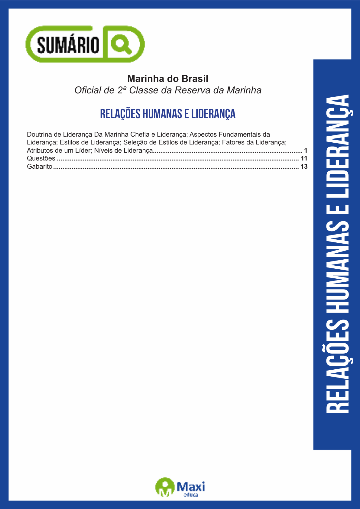 Re la çõ es H um an as e Lid er an ça Doutrina de Liderança Da Marinha Chefia e Liderança; Aspectos Fundamentais da Liderança; Estilos de Liderança; Seleção de Estilos de Liderança; Fatores da Liderança; Atributos de um Líder; Níveis de Liderança................................................................................. 1 Questões ................................................................................................................................... 11 Gabarito ..................................................................................................................................... 13 Marinha do Brasil Oficial de 2ª Classe da Reserva da Marinha Relações Humanas e Liderança 1739693 E-book gerado especialmente para HALLANA OLIVEIRA DA SILVA 1 DOUTRINA DE LIDERANÇA DA MARINHA – Chefia e Liderança; Aspectos Fundamen- tais da Liderança; Estilos de Liderança; Seleção de Estilos de Liderança; Fatores da Li- derança; Atributos de um Líder; Níveis de LiderançA CHEFIA E LIDERANÇA O exercício da chefia, comando ou direção, é entendido pelo conjunto de ações e decisões tomadas pelo mais antigo, com autoridade para tal, na sua esfera de competência, afim de conduzir de forma integrada o setor que lhe é confiado No desempenho de suas funções, os mais antigos, normalmente, desempenham dois papéis funcionais, a saber: o de “chefe” e o de “condutor de homens”. Em relação ao primeiro papel, prevalece a autorida- de advinda da responsabilidade atribuída à função, associada com aquela decorrente de seu posto ou graduação, à qual passaremos a definir, genericamente, como chefia. Com respeito ao segundo papel, identifica-se um estreito relacionamento com o atributo de líder. Neste contexto, fica ressaltada a im- portância da capacidade individual dos mais antigos em influenciarem e inspirarem os seus subordina- dos. Caracterizados esses dois atributos do comandante, o de chefe e o de líder, pode-se afirmar que coman- dar é exercer a chefia e a liderança, a fim de conduzir eficazmente a organização no cumprimento da missão. Sendo o exercício do comando um processo abrangente, a divisão ora apresentada será utiliza- da para efeito de uma melhor compreensão do tema em lide, pois chefia e liderança não são processos alternativos e sim, simultâneos e complementares. Os melhores resultados no tocante à liderança ocorrem quando ela é desenvolvida, não sendo impositi- va. Neste contexto, a liderança deve ser entendida como um processo dinâmico e progressivo de apren- dizado, o qual, desenvolvido nos cursos de carreira e no dia a dia das OM, trará não só evidentes bene- fícios às organizações, como também contribuirá para o sucesso profissional individual de cada militar. Desta forma, o contínuo desenvolvimento das qualidades dos militares da MB como líderes deverá ser objeto de atenta e permanente atenção, a ser trabalhada, conjuntamente, pela instituição e, prioritaria- mente, por cada militar. ASPECTOS FUNDAMENTAIS DA LIDERANÇA Neste tópico serão abordados aspectos relacionados aos tipos de liderança. Existem diversas conceituações para liderança na literatura especializada. A Marinha do Brasil define liderança como: “o processo que consiste em influenciar pessoas no sentido de que ajam, voluntaria- mente, em prol do cumprimento da missão”. Fica evidenciado, pela definição, que a liderança inclui não só a capacidade de fazer um grupo realizar uma tarefa específica mas, sobretudo, executá-la de forma voluntária, atendendo ao desejo do líder como se fosse o seu próprio. Nessa definição de liderança, estão implícitos os seus agentes, ou seja, o líder e os liderados, as re- lações entre eles e os princípios filosóficos, psicológicos e sociológicos que regem o comportamento humano. Aspectos Filosóficos A Filosofia tem como característica desenvolver o senso crítico, que fornece ao indivíduo bases metodo- lógicas para efetuar, permanentemente, o exame corrente da situação, favorecendo o processo de toma- da de decisões. Tal prática é fundamental ao exercício da liderança, podendo-se verificar que o requisito 1739693 E-book gerado especialmente para HALLANA OLIVEIRA DA SILVA 2 pensamento crítico está direta ou indiretamente associado a diversos atributos de liderança prescritos nesta Doutrina A Axiologia, também conhecida como a teoria dos valores, é considerada a parte mais nobre da Filoso- fia. O processo de influenciação de um grupo, que é a essência da liderança, está profundamente ligado aos valores éticos e morais que devem ser transmitidos e praticados pelo líder. A prática dos fundamentos filosóficos da educação, seja ela formal ou informal, desenvolvida por gru- pos sociais, independente de suas crenças e culturas, constitui-se no elemento catalisador dos valores universais. O ser humano precisa receber uma educação adequada para ser capaz de valorizar um objeto (a vida humana, a Pátria, a família). Sem essa educação, perde-se a capacidade de perceber esses valores, especialmente quando se trata daqueles universais, tais como: honra, dignidade e honestidade. A característica fundamental da Axiologia consiste na hierarquização desses valores, que são transmi- tidos pela educação familiar, pela sociedade e pelo grupo. Essa hierarquização de valores varia de um país para o outro, de uma sociedade organizada para outra, de um grupo social para outro. Por exemplo, os fundamentalistas islâmicos, que se sacrificam em atentados, contrariando o instinto de preservação, valor primordial do ser humano. Valores como a honra, a dignidade, a honestidade, a lealdade e o amor à pátria, assim como todos os outros considerados vitais pela Marinha, devem ser praticados e transmitidos, permanentemente, pelo líder aos seus liderados. A tarefa de doutrinamento visa a transmitir a sua correta hierarquização, priori- zando-o