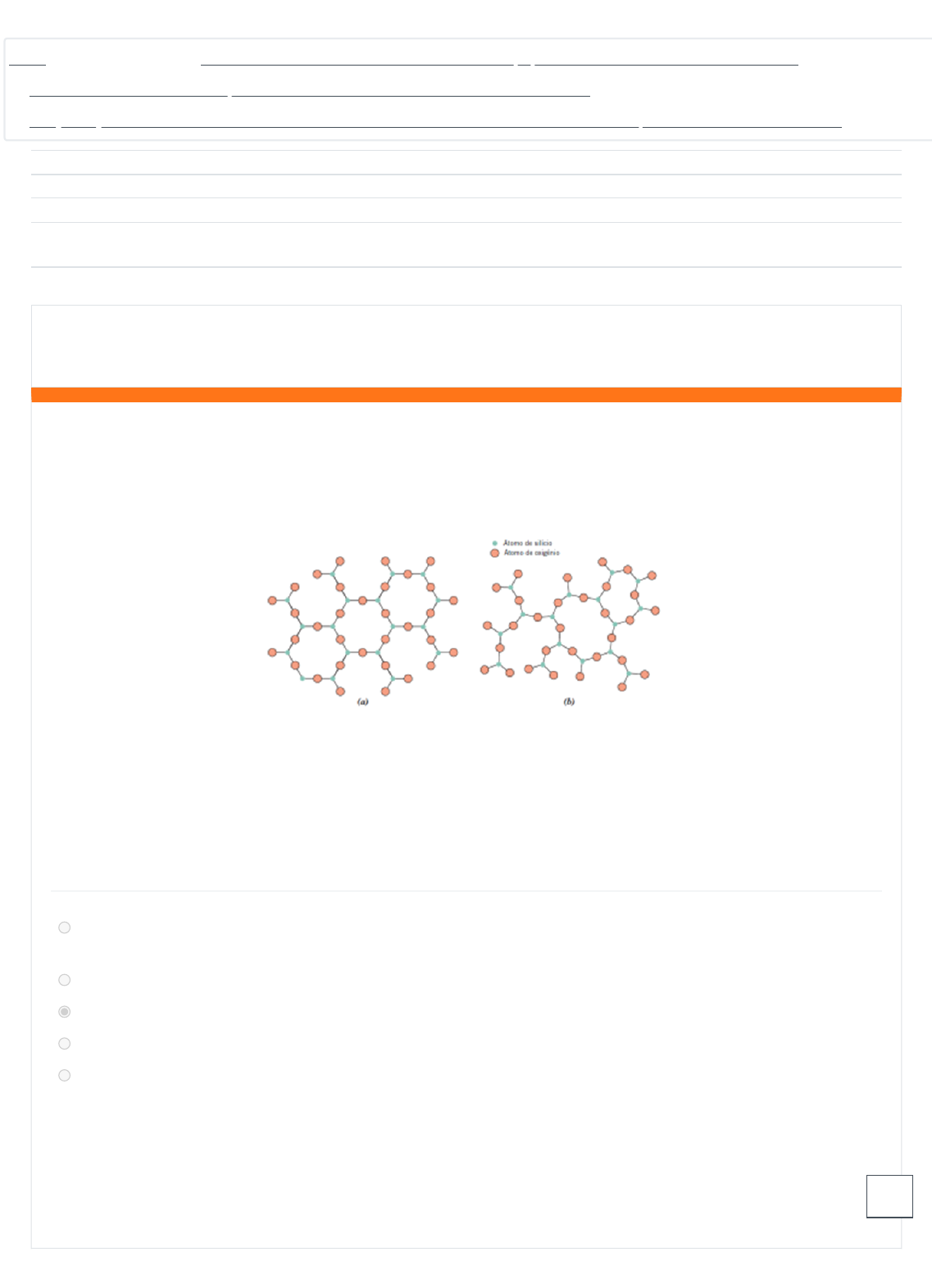 Iniciado em quinta, 7 set 2023, 13:11 Estado Finalizada Concluída em quinta, 7 set 2023, 13:20 Tempo empregado 9 minutos 4 segundos Avaliar 5,40 de um máximo de 6,00(90%) Questão 1 Correto Atingiu 0,60 de 0,60 Observe a Figura 1, onde são mostradas duas estruturas atômicas para o dióxido de silício (SiO2), material cerâmico que pode se apresentar tanto na forma estrutural cristalina quanto na forma não cristalina. Na representação bidimensional das estruturas, notamos diferenças entre os arranjos para o primeiro e o segundo caso mencionado. Figura 1: Estruturas atômicas do SiO2 cristalino e não cristalino. Fonte: Callister e Rethwischi (2016). Note que em ambos os casos a ligação atômica se dá na mesma proporção, onde três átomos de oxigênio se ligam a cada átomo de silício. A Figura 2ª representa o material em forma cristalina, enquanto a Figura 2b ilustra o material não cristalino. Dentro deste contexto, assinale a alternativa com afirmação correta: a. Os materiais com estrutura atômica amorfa em geral apresentam arranjos com menor grau de complexidade e têm maior facilidade para apresentar organização em sua estrutura. b. As interferências no processo de formação do material sólido não irão influenciar a organização de sua estrutura. c. A disposição dos átomos, seu posicionamento e distância estão mais regulares e uniformes para o material cristalino. d. A estrutura não cristalina necessariamente deve apresentar um maior número de átomos. e. Os materiais podem apresentar cristalinidade ou não ainda que possuam a mesma proporção porque os fatores de formação da estrutura não influenciam esse processo. Sua resposta está correta. A resposta correta é: A disposição dos átomos, seu posicionamento e distância estão mais regulares e uniformes para o material cristalino. Painel / Minhas Disciplinas / TECNOLOGIA EM ENERGIAS RENOVÁVEIS-disc. 3.1(23)- CIÊNCIA E TECNOLOGIA DOS MATERIAIS / PROVA CURRICULAR - REALIZAÇÃO DIA 07/09/2023 ATÉ 10/09/2023 - VALOR 6,0 PONTOS / CLIQUE AQUI PARA REALIZAR A PROVA CURRICULAR - DIA 07/09/2023 ATÉ 10/09/2023 - VALOR 6,0 PONTOS - 1ª OPORTUNIDADE https://www.eadunifatecie.com.br/course/view.php?id=18131 https://www.eadunifatecie.com.br/my/ https://www.eadunifatecie.com.br/course/view.php?id=18131 https://www.eadunifatecie.com.br/course/view.php?id=18131#section-11 https://www.eadunifatecie.com.br/mod/quiz/view.php?id=577651 Questão 2 Correto Atingiu 0,60 de 0,60 Questão 3 Correto Atingiu 0,60 de 0,60 O conhecimento de alguns conceitos básicos é fundamental para o entendimento e uso dos diagramas de fases. Assim, assinale verdadeiro ou falso para as afirmativas a seguir: ( ) Os componentes são as substâncias que compõem o material em estudo pelo diagrama. ( ) No estudo dos diagramas, soluto e solvente são componentes da liga ou material. ( ) Solução sólida expressa a reunião de átomos de um mesmo tipo, que constituem um material sólido. ( ) O limite de solubilidade é o valor limite de concentração de soluto, dada uma temperatura e/ou pressão específica, em um determinado material. a. F-F-F-V b. V-F-V-F c. V-V-F-V d. F-F-V-F e. V-V-V-V Sua resposta está correta. A resposta correta é: V-V-F-V Assinale verdadeiro ou falso: ( ) A difusão intersticial se dá de forma mais rápida que por lacunas. ( ) A ocorrência e quantidade de lacunas em uma estrutura varia de acordo com alguns fatores, como a temperatura. ( ) O movimento dos átomos e lacunas na estrutura, durante o mecanismo de difusão, possui sentidos iguais e direções diferentes. ( ) A difusão intersticial ocorre independente da presença de vazios nos interstícios da estrutura. a. V-F-V-F b. V-F-F-F c. V-F-V-F d. F-V-V-F e. V-V-F-F Sua resposta está correta. A resposta correta é: V-V-F-F Questão 4 Correto Atingiu 0,60 de 0,60 A tabela a seguir apresenta algumas características mecânicas de cinco materiais. Com base nos dados da tabela, assinale a alternativa correta que indica o material com maior valor de rigidez: a. O material B. b. O material D. c. O material A. d. O material E. e. O material C. Sua resposta está correta. A resposta correta é: O material E. Questão 5 Correto Atingiu 0,60 de 0,60 Questão 6 Incorreto Atingiu 0,00 de 0,60 Sabe-se que um dado material apresenta elevada ductilidade, boa condutividade térmica e elétrica, característica opaca e possui composição pura, ou seja, não provém da mistura de diferentes tipos de materiais. De acordo com as propriedades e classificação dos materiais, este dado material é: a. Nenhuma das alternativas anteriores. b. Um polímero. c. Um compósito. d. Um metal. e. Uma cerâmica. Sua resposta está correta. A resposta correta é: Um metal. Geralmente são encontradas nas composições metálicas três diferentes tipos de estruturas cristalinas, que são relativamente simples e ocorrem entre os elementos metálicos mais comumente encontrados. São elas: a. Cúbica de faces expostas (CFE), Cúbica de corpo curvado (CCC) e Hexagonal compacta (HC). b. Cúbica de faces centradas (CFC), Cúbica de corpo centrado (CCC) e Cúbica hexagonal compacta (CHC). c. Cúbica de faces centradas (CFC), Cúbica de corpo curvado (CCC) e Hexagonal compacta (HC). d. Cúbica de faces centradas (CFC), Cúbica de corpo centrado (CCC) e Hexagonal compacta (HC). e. Nenhuma das alternativas anteriores. Sua resposta está incorreta. A resposta correta é: Cúbica de faces centradas (CFC), Cúbica de corpo centrado (CCC) e Hexagonal compacta (HC). Questão 7 Correto Atingiu 0,60 de 0,60 Outro aspecto importante para o entendimento das propriedades mecânicas é a compreensão do conceito de deformação. As deformações são os principais resultados observados nos corpos de materiais devido aos esforços mecânicos aplicados. Dividimos as deformações normalmente em elásticas e plásticas. Analise as afirmações a seguir: I – A deformação elástica é o processo de defor