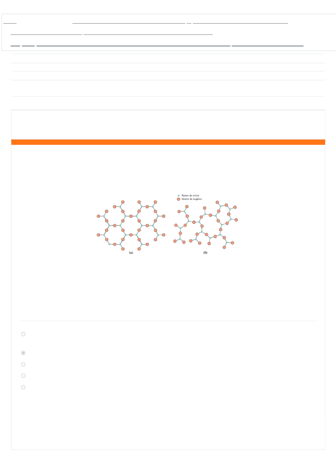 Iniciado em sábado, 9 set 2023, 10:20 Estado Finalizada Concluída em sábado, 9 set 2023, 10:29 Tempo empregado 9 minutos 26 segundos Avaliar 6,00 de um máximo de 6,00(100%) Questão 1 Correto Atingiu 0,60 de 0,60 Observe a Figura 1, onde são mostradas duas estruturas atômicas para o dióxido de silício (SiO2), material cerâmico que pode se apresentar tanto na forma estrutural cristalina quanto na forma não cristalina. Na representação bidimensional das estruturas, notamos diferenças entre os arranjos para o primeiro e o segundo caso mencionado. Figura 1: Estruturas atômicas do SiO2 cristalino e não cristalino. Fonte: Callister e Rethwischi (2016). Note que em ambos os casos a ligação atômica se dá na mesma proporção, onde três átomos de oxigênio se ligam a cada átomo de silício. A Figura 2ª representa o material em forma cristalina, enquanto a Figura 2b ilustra o material não cristalino. Dentro deste contexto, assinale a alternativa com afirmação correta: a. Os materiais com estrutura atômica amorfa em geral apresentam arranjos com menor grau de complexidade e têm maior facilidade para apresentar organização em sua estrutura. b. A disposição dos átomos, seu posicionamento e distância estão mais regulares e uniformes para o material cristalino. c. A estrutura não cristalina necessariamente deve apresentar um maior número de átomos. d. As interferências no processo de formação do material sólido não irão influenciar a organização de sua estrutura. e. Os materiais podem apresentar cristalinidade ou não ainda que possuam a mesma proporção porque os fatores de formação da estrutura não influenciam esse processo. Sua resposta está correta. A resposta correta é: A disposição dos átomos, seu posicionamento e distância estão mais regulares e uniformes para o material cristalino. Painel / Minhas Disciplinas / TECNOLOGIA EM ENERGIAS RENOVÁVEIS-disc. 3.1(23)- CIÊNCIA E TECNOLOGIA DOS MATERIAIS / PROVA CURRICULAR - REALIZAÇÃO DIA 07/09/2023 ATÉ 10/09/2023 - VALOR 6,0 PONTOS / CLIQUE AQUI PARA REALIZAR A PROVA CURRICULAR - DIA 07/09/2023 ATÉ 10/09/2023 - VALOR 6,0 PONTOS - 1ª OPORTUNIDADE https://www.eadunifatecie.com.br/course/view.php?id=18131 https://www.eadunifatecie.com.br/my/ https://www.eadunifatecie.com.br/course/view.php?id=18131 https://www.eadunifatecie.com.br/course/view.php?id=18131#section-11 https://www.eadunifatecie.com.br/mod/quiz/view.php?id=577651 Questão 2 Correto Atingiu 0,60 de 0,60 Questão 3 Correto Atingiu 0,60 de 0,60 Em decorrência da capacidade maior ou menor de conduzir ou resistir a corrente elétrica os materiais são em geral classificados em condutores, semicondutores e isolantes. Os condutores exibem valores de condutividade da faixa de 10 (Ω∙m) , os semicondutores numa faixa entre 10 e 10 (Ω∙m) , enquanto os isolantes apresentam valores na faixa entre 10 e 10 (Ω∙m) . Os materiais considerados melhores condutores pertencem ao grupo (assinale a alternativa correta): a. Metais. b. Compósitos. c. Polímeros. d. Cerâmicas. e. Não há um grupo que se destaque. 7 -1 -6 -4 -1 -10 -20 -1 Sua resposta está correta. A resposta correta é: Metais. O desenvolvimento de um conjunto de características mecânicas desejáveis para um material resulta, com frequência, de uma transformação de fase, decorrente de um tratamento térmico. Geralmente, as transformações de fases não ocorrem de forma instantânea, sendo necessários tempos para a concretização da transformação e o progresso de uma transformação de fase pode ser dividido em dois estágios distintos. Os dois estágios das transformações de fases são: a. Nucleação e expansão. b. Crescimento e expansão. c. Nucleação e crescimento. d. Transmutação e expansão. e. Difusão e crescimento. Sua resposta está correta. A resposta correta é: Nucleação e crescimento. Questão 4 Correto Atingiu 0,60 de 0,60 Assinale a alternativa correta, referente à melhor definição de Ciência e Engenharia dos Materiais: a. Área correspondente ao estudo, desenvolvimento e aplicação de materiais para a construção civil. b. Estudo dos materiais compósitos. c. Área da atividade humana correspondente somente a elaboração de novos materiais. d. Área da atividade humana associada com a geração e a aplicação de conhecimentos que relacionem composição, estrutura e processamento de materiais às suas propriedades e usos. e. Área da atividade humana associada com a utilização dos conhecimentos sobre os distintos materiais, existente a partir do século XXI. Sua resposta está correta. A resposta correta é: Área da atividade humana associada com a geração e a aplicação de conhecimentos que relacionem composição, estrutura e processamento de materiais às suas propriedades e usos. Questão 5 Correto Atingiu 0,60 de 0,60 Questão 6 Correto Atingiu 0,60 de 0,60 Ao estudarmos os sólidos cristalinos, uma grande atenção se deve ao grupo dos metais, já que são materiais cujos arranjos de seus elementos tornam regra a ocorrência de estruturas cristalinas. I - Para este grupo, são praticamente inexistentes os limites ao respeito da proximidade, quantidade e posição dos átomos na composição do material, levando a ocorrência de estruturas atômicas cristalinas com arranjos mais espaçados, com distâncias maiores entre os seus átomos constituintes. Porque II - As ligações entre os átomos dos elementos metálicos, ou seja, a ligação metálica contribui para existência da própria estrutura cristalina. a. As asserções I e II são proposições verdadeiras e a II é uma justificativa correta da I. b. As asserções I e II são proposições verdadeiras e a II é uma justificativa incorreta. c. A asserção I é uma proposição verdadeira, mas a asserção II é falsa. d. A asserção I é falsa, mas a asserção II é verdadeira. e. As asserções I e II são proposições falsas. Sua resposta está correta. A respo