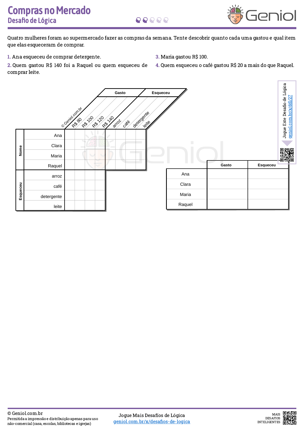 Quatro mulheres foram ao supermercado fazer as compras da semana. Tente descobrir quanto cada uma gastou e qual item que elas esqueceram de comprar. © Geniol.com.br Permitida a impressão e distribuição apenas para uso não-comercial (casa, escolas, bibliotecas e igrejas) Jogue Mais Desafíos de Lógica geniol.com.br/x/desa�os-de-logica MAIS DESAFIOS INTELIGENTES 1. Ana esqueceu de comprar detergente. 2. Quem gastou R$ 140 foi a Raquel ou quem esqueceu de comprar leite. 3. Maria gastou R$ 100. 4. Quem esqueceu o café gastou R$ 20 a mais do que Raquel. Compras no Mercado Desa�o de Lógica leite detergente café arroz Raquel Maria Clara Ana lei te de ter ge nte ca fé ar ro z R$ 14 0 R$ 12 0 R$ 10 0 R$ 80 EsqueceuGasto Es qu ec eu N om e © Ge nio l.c om .br Raquel Maria Clara Ana EsqueceuGasto J o g u e E st e D e sa � o d e L ó g ic a g e n io l. c o m .b r/ x /d d l/ 2 7 https://www.geniol.com.br/x/main/home/?src=GLGPR&evt=copyright-footer/click https://www.geniol.com.br/x/desafios-de-logica/?src=GLGPR&evt=play-more/click https://www.geniol.com.br/x/main/home/?src=GLGPR&evt=logo/click https://www.geniol.com.br/x/ddl/27/?src=GLGPR&evt=link-widget/click