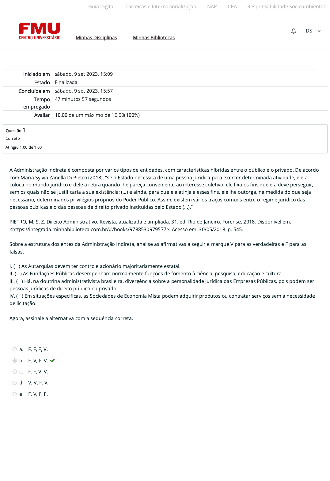 Iniciado em sábado, 9 set 2023, 15:09 Estado Finalizada Concluída em sábado, 9 set 2023, 15:57 Tempo empregado 47 minutos 57 segundos Avaliar 10,00 de um máximo de 10,00(100%) Questão 1 Correto Atingiu 1,00 de 1,00 A Administração Indireta é composta por vários tipos de entidades, com características híbridas entre o público e o privado. De acordo com Maria Sylvia Zanella Di Pietro (2018), “se o Estado necessita de uma pessoa jurídica para exercer determinada atividade, ele a coloca no mundo jurídico e dele a retira quando lhe pareça conveniente ao interesse coletivo; ele �xa os �ns que ela deve perseguir, sem os quais não se justi�caria a sua existência; (...) e ainda, para que ela atinja a esses �ns, ele lhe outorga, na medida do que seja necessário, determinados privilégios próprios do Poder Público. Assim, existem vários traços comuns entre o regime jurídico das pessoas públicas e o das pessoas de direito privado instituídas pelo Estado (...).” PIETRO, M. S. Z. Direito Administrativo. Revista, atualizada e ampliada. 31. ed. Rio de Janeiro: Forense, 2018. Disponível em: <https://integrada.minhabiblioteca.com.br/#/books/9788530979577>. Acesso em: 30/05/2018. p. 545. Sobre a estrutura dos entes da Administração Indireta, analise as a�rmativas a seguir e marque V para as verdadeiras e F para as falsas. I. ( ) As Autarquias devem ter controle acionário majoritariamente estatal. II. ( ) As Fundações Públicas desempenham normalmente funções de fomento à ciência, pesquisa, educação e cultura. III. ( ) Há, na doutrina administrativista brasileira, divergência sobre a personalidade jurídica das Empresas Públicas, pois podem ser pessoas jurídicas de direito público ou privado. IV. ( ) Em situações especí�cas, as Sociedades de Economia Mista podem adquirir produtos ou contratar serviços sem a necessidade de licitação. Agora, assinale a alternativa com a sequência correta. a. F, F, F, V. b. F, V, F, V. c. F, F, V, V. d. V, V, F, V. e. F, V, F, F. Guia Digital Carreiras e Internacionalização NAP CPA Responsabilidade Socioambiental Minhas Disciplinas Minhas Bibliotecas DS https://codely-fmu-content.s3.amazonaws.com/Moodle/GuiaDigital/Guia+digital/index.html https://carreiras.fmu.br/ https://codely-fmu-content.s3.amazonaws.com/Moodle/NAP/inicial/nap/fmu/index.html https://codely-fmu-content.s3.amazonaws.com/Moodle/CPA/landing_CPA/index.html https://portal.fmu.br/sustentabilidade https://ambienteacademico.com.br/ https://ambienteacademico.com.br/ https://ambienteacademico.com.br/course/view.php?id=236 Questão 2 Correto Atingiu 1,00 de 1,00 O tema do controle das entidades administrativas vem ganhando um grande espaço na mídia, como decorrência dos vários escândalos de abuso de prerrogativas públicas testemunhados nos últimos anos no país. Neste sentido, Márcio Pestana (2014) a�rma que “no plano federal o controle ou tutela ganha a denominação de supervisão ministerial, a qual, segundo desenho legislativo empreendido pelo Decreto-lei no 200/1967, signi�ca que todo e qualquer órgão da Administração Federal indireta está sujeito à supervisão do ministro de Estado competente (art. 19 do Decreto-lei no 200/1967), que a exercerá por meio da orientação, coordenação e controle das atividades dos órgãos subordinados ou vinculados ao Ministério (art. 20 do Decreto-lei no 200/1967)”. PESTANA, M. Direito Administrativo Brasileiro. 4. ed. São Paulo: Atlas, 2014. p. 50. Disponível em: <https://goo.gl/R1q9QA>. Acesso em: 04/08/2018. Sobre o tema, pode-se a�rmar que: Os Ministros de Estado exercem o controle hierárquico sobre os entes, órgãos e agentes da Administração Direta e Indireta PORQUE Em virtude do Regime Jurídico-Administrativo assumem pessoalmente a responsabilidade sobre os atos de seus subordinados. Assinale a alternativa correta. a. As proposições I e II são verdadeiras, mas a II não é justi�cativa da I. b. A proposição I é verdadeira e a proposição II é falsa. c. A proposição I é falsa e a proposição II é verdadeira. d. As proposições I e II são verdadeiras e a proposição II é justi�cativa da I. e. As proposições I e II são falsas. Guia Digital Carreiras e Internacionalização NAP CPA Responsabilidade Socioambiental Minhas Disciplinas Minhas Bibliotecas DS https://goo.gl/R1q9QA https://codely-fmu-content.s3.amazonaws.com/Moodle/GuiaDigital/Guia+digital/index.html https://carreiras.fmu.br/ https://codely-fmu-content.s3.amazonaws.com/Moodle/NAP/inicial/nap/fmu/index.html https://codely-fmu-content.s3.amazonaws.com/Moodle/CPA/landing_CPA/index.html https://portal.fmu.br/sustentabilidade https://ambienteacademico.com.br/ https://ambienteacademico.com.br/ https://ambienteacademico.com.br/course/view.php?id=236 Questão 3 Correto Atingiu 1,00 de 1,00 Questão 4 Correto Atingiu 1,00 de 1,00 Fernando é servidor público concursado do INSS. Desde que adquiriu a condição de servidor estável começou a gerar vários problemas. Acumulam-se denúncias e reclamações de que ele trata mal as pessoas que atende, chega atrasado ou falta vários dias sem dar satisfação, e até de que costuma divulgar em grupos nas redes sociais as causas dos pedidos de benefício por enfermidade (incluso o nome do requerente) que passam por suas mãos. Soma-se a estas denúncias a comprovação de que ele está acumulando ilegalmente outra função na Prefeitura. Seu chefe imediato preparou para a assessoria jurídica a seguinte lista para saber quais condutas poderiam gerar a demissão de Fernando: I. Tratar mal as pessoas que atende. II. Chegar atrasado ou faltar vários dias sem dar qualquer tipo de satisfação. III. Divulgar em redes sociais informações pessoais dos requerentes de benefício previdenciário. IV. Estar acumulando ilegalmente outra função na Prefeitura. Se efetivamente provadas, podem ser causa de demissão de Fernando as seguintes condutas: a. III e IV, apenas