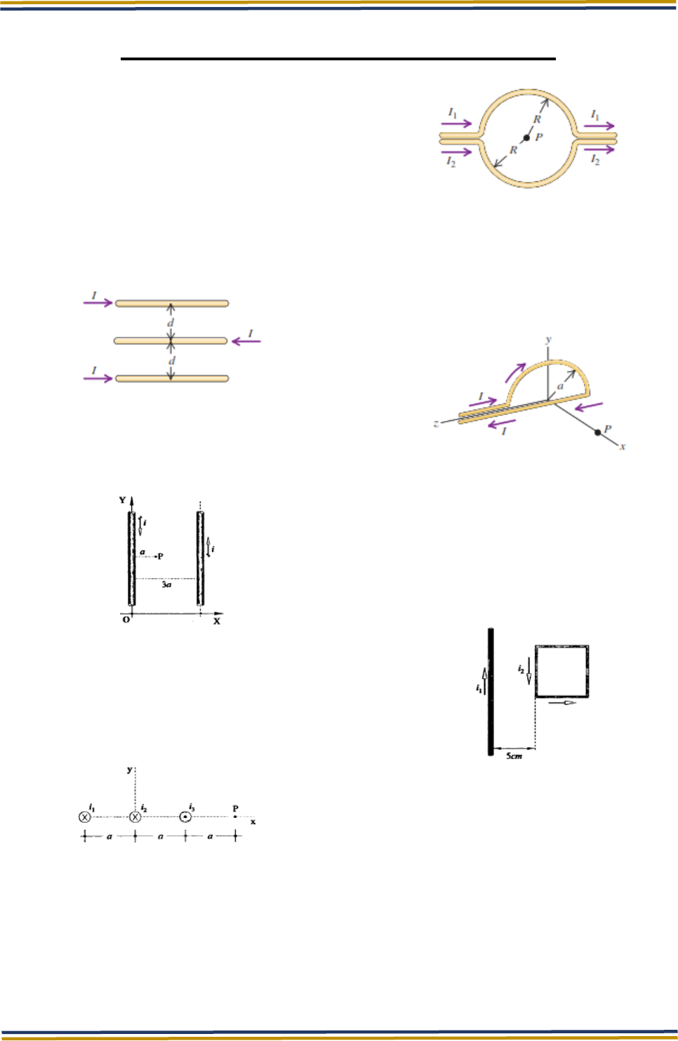 UNIVERSIDAD MAYOR DE SAN ANDRÉS FACULTAD DE INGENIERÍA UNIV. SANDOVAL ARNEZ NICOLAS RAFAEL ANTONIO FIS-200 PRÁCTICA PRIMER PARCIAL FIS 200 1. Deducir una expresión que calcule la fuerza magnética entre dos segmentos paralelos de corriente. 2. Cada uno de los tres alambres paralelos conduce una corriente I en los sentidos que se indican en la figura. Si la separación entre alambres adyacentes es d, calcule la magnitud y dirección de la fuerza magnética por unidad de longitud de cada alambre. 3. En la siguiente figura se puede observar dos conductores por los cuales circula la misma corriente 𝒊. Calcular la inducción magnética en el punto 𝑷. (𝒊 = 𝟏𝟎 𝑨; 𝒂 = 𝟎, 𝟓 𝒄𝒎) 4. En la siguiente figura se puede observar tres conductores infinitos y recorridos con corrientes de intensidades 𝒊𝟏 = 𝟐 𝑨, 𝒊𝟐 = 𝟖 𝑨, 𝒊𝟑 = 𝟗 𝑨. Calcular la inducción magnética 𝑩 en el punto 𝑷, si se sabe que 𝒂 = 𝟑 𝒄𝒎. 5. Calcule la magnitud del campo magnético en el punto p de la figura en términos de R, I1 e I2. ¿Qué resultado da su expresión cuando I1=I2? 6. Un alambre en forma de semicírculo con radio a esta orientado en el plano yz con su centro de curvatura en el origen (Ver figura). Si la corriente en el alambre es I, calcule las componentes del campo magnético producido en el punto p, a una distancia x a lo largo del eje x. 7. Un conductor muy largo y una espira cuadrada de lado 𝒂 = 𝟑𝟎 𝒄𝒎 se encuentran en un mismo plano, según se muestra en la figura. Si las corrientes que las recorren tienen intensidades 𝒊𝟏 = 𝟏𝟎𝟎 𝑨, e intensidades 𝒊𝟐 = 𝟏𝟓𝟎 𝑨, calcular la fuerza resultante sobre la espira. 8. En la figura, el campo magnético uniforme y vertical tiene una intensidad 𝑩 = 𝟎, 𝟐 𝑻. La barra conductora de longitud 𝒍 = 𝟎, 𝟏 𝒎 y masa 𝒎 = 𝟓𝟎 𝒈 se desliza por dos guías conductoras horizontales que lo conectan a una resistencia 𝑹 = 𝟐, 𝟓 𝛀 . La barra se mueve con velocidad 𝒗 = 𝟓 𝒎/𝒔, que es perpendicular a si misma, siendo su resistencia 𝒓 = 𝟎, 𝟓 𝛀. Calcular: a) La intensidad de corriente del circuito. UNIVERSIDAD MAYOR DE SAN ANDRÉS FACULTAD DE INGENIERÍA UNIV. SANDOVAL ARNEZ NICOLAS RAFAEL ANTONIO FIS-200 b) Que fuerza, en dirección del movimiento será necesario aplicar a la barra para que se mueva uniformemente con la velocidad indicada. c) La potencia térmica del circuito que se desprende del circuito. d) La potencia mecánica necesaria para que la barra se mantenga en movimiento, siendo el coeficiente de rozamiento 𝝁 = 𝟎, 𝟐𝟑 (𝒈 = 𝟏𝟎 𝒎/𝒔𝟐) 9. Un anillo conductor circular con radio 𝒓𝟎 = 𝟎, 𝟎𝟒𝟐𝟎 𝒎 esta en el plano xy en una región de campo magnético uniforme �⃗⃗� = 𝑩𝟎[𝟏 − 𝟑(𝒕/𝒕𝟎) 𝟐 + 𝟐(𝒕/𝒕𝟎) 𝟑]�̂�. En esta expresión, 𝒕𝟎 = 𝟎, 𝟎𝟏𝟎𝟎 𝒔 y es constante, t es el tiempo, �̂� es el vector unitario en la dirección +z y 𝑩𝟎 = 𝟎, 𝟎𝟖 𝑻 y es constante. En los puntos a y b (Ver figura) hay una pequeña abertura en el anillo con alambres que van a un circuito externo de resistencia 𝑹 = 𝟏𝟐 𝛀. No hay campo magnético en la ubicación del circuito externo. a) Obtenga una expresión, como función del tiempo, para el flujo magnético total 𝚽𝑩 a través del anillo. b) Determine la fem inducida en el anillo en el momento 𝒕 = 𝟓, 𝟎𝟎 × 𝟏𝟎−𝟑 𝒔. ¿Cuál es la polaridad de la fem? c) Debido a la resistencia interna del anillo, la corriente a través de R en el momento dado en el inciso b) es de solo 3 mA. Determine la resistencia interna del anillo. d) Calcule la fem en ekl anaillo en el momento 𝒕 = 𝟏, 𝟐𝟏 × 𝟏𝟎−𝟐 𝒔. ¿Cuál es la polaridad de la fem? e) Determine el instante en el que se invierte el sentido de la corriente que fluye a través de R 10. El flujo magnético se genera una espira que lleva corriente 1 A es 0,3 Wb. Calcular la fuerza electromotriz autoinducida en la espira mostrada, si la corriente se duplica uniformemente en 0,2 s. 11. Una espira conductora es recorrida por una corriente variable 𝒊. Si en el instante 𝒕 = 𝟎 𝒔 el flujo que genera es 0,5 Wb, ¿Cuál es la fem inducida en la espira? 12. Hallar el campo magnético en el origen de coordenadas para la distribución de corrientes mostrada en la figura. 13. Hallar el campo magnético en la superficie de un conductor cilíndrico hueco de longitud 𝑳 y radio 𝒓, que transporta una corriente 𝑰. UNIVERSIDAD MAYOR DE SAN ANDRÉS FACULTAD DE INGENIERÍA UNIV. SANDOVAL ARNEZ NICOLAS RAFAEL ANTONIO FIS-200 14. Hallar una expresión matemática que permita calcular la fuerza sobre la carga puntual 𝒒 para el esquema mostrado en la figura. 15. Si la fem inducida es una espira conductora varia, según la curva mostrada en la figura. Halle el flujo magnético entre 𝟏 < 𝒙 < 𝟐.