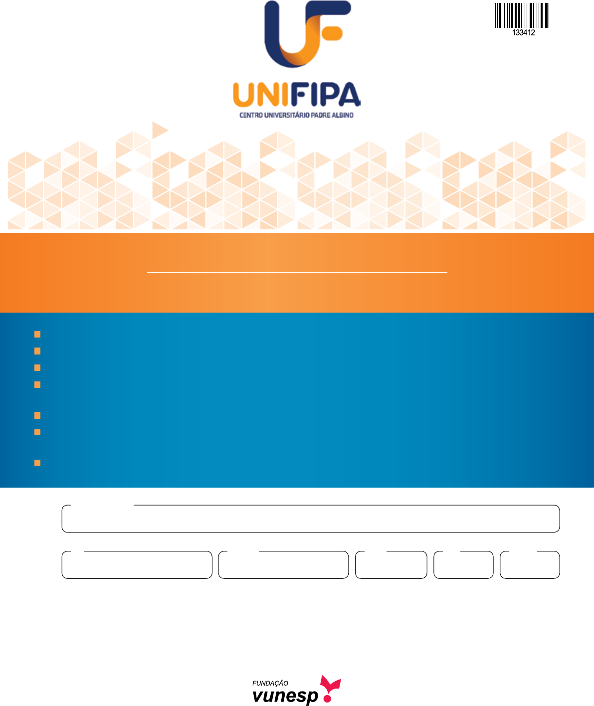 18.12.2018 Nome do candidato Prédio Sala CarteiraInscriçãoRG Confira seus dados impressos neste caderno. Assine com caneta de tinta preta a Folha de Respostas apenas no local indicado. Esta prova contém 86 questões objetivas. Para cada questão, o candidato deverá assinalar apenas uma alternativa na Folha de Respostas, utilizando caneta de tinta preta. Encontra-se neste caderno a Classificação Periódica, que poderá ser útil para a resolução de questões. Esta prova terá duração total de 4h e o candidato somente poderá sair do prédio depois de transcorridas 3h, con- tadas a partir do início da prova. Ao final da prova, antes de sair da sala, entregue ao fiscal a Folha de Respostas e o Caderno de Questões. PRoCESSo SElEtIvo vEStIbulAR | Medicina 2019 001. prova de conheciMentos gerais 2FMCA1801 | 001-ConhecGerais QUestÃo 01 Paulo possui um carro com computador de bordo que, a cada 2 segundos de funcionamento do motor, exibe na tela o consumo instantâneo e o consumo médio ocorrido durante o tempo em que o motor ficou ligado. O consumo médio é a média aritmética dos consumos instantâneos ocorridos. Em determinado dia, Paulo ligou o carro e observou o consumo médio em 14,1 km/L. Depois de alguns minutos, observou o consumo médio de 14,3 km/L. Com base nessas informa- ções, uma das possibilidades para o consumo médio, em km/L, considerando apenas o período entre essas duas observações, é (A) 14,8. (B) 13,3. (C) 14,0. (D) 12,8. (E) 11,7. QUestÃo 02 João tem em seu armário 5 camisas e 4 calças. Ele vai dar palestras em um congresso, e só pode levar 3 camisas e 2 calças em sua mala. O número de possibilidades para que ele componha sua mala é (A) 60. (B) 20. (C) 72. (D) 6. (E) 24. QUestÃo 03 Maria tem um dado com seis faces idênticas, sendo algumas brancas e outras pretas. Ao lançar tal dado, as pro- babilidades de se obter uma face branca e preta são , respectivamente. A expressão P(k brancas) = equi- vale à probabilidade da ocorrência de exatamente k faces brancas em n lançamentos desse dado. Maria vai lançar o dado quatro vezes. A probabilidade de que saiam exatamente três faces brancas está contida no intervalo (A) (B) (C) (D) (E) QUestÃo 04 Pedro participou de um seminário sobre Educação Financei- ra que orientou os participantes a dividir todo o dinheiro que recebem no mês em diferentes partes, cada uma reservada para uma finalidade específica. Depois de descontados todos os impostos, o salário líquido deveria ser dividido em: 10% para liberdade financeira; 10% para poupança; 10% para educação; 55% para necessidades; 10% para diversão; e 5% para doação. Em determinado mês, Pedro aplicou essa orientação, exatamente como ensinada no curso, e doou R$ 150,00. Tendo em vista que 25% de seu salário bruto foi descontado sob a forma de impostos, seu salário bruto foi de (A) R$ 3.800,00. (B) R$ 3.200,00. (C) R$ 4.000,00. (D) R$ 3.000,00. (E) R$ 3.400,00. QUestÃo 05 Seja a matriz quadrada A = (aij)2×2, de ordem 2, tal que, para todo i, j ∈ {1, 2}, . É dado que, ∀ x ∈ R, cos2 (x) + sen2 (x) = 1 e ∀ b > 0, b ≠ 1, logb (1) = 0. Nessas condições, o determinante da matriz inversa de A vale (A) (B) (C) (D) (E) QUestÃo 06 Um número complexo z = a + bi, quando multiplicado pelo complexo w = cos(φ) + i sen(φ), sofre uma rotação, no sentido anti-horário, de φ graus. O complexo t = 1 – i, que pertencia ao quarto quadrante, sofreu uma rotação e agora pertence ao terceiro quadrante. Dessa forma, uma das possibilidades para o complexo w que rotacionou o complexo t é (A) cos(150º) + i sen(150º). (B) cos(270º) + i sen(270º). (C) cos(83º) + i sen(83º). (D) cos(95º) + i sen(95º). (E) cos(180º) + i sen(180º). 3 FMCA1801 | 001-ConhecGerais QUestÃo 10 Um quadrado de lado m está inscrito em uma circunferên- cia. O comprimento dessa circunferência, em metros, vale (A) (B) (C) (D) (E) QUestÃo 11 Uma indústria de bebidas deseja trocar sua máquina de enchimento automático de garrafas e, para isso, solicitou, a diferentes fabricantes de máquinas amostras de garrafas cujos rótulos indicam volumes de 600mL. Após a análise das amostras, os dados foram registrados na tabela: Fabricante 1 (dados em mL) Fabricante 2 (dados em mL) Fabricante 3 (dados em mL) Fabricante 4 (dados em mL) Fabricante 5 (dados em mL) 606 608 600 601 595 600 602 600 599 606 594 598 590 600 594 600 592 610 600 605 Todos os fabricantes cumpriram o combinado e produziram amostras com média igual a 600 mL. Interessa para a indús- tria a máquina que apresenta menor variância com relação aos volumes, ou seja, a que tem o menor afastamento abso- luto dos dados em relação ao valor médio. Assim, a máquina escolhida foi a do fabricante (A) 4. (B) 2. (C) 5. (D) 1. (E) 3. QUestÃo 07 Considere a função real f: ] 0, + ∞ [ R, tal que f(x) = log(x). Com base nessas informações, é correto afirmar que (A) (B) (C) (D) (E) QUestÃo 08 Assinale a alternativa correta em relação ao polinômio Q(x) = (x2018 + 1)2 + 2018. (A) Q(x) representa uma função que possui inversa. (B) Q(– a) = – Q(a), ∀ a ∈ . (C) O gráfico de Q(x) passa na origem do plano cartesiano. (D) Q(0) vale 2019. (E) Q(x) possui 2018 raízes. QUestÃo 09 Os comprimentos da aresta de um cubo e do raio de uma esfera medem, respectivamente, s e r. Sabe-se que s, r, nes- sa ordem, são termos consecutivos de uma progressão geo- métrica decrescente. Sejam VCUBO = s 3, o volume do cubo e VESF = , o volume da esfera. Considerando que os dois sólidos possuem volumes iguais, a razão dessa progressão é igual a (A) (B) (C) (D) (E) 4FMCA1801 | 001-ConhecGerais QUestÃo 14 Na tirinha, Mig refere-se a uma doença humana parasitária. (http://algotaodoceeducacao.blogspot.com.br) O questionamento feito por Mig considera o fato de essa doença ser causada por (A) larvas de nematelmintos presentes na areia, que podem penetrar a pele humana. (B) cistos de protozoários, que pode